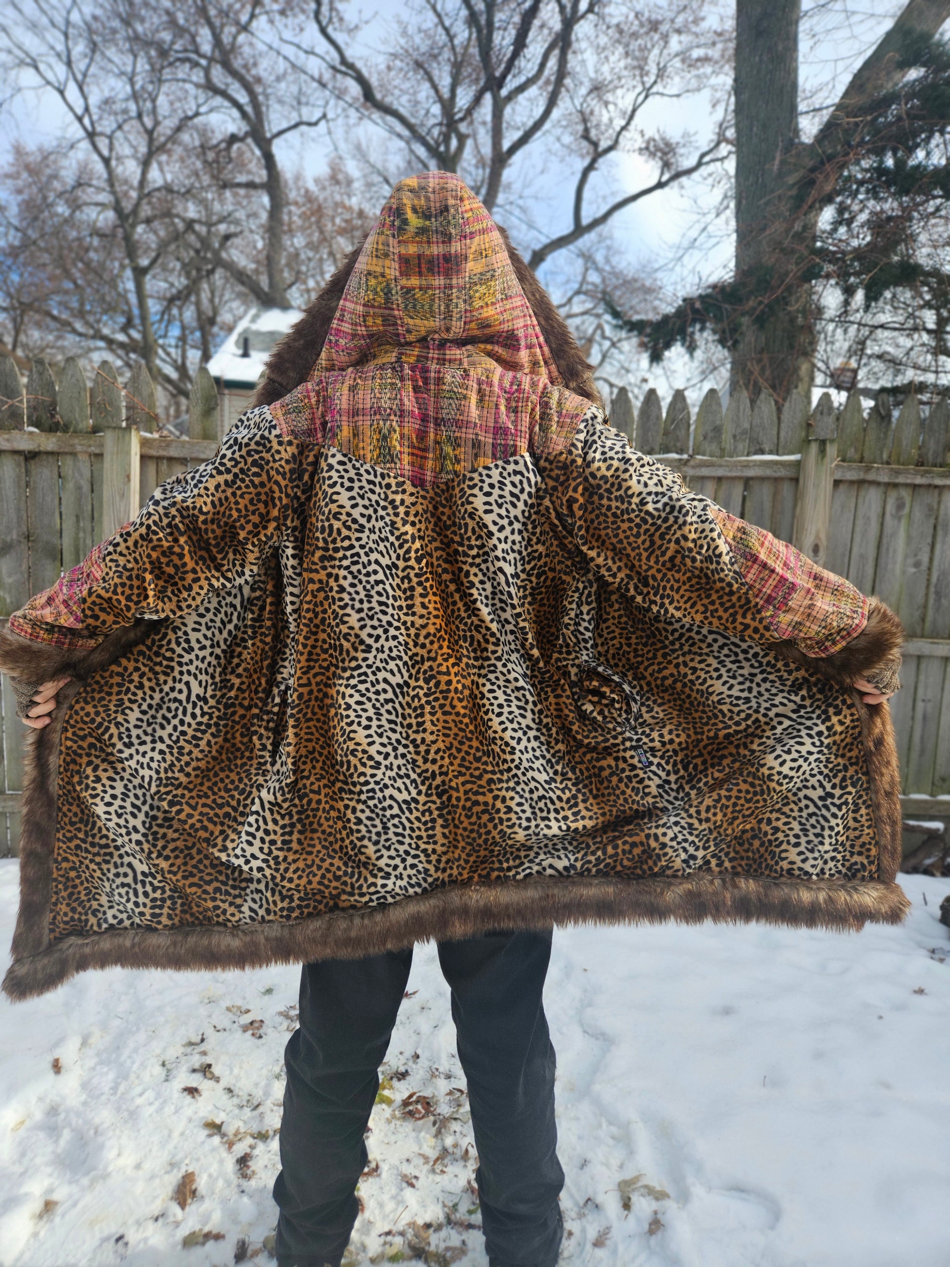 Liberate your journey and Funk up your Vibe with the latest Cheetah Cloak by Moksha Moda. This one-of-a-kind wearable work of art is ethically crafted in Guatemala by the team of Moksha Moda. Textiles included in this cheetah cloak are beautiful upcycled fabrics from traditional hand-woven cotton Mayan skirts sourced from second-hand markets in Guatemala, wild short hair soft cheetah faux fur, luxurious long faux fur, and sherpa fleece for the lining.  The cloak includes three pockets including an inside zipper pocket, wo front coconut buttons, and has a wild faux fur hood.