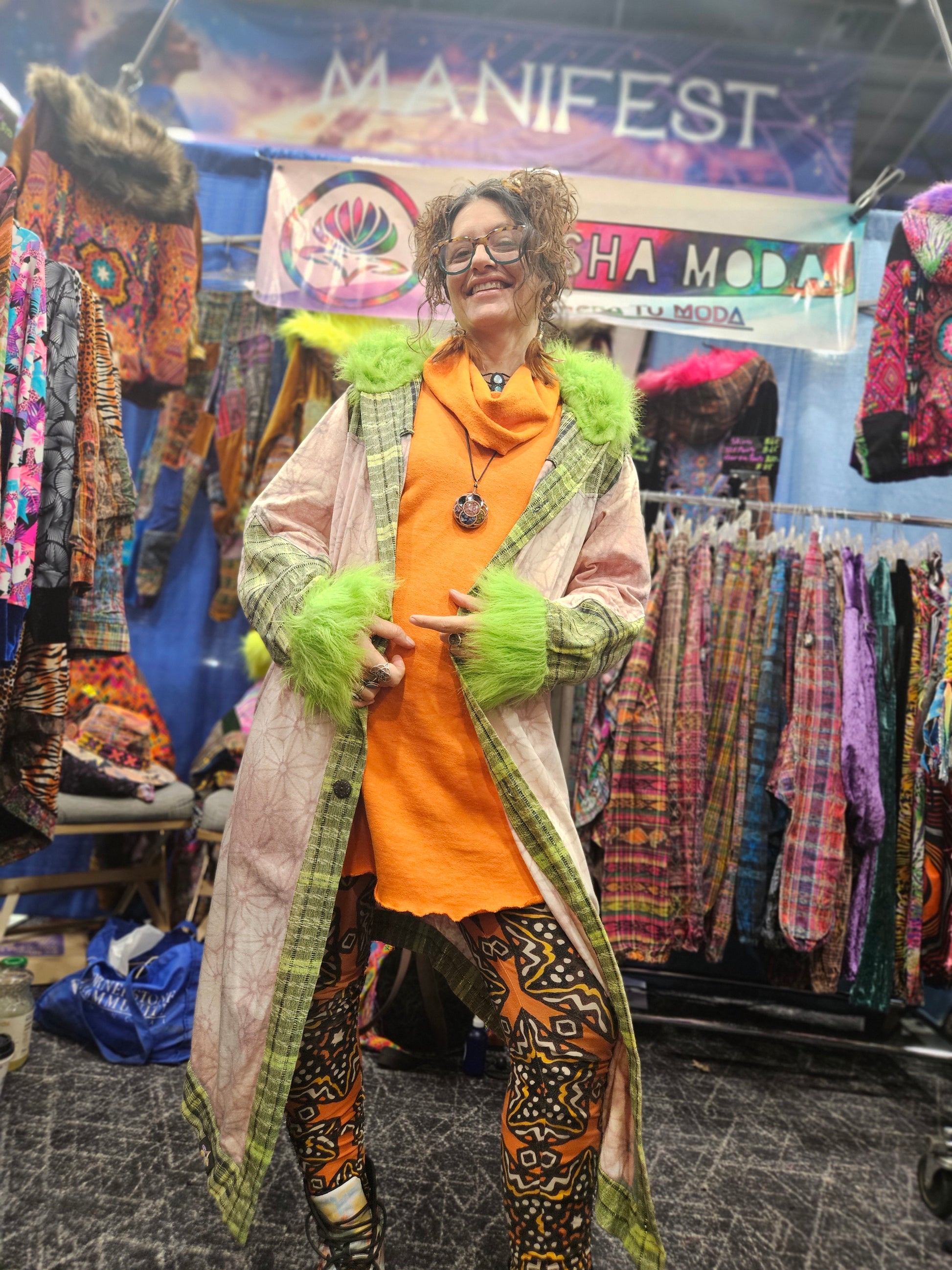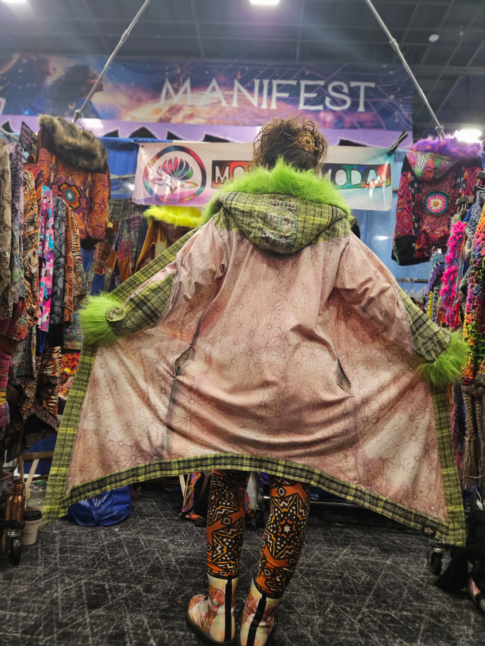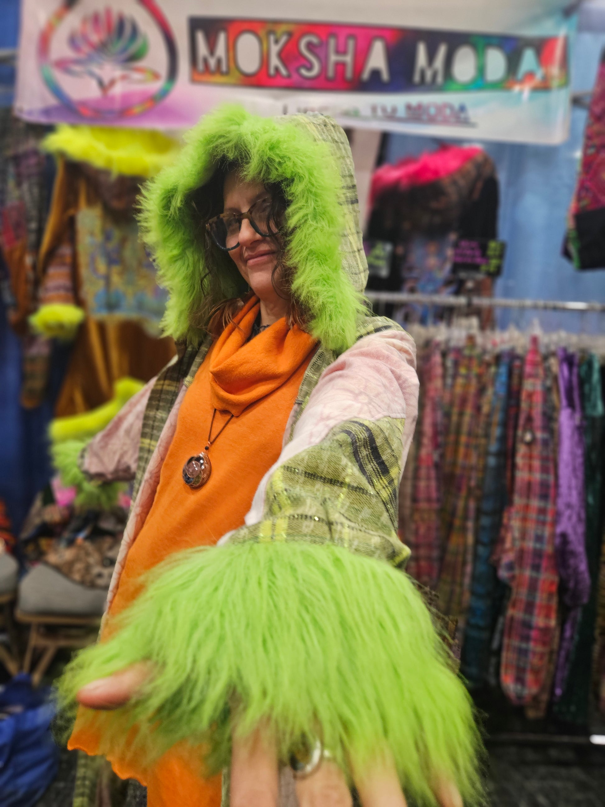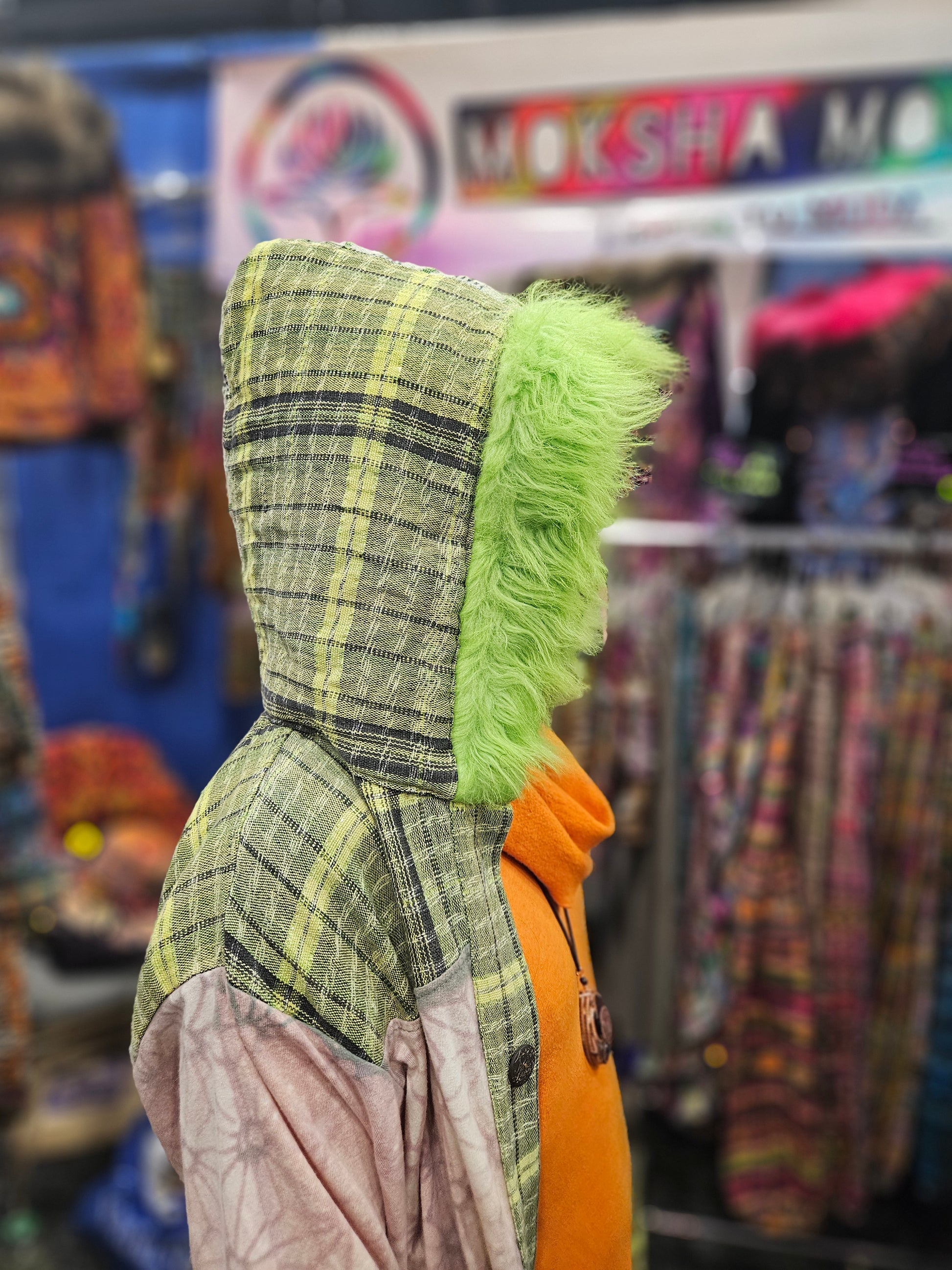 Funk up Your Vibe & Liberate Your Fashion with this super heady one of a kind collab cloaks by Moksha Moda & Jenzified Designs. The cloak is ethically crafted with beautiful upcycled hand woven Mayan fabrics from Guatemala for the detail, luxurious faux fur, and super soft breathable jersey that is then shipped to Jenzified Designs in Maine for her to hand bleach stencil each cloak. This one of a kind unisex cloak also features three coconut buttons and two pockets.