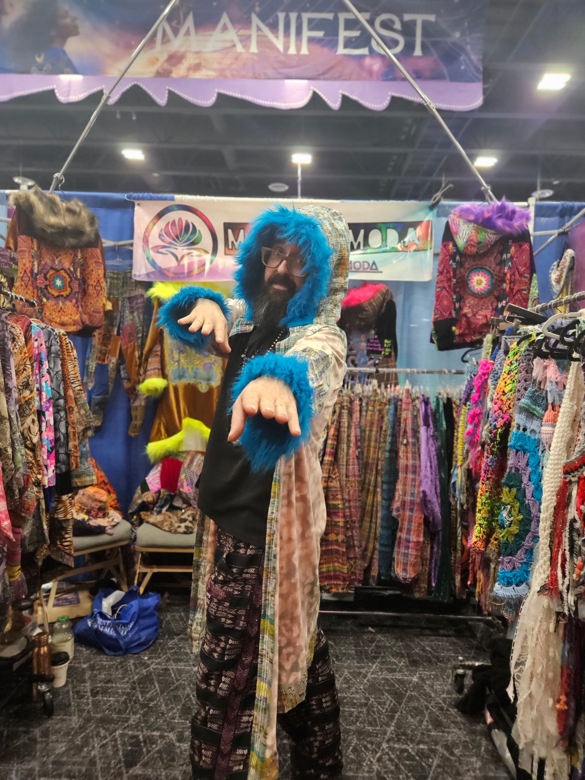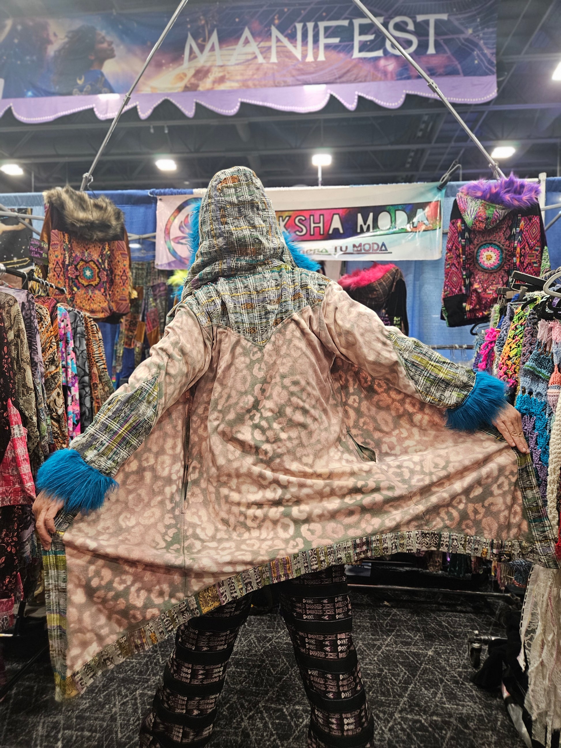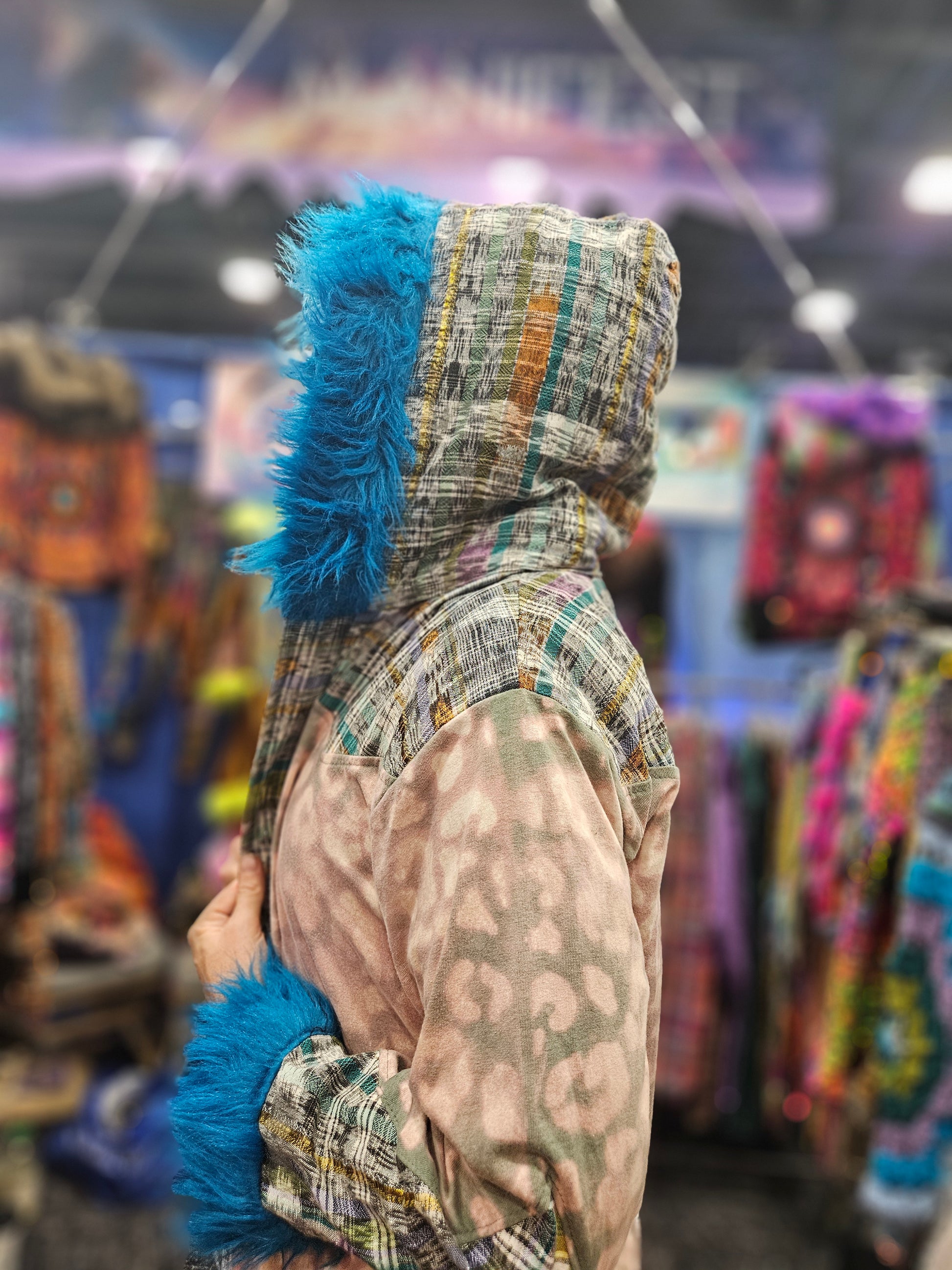 Funk up Your Vibe & Liberate Your Fashion with this super heady one of a kind collab cloaks by Moksha Moda & Jenzified Designs. The cloak is ethically crafted with beautiful upcycled hand woven Mayan fabrics from Guatemala for the detail, luxurious faux fur, and super soft breathable jersey that is then shipped to Jenzified Designs in Maine for her to hand bleach stencil each cloak. This one of a kind unisex cloak also features three coconut buttons and two pockets.