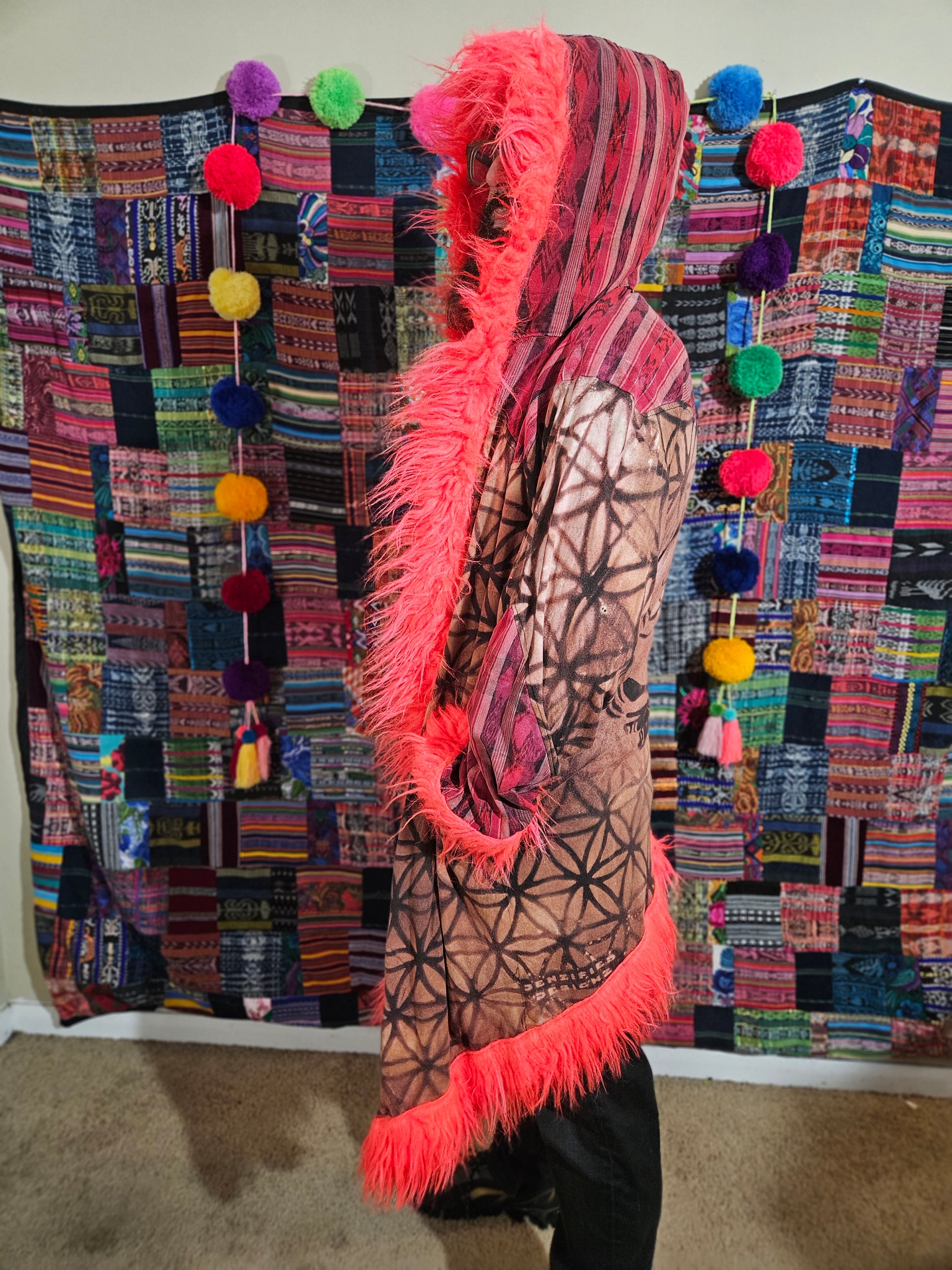 Funk up Your Vibe & Liberate Your Fashion with this super heady one of a kind collab cloak by Moksha Moda & Jenzified Designs. The cloak is ethically crafted with beautiful upcycled hand woven Mayan fabrics from Guatemala for the detail, luxurious faux fur, and super soft breathable jersey that is then shipped to Jenzified Designs in Maine for her to hand bleach stencil each cloak. This one of a kind unisex cloak also features two pockets.
