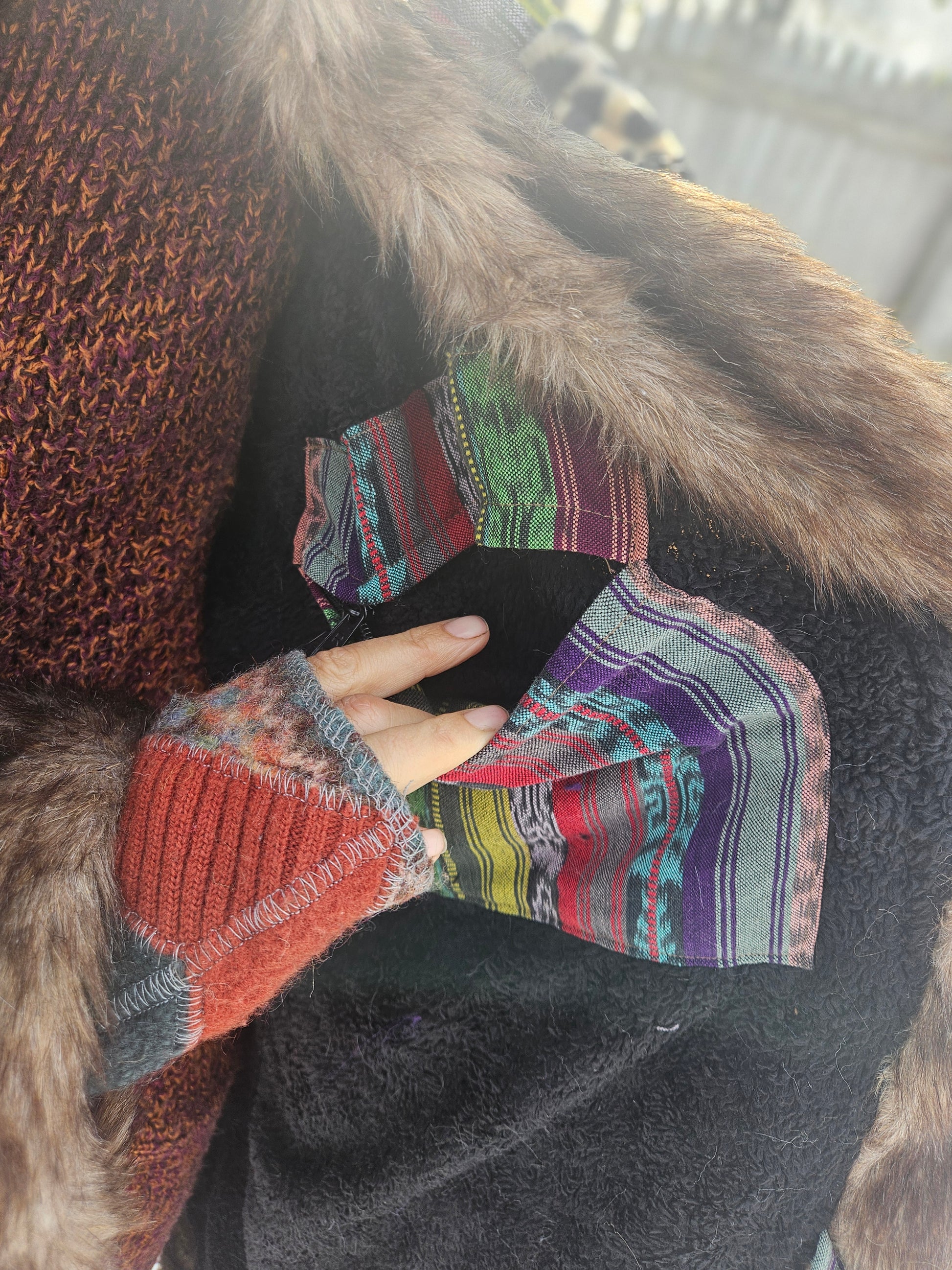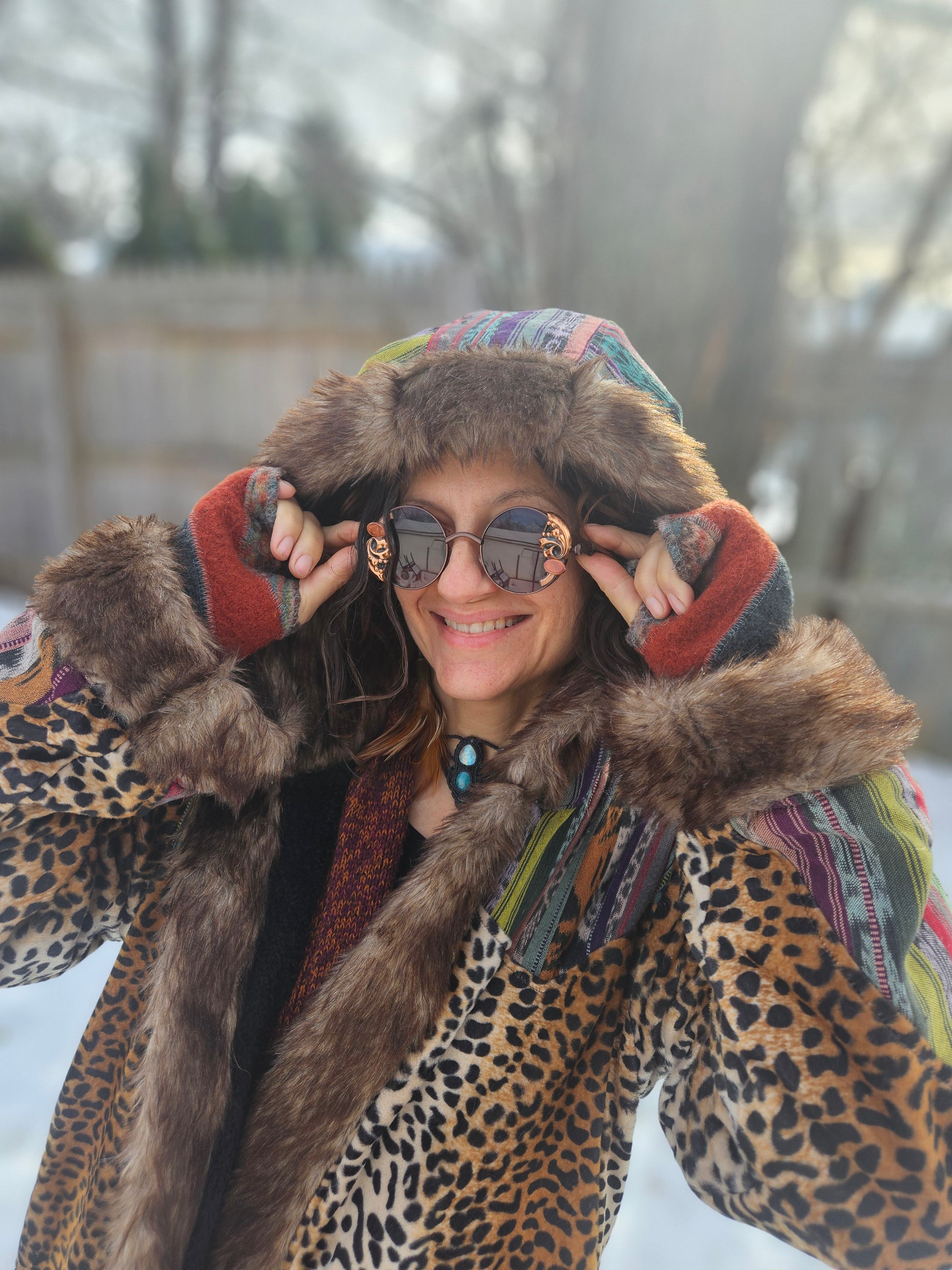 Liberate your journey and Funk up your Vibe with the latest Cheetah Cloak by Moksha Moda. This one-of-a-kind wearable work of art is ethically crafted in Guatemala by the team of Moksha Moda. Textiles included in this cheetah cloak are beautiful upcycled fabrics from traditional hand-woven cotton Mayan skirts sourced from second-hand markets in Guatemala, wild short hair soft cheetah faux fur, luxurious long faux fur, and sherpa fleece for the lining. The cloak includes three pockets including an inside zipper pocket, wo front coconut buttons, and has a wild faux fur hood.