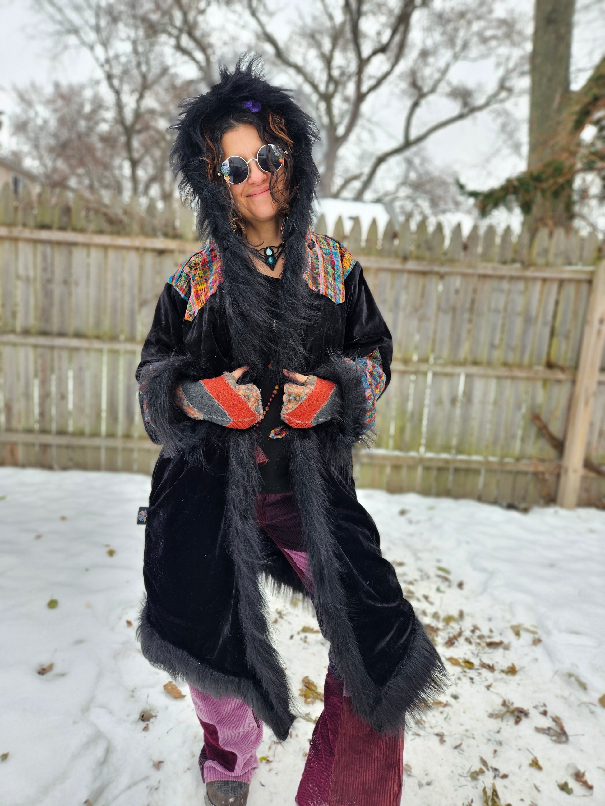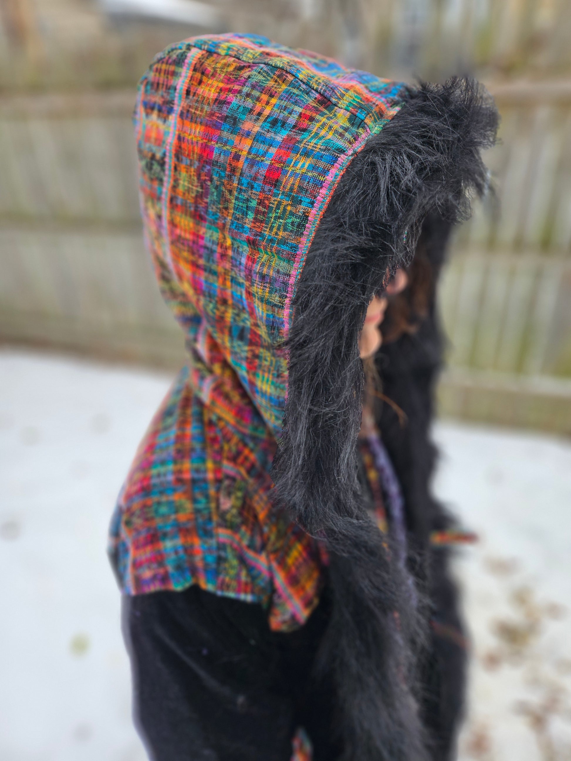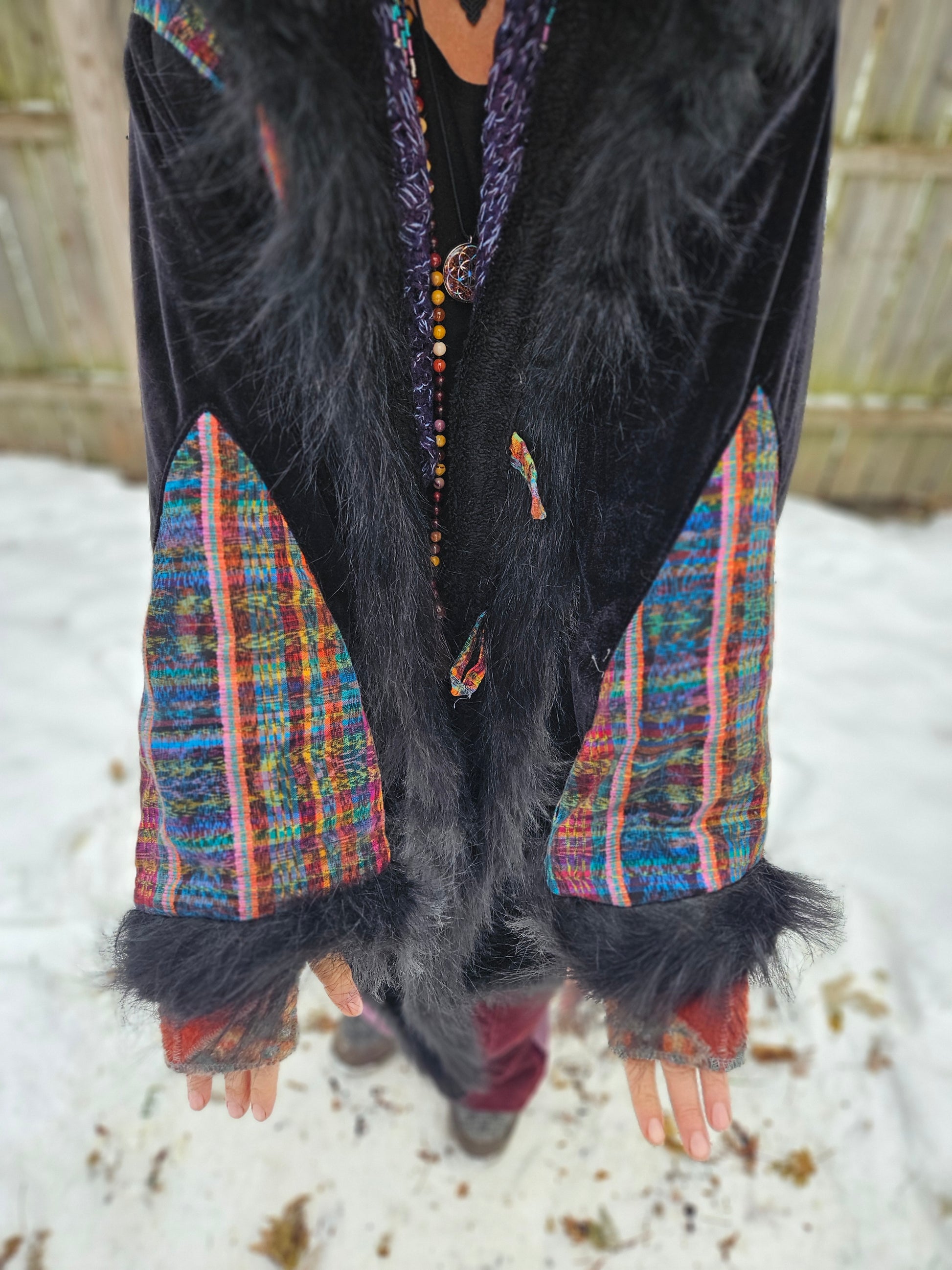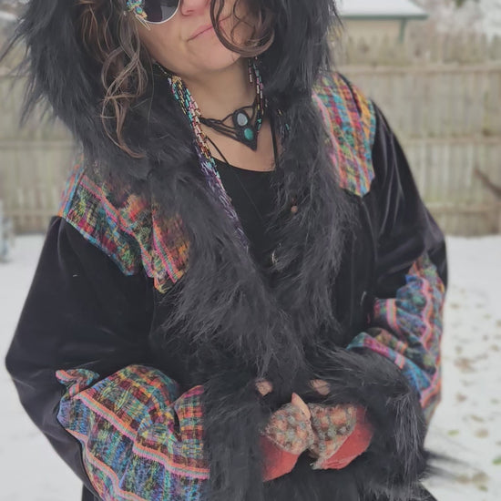 Liberate your journey and Funk up your Vibe with the latest Cloak by Moksha Moda. This one-of-a-kind wearable work of art is ethically crafted in Guatemala by the team of Moksha Moda. Textiles included in this cloak are beautiful upcycled fabrics from traditional hand-woven cotton Mayan skirts sourced from second-hand markets in Guatemala, elegant velvet, luxurious long faux fur, and sherpa fleece for the lining. The cloak includes three pockets including an inside zipper pocket, wo front coconut buttons, and has a wild faux fur hood.