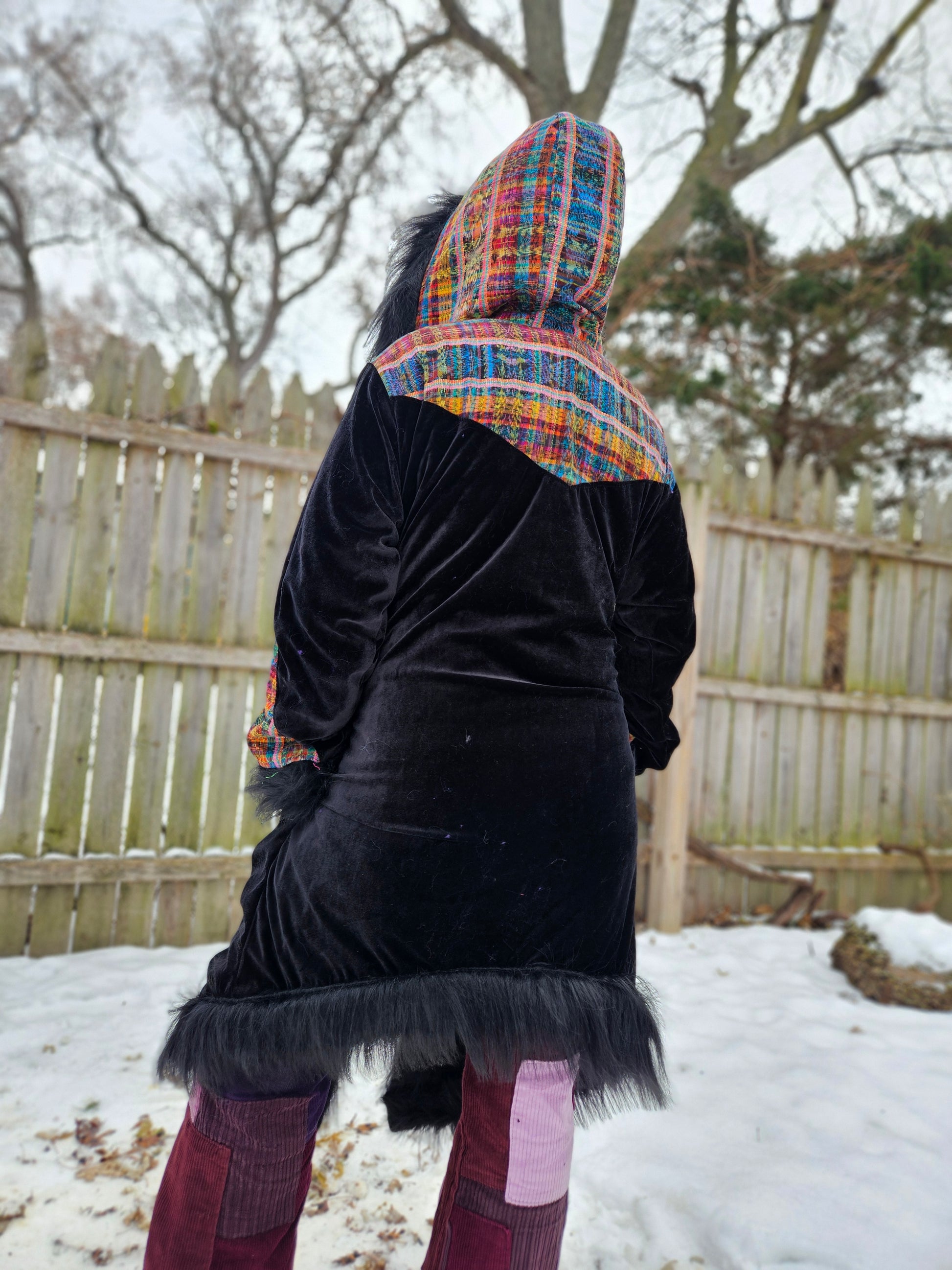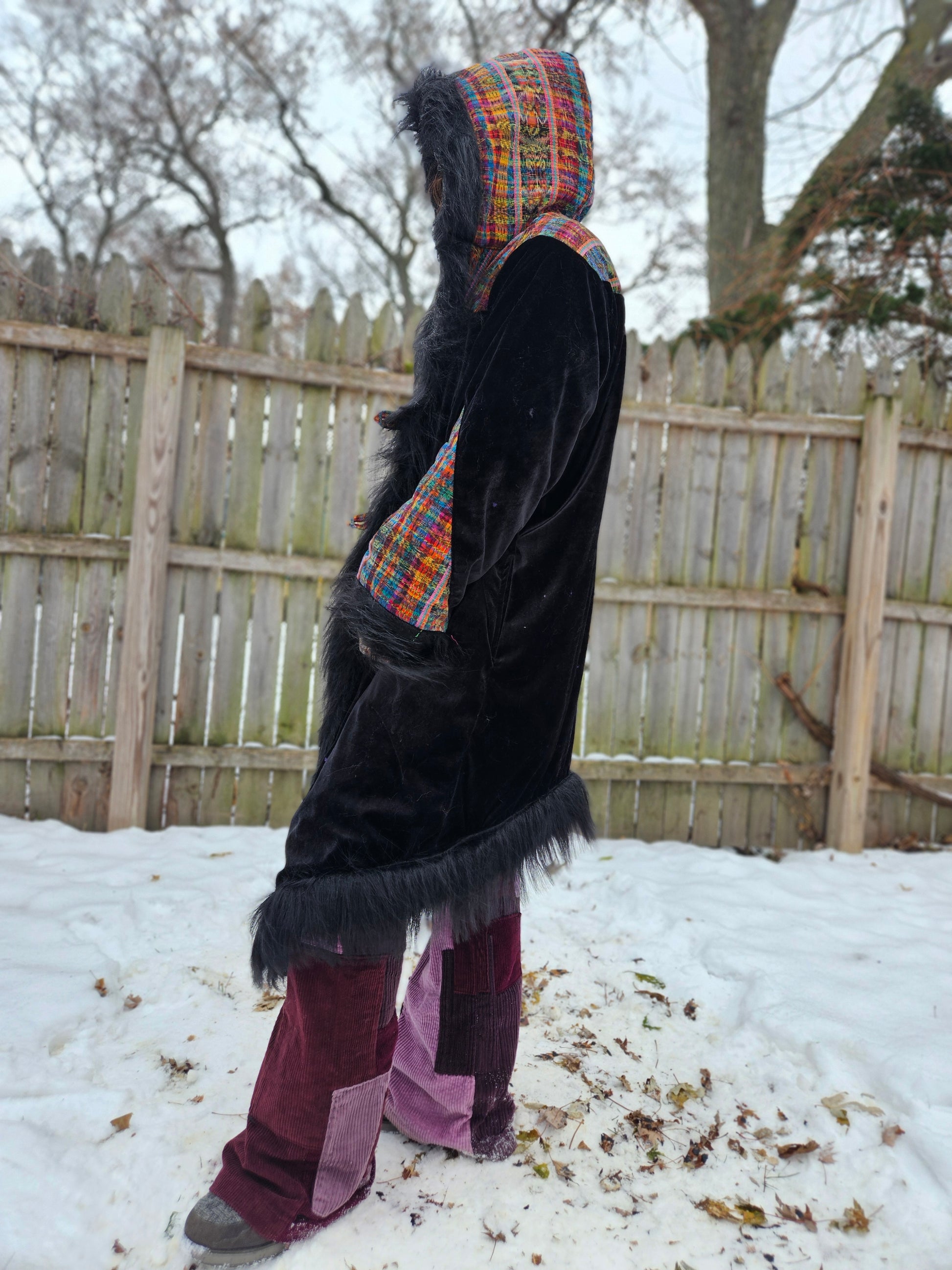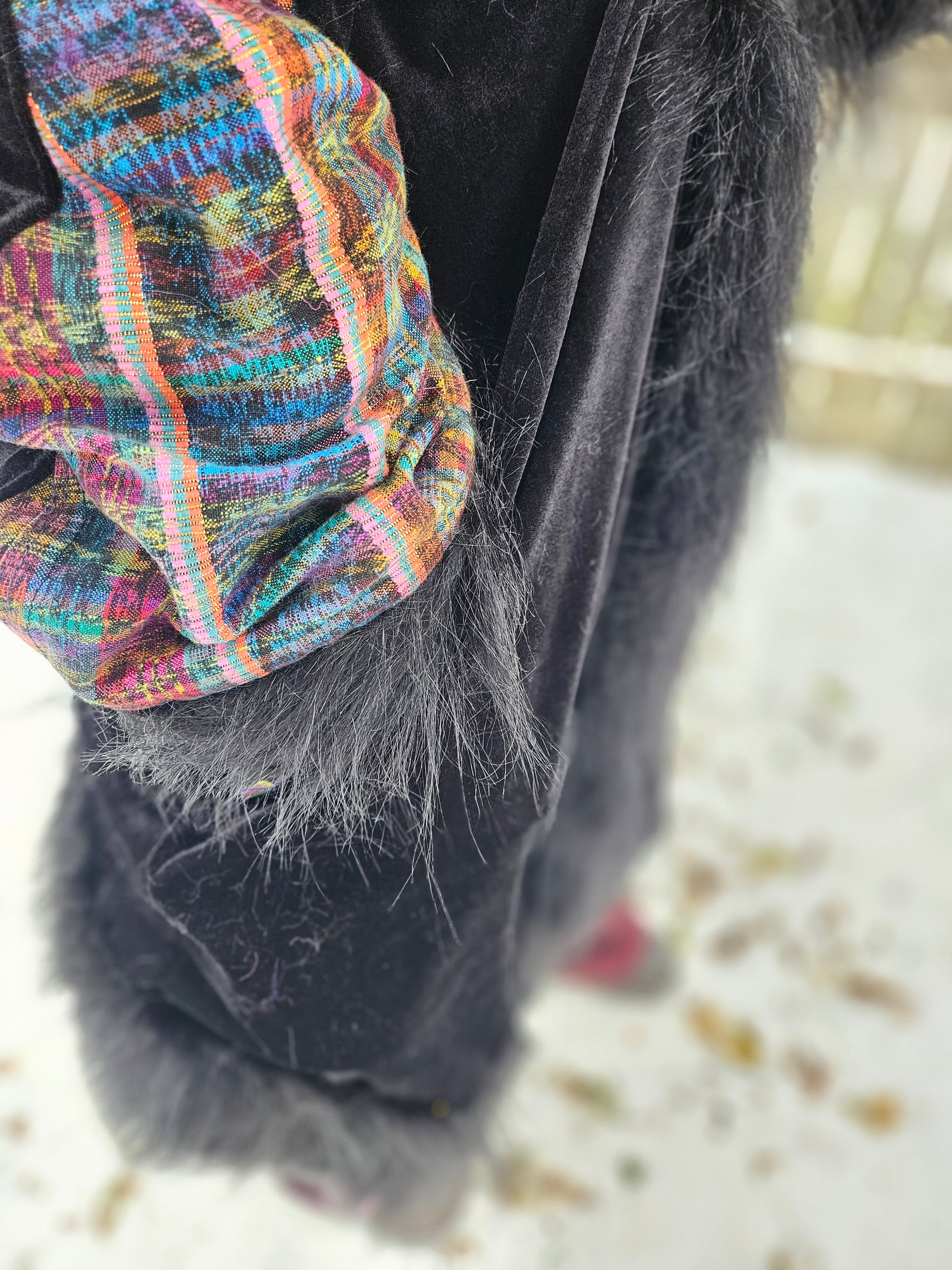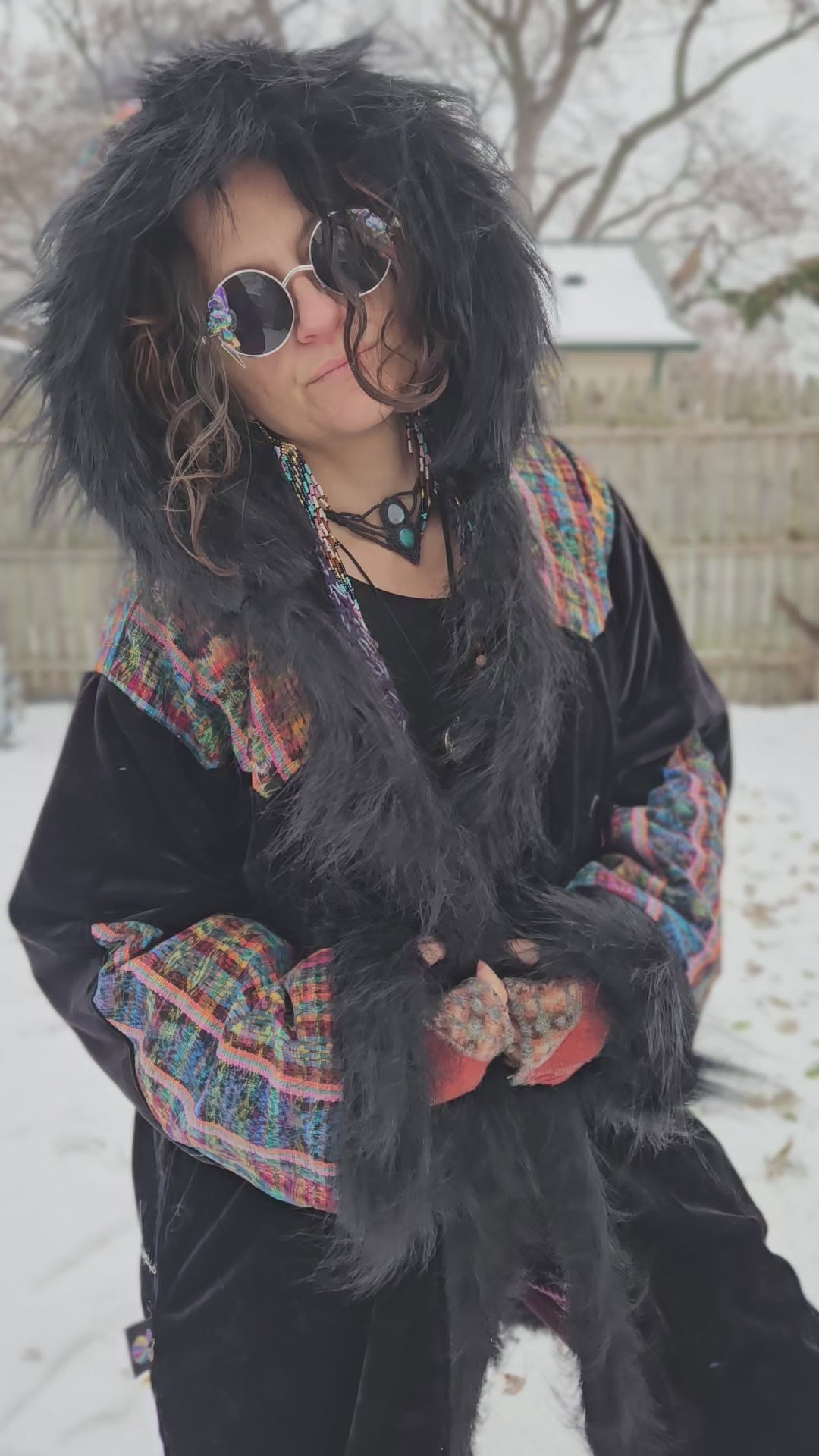 Liberate your journey and Funk up your Vibe with the latest Cloak by Moksha Moda. This one-of-a-kind wearable work of art is ethically crafted in Guatemala by the team of Moksha Moda. Textiles included in this cloak are beautiful upcycled fabrics from traditional hand-woven cotton Mayan skirts sourced from second-hand markets in Guatemala, elegant velvet, luxurious long faux fur, and sherpa fleece for the lining. The cloak includes three pockets including an inside zipper pocket, wo front coconut buttons, and has a wild faux fur hood.