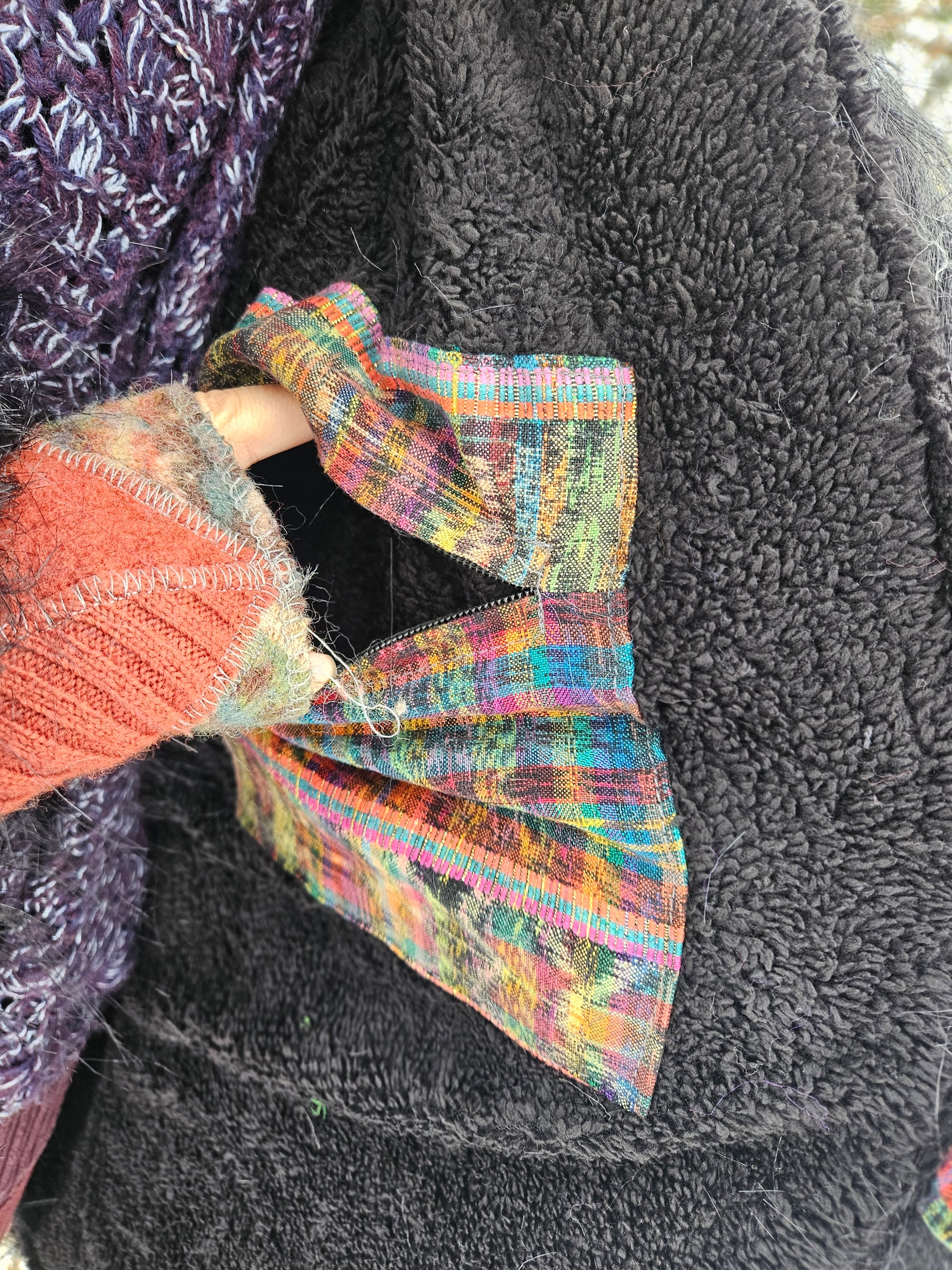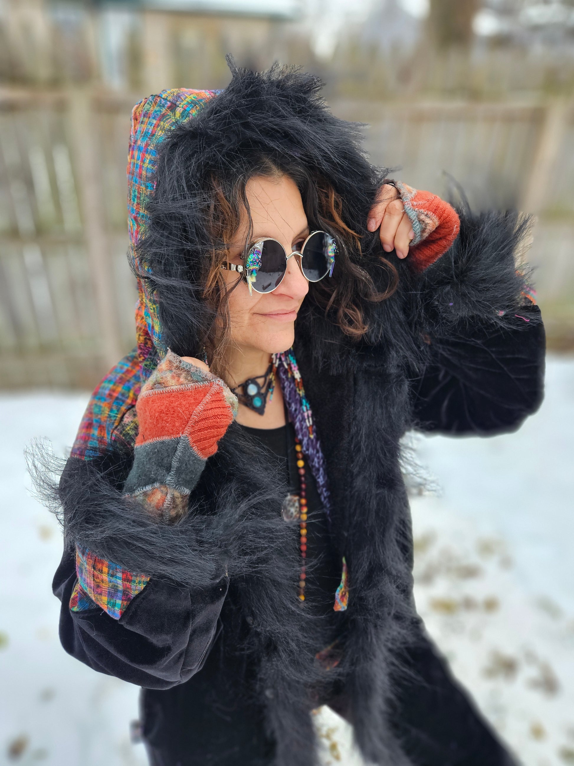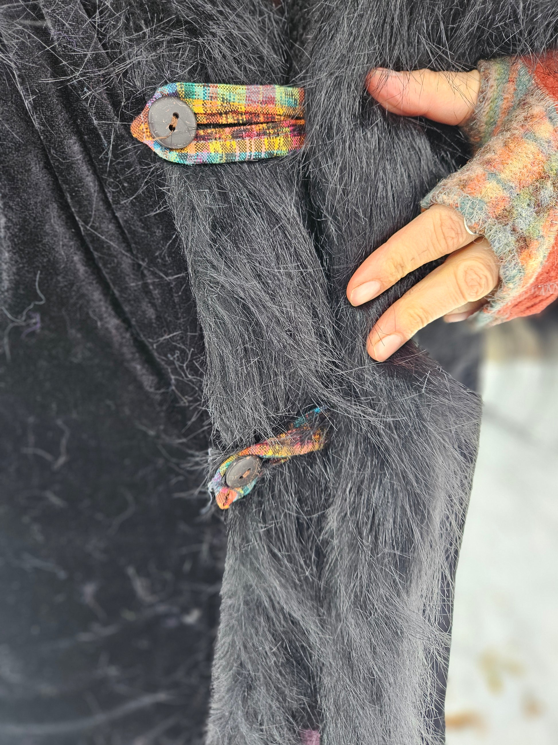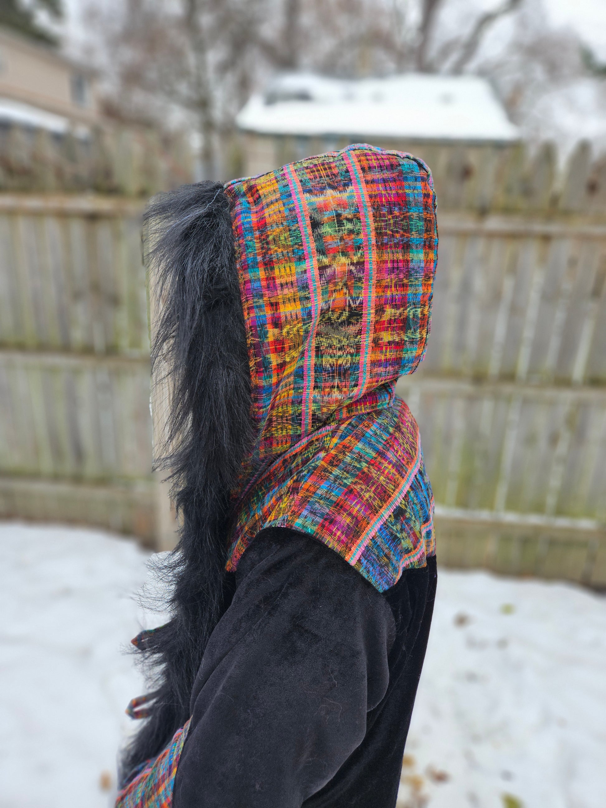 Liberate your journey and Funk up your Vibe with the latest Cloak by Moksha Moda. This one-of-a-kind wearable work of art is ethically crafted in Guatemala by the team of Moksha Moda. Textiles included in this cloak are beautiful upcycled fabrics from traditional hand-woven cotton Mayan skirts sourced from second-hand markets in Guatemala, elegant velvet, luxurious long faux fur, and sherpa fleece for the lining. The cloak includes three pockets including an inside zipper pocket, wo front coconut buttons, and has a wild faux fur hood.