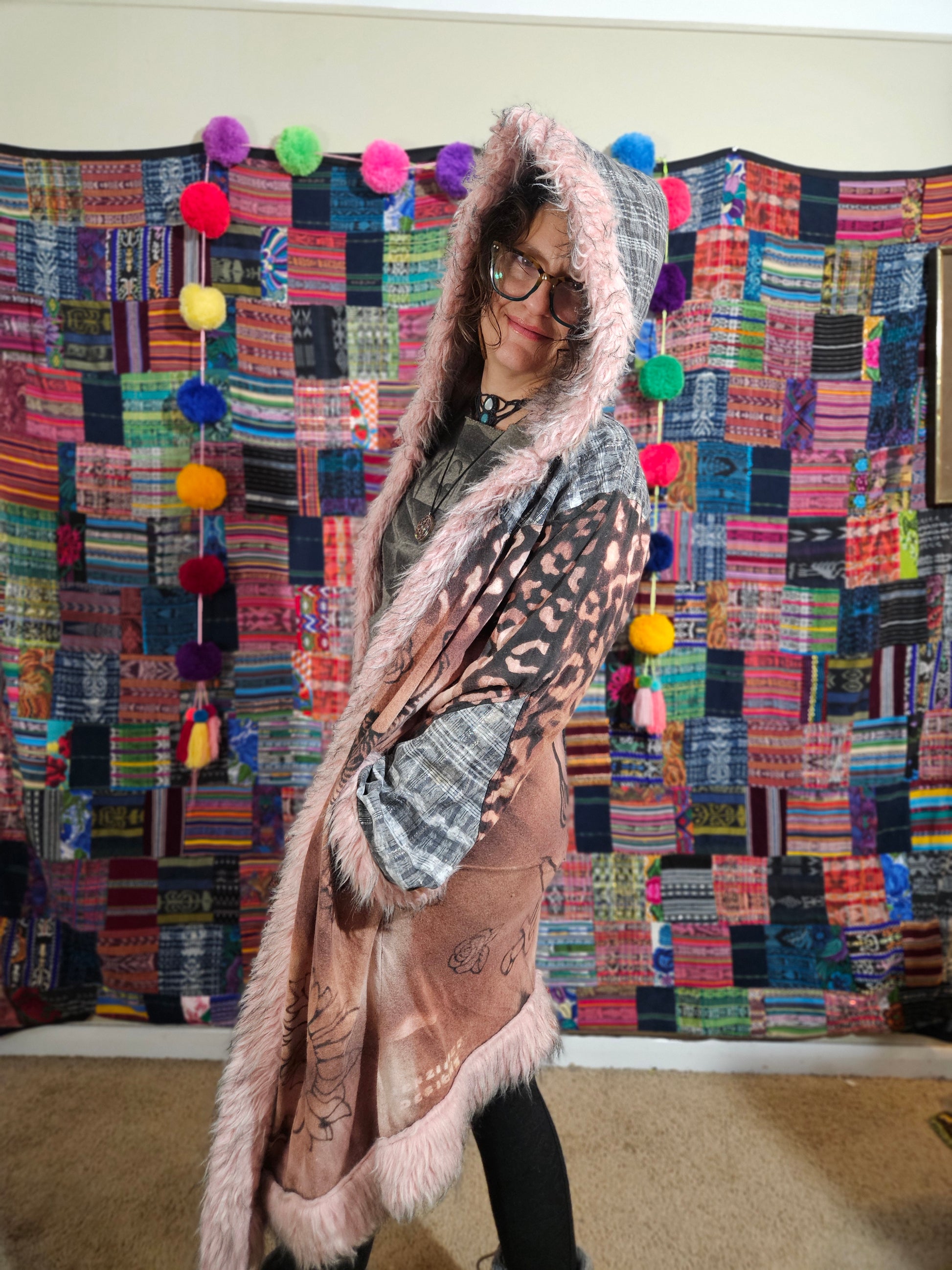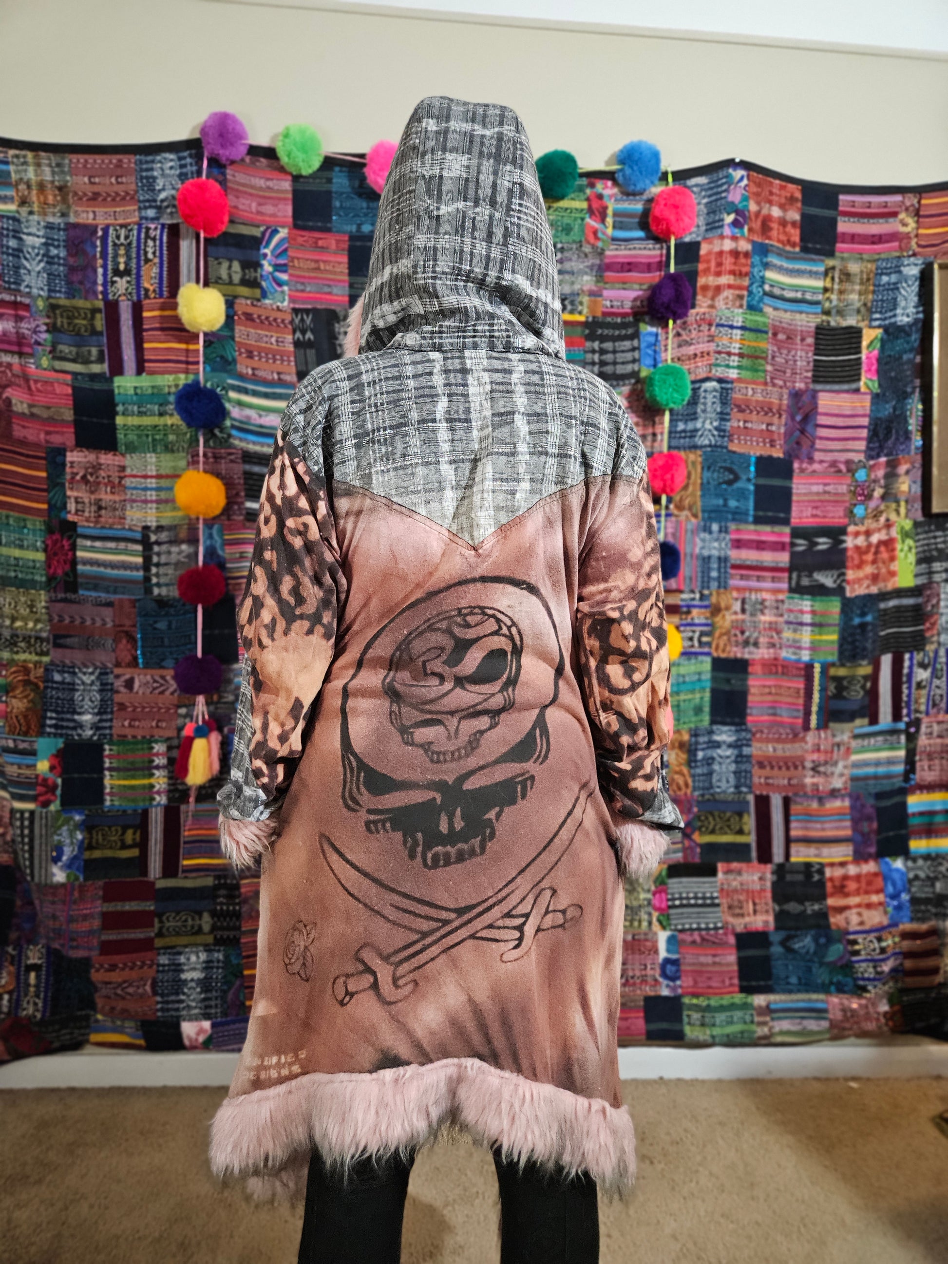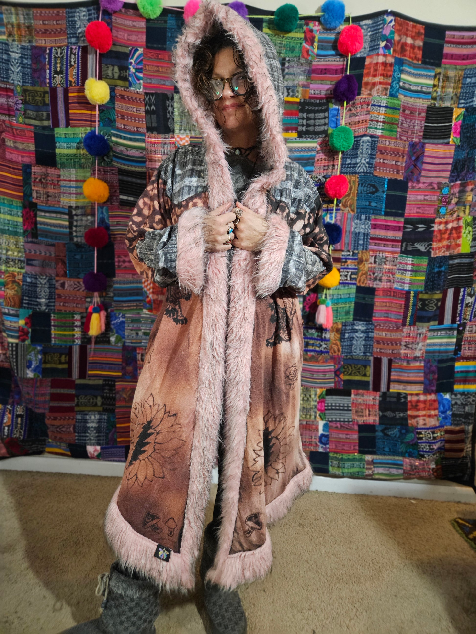 Funk up Your Vibe & Liberate Your Fashion with this super heady one of a kind collab cloak by Moksha Moda & Jenzified Designs. The cloak is ethically crafted with beautiful upcycled hand woven Mayan fabrics from Guatemala for the detail, luxurious faux fur, and super soft breathable jersey that is then shipped to Jenzified Designs in Maine for her to hand bleach stencil each cloak. This one of a kind unisex cloak also features two pockets.