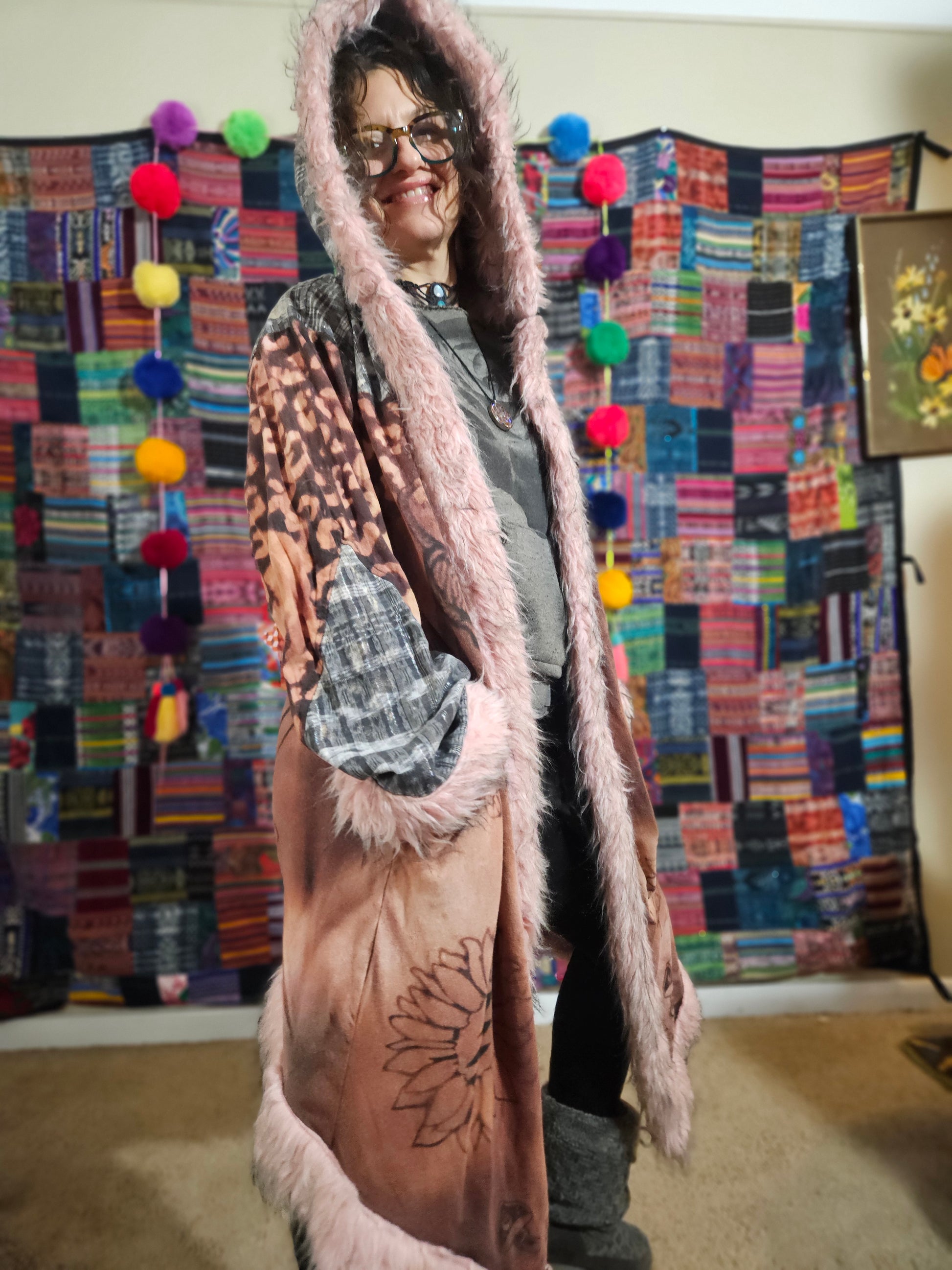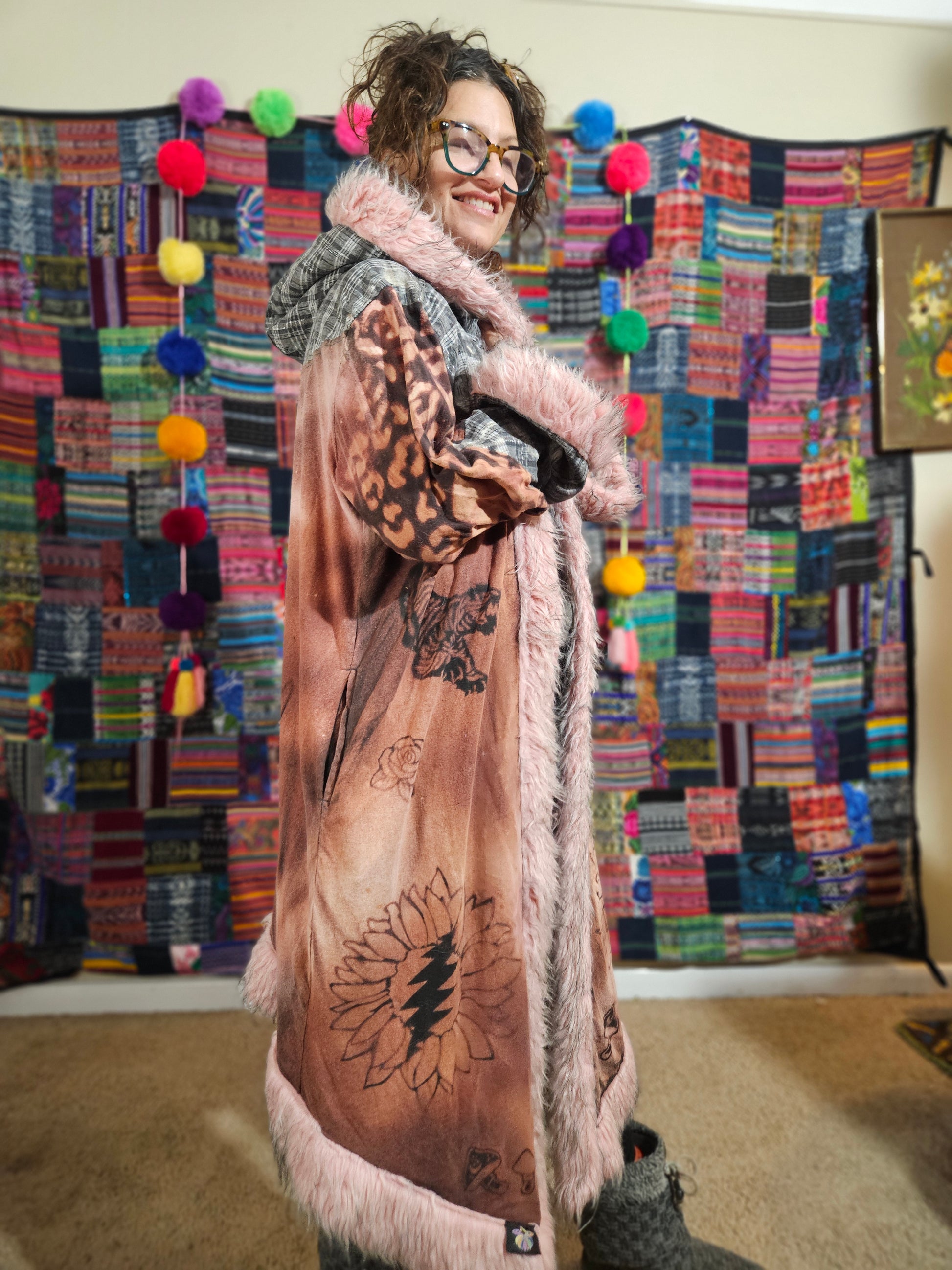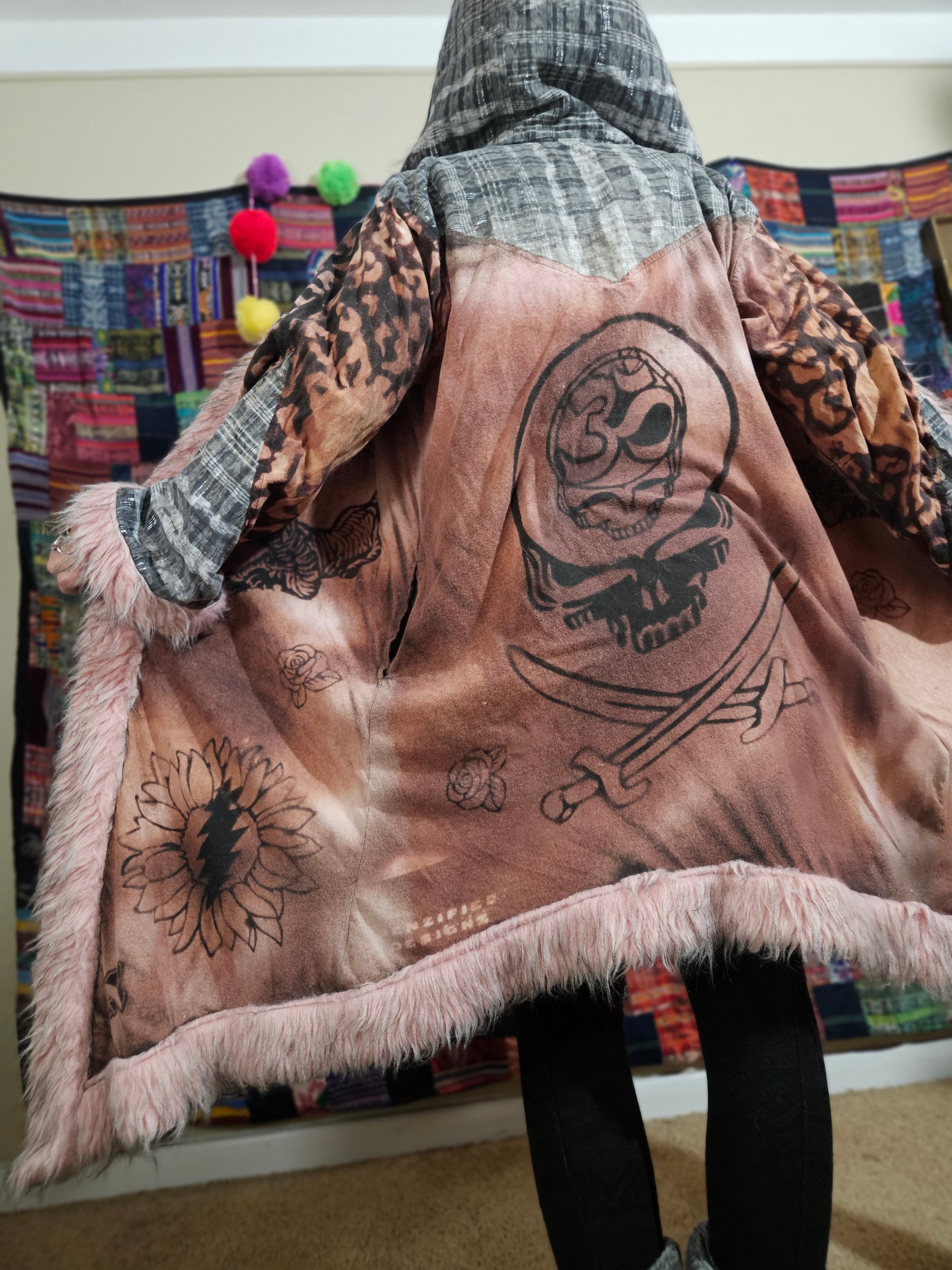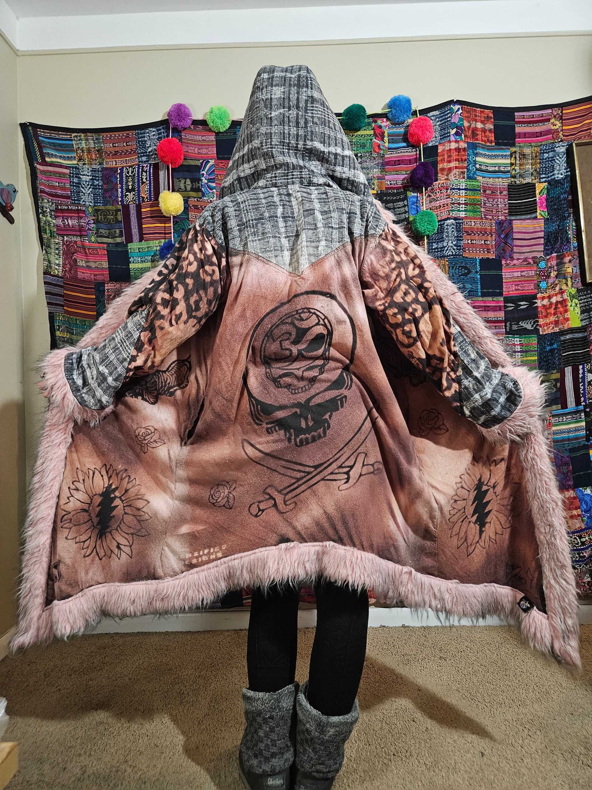 Funk up Your Vibe & Liberate Your Fashion with this super heady one of a kind collab cloak by Moksha Moda & Jenzified Designs. The cloak is ethically crafted with beautiful upcycled hand woven Mayan fabrics from Guatemala for the detail, luxurious faux fur, and super soft breathable jersey that is then shipped to Jenzified Designs in Maine for her to hand bleach stencil each cloak. This one of a kind unisex cloak also features two pockets.