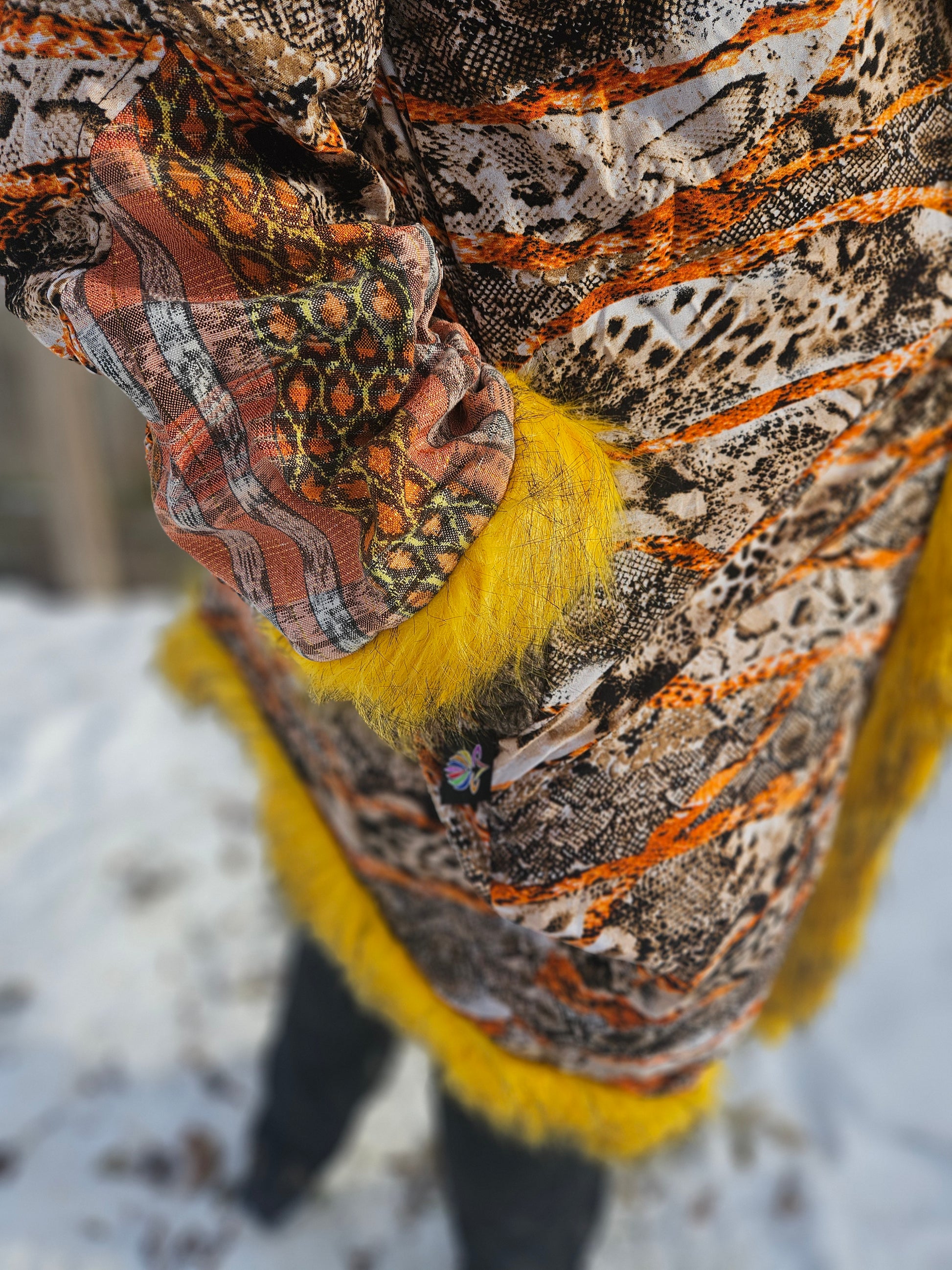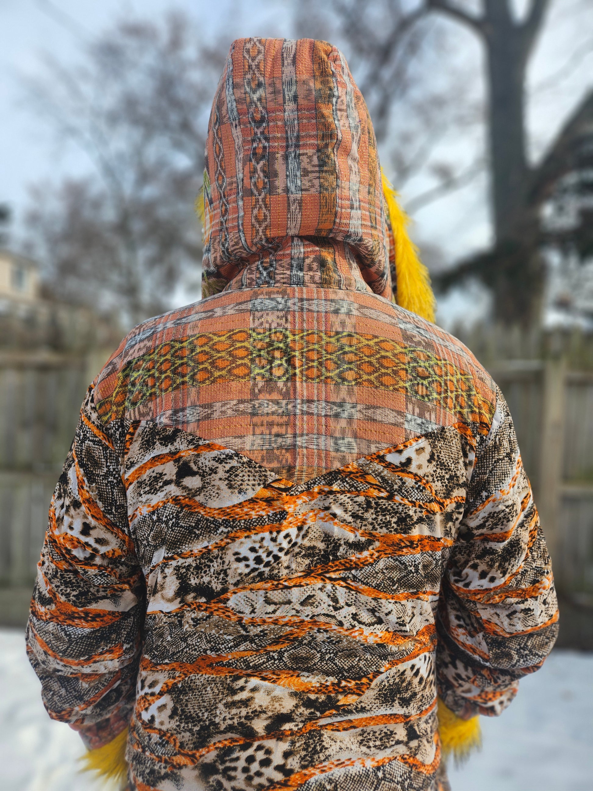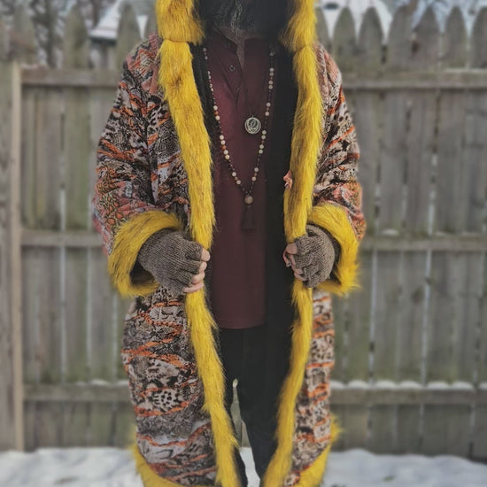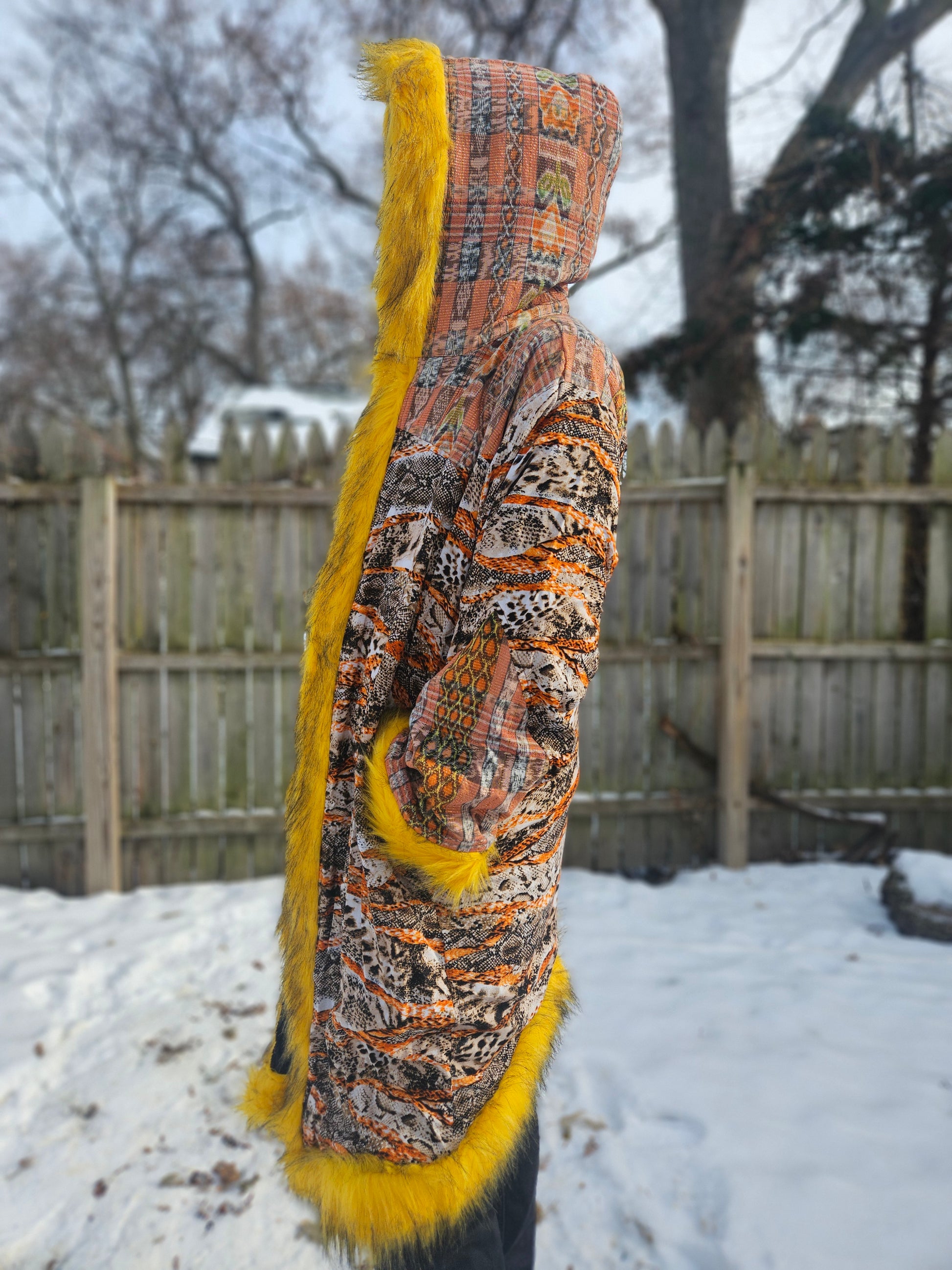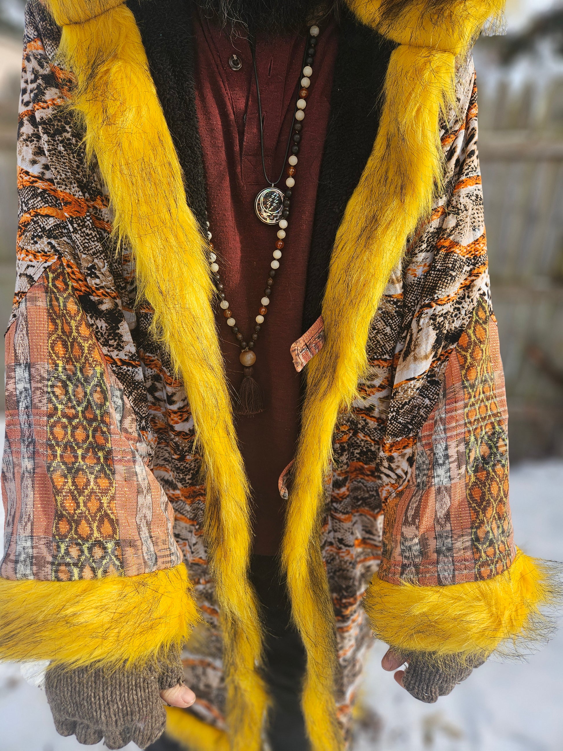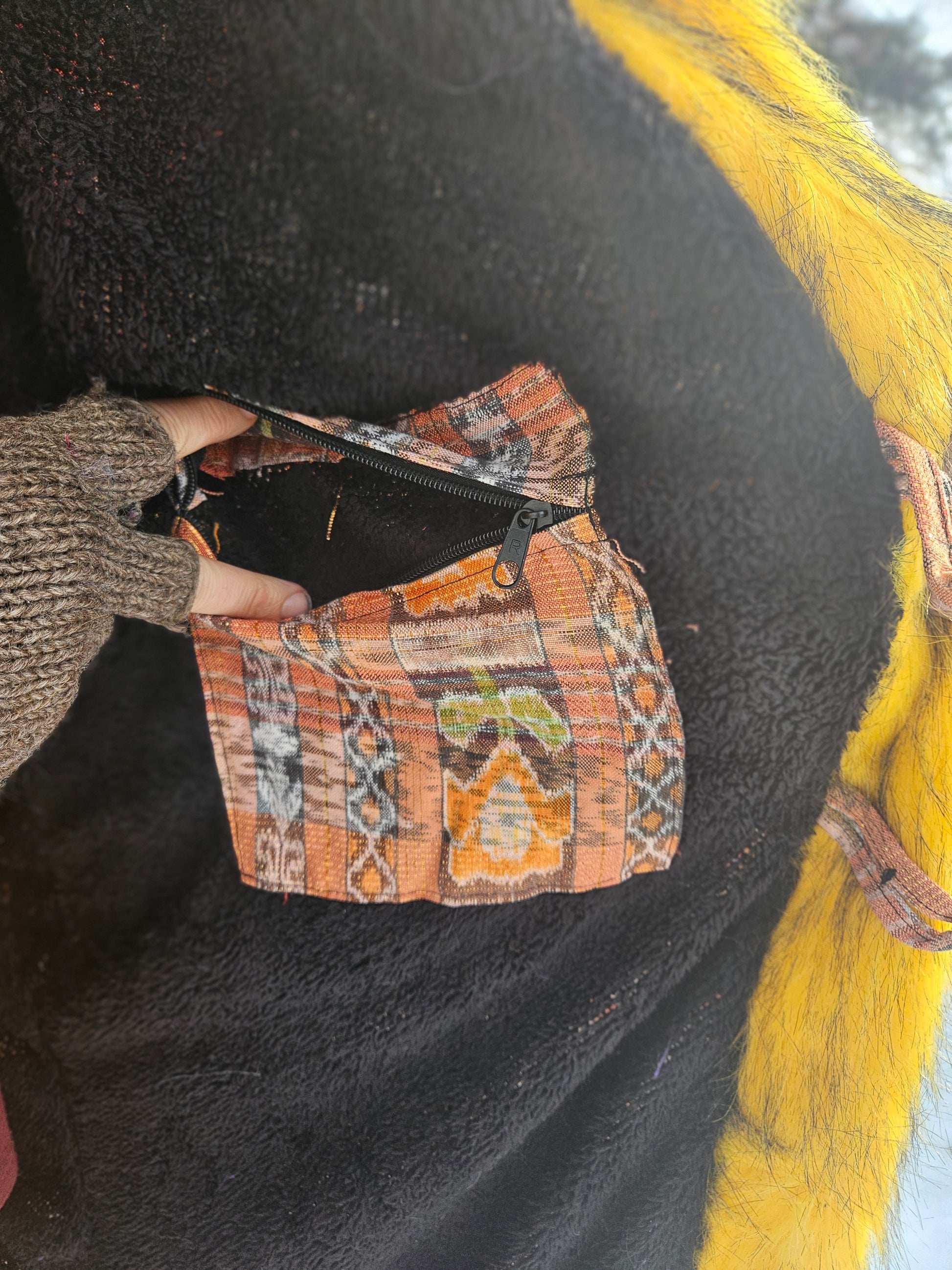 Liberate your journey and Funk up your Vibe with the latest Cloak by Moksha Moda. This one-of-a-kind wearable work of art is ethically crafted in Guatemala by the team of Moksha Moda. Textiles included in this cloak are beautiful upcycled fabrics from traditional hand-woven cotton Mayan skirts sourced from second-hand markets in Guatemala, wild polyester print, luxurious long faux fur, and sherpa fleece for the lining. The cloak includes three pockets including an inside zipper pocket, wo front coconut buttons, and has a wild faux fur hood.