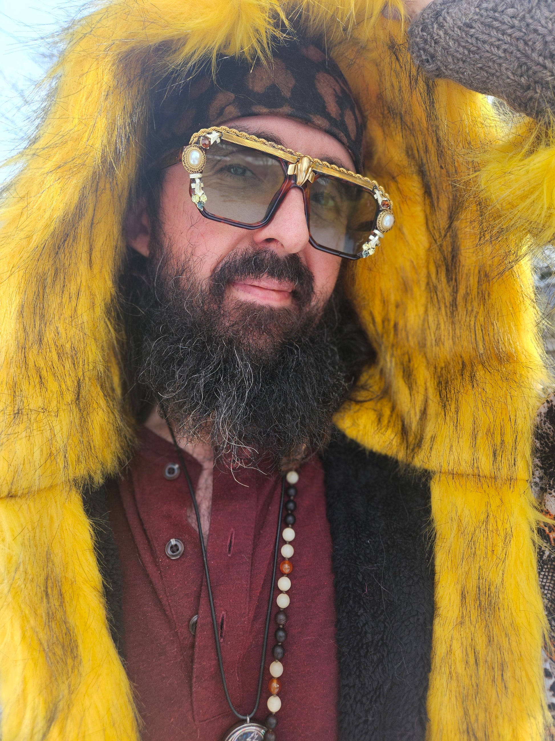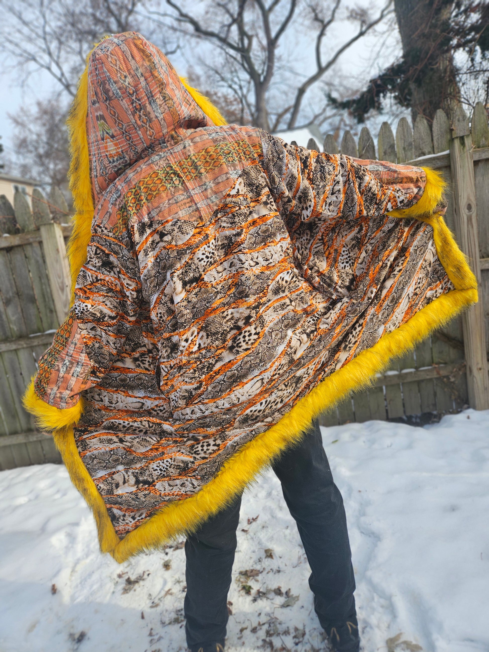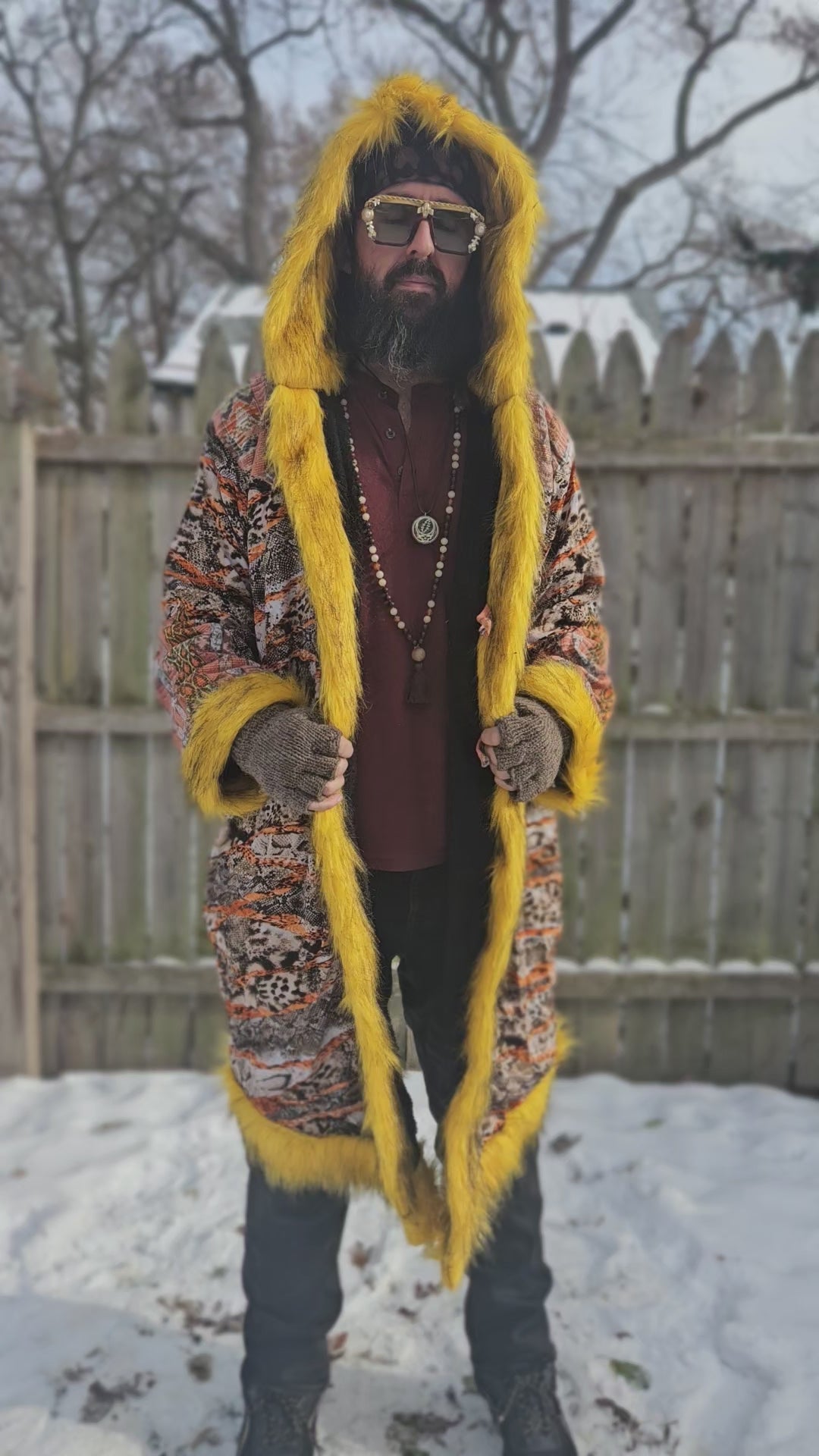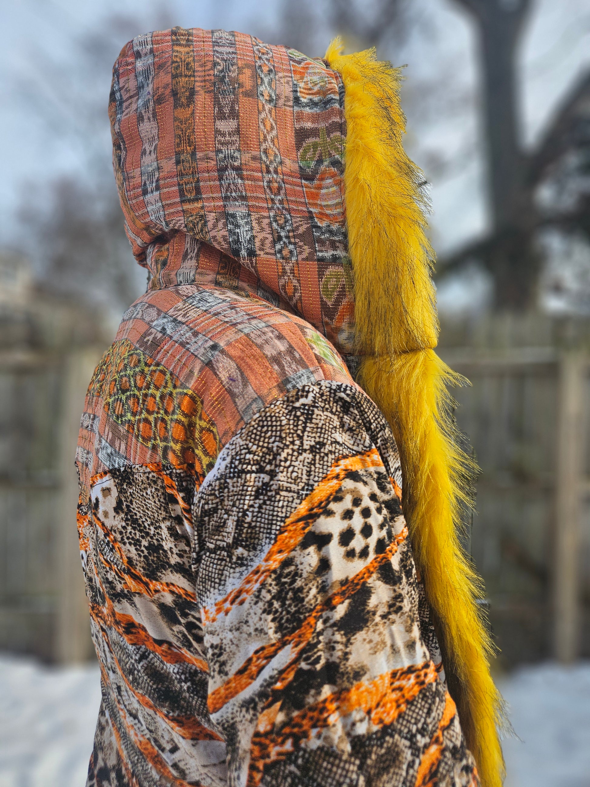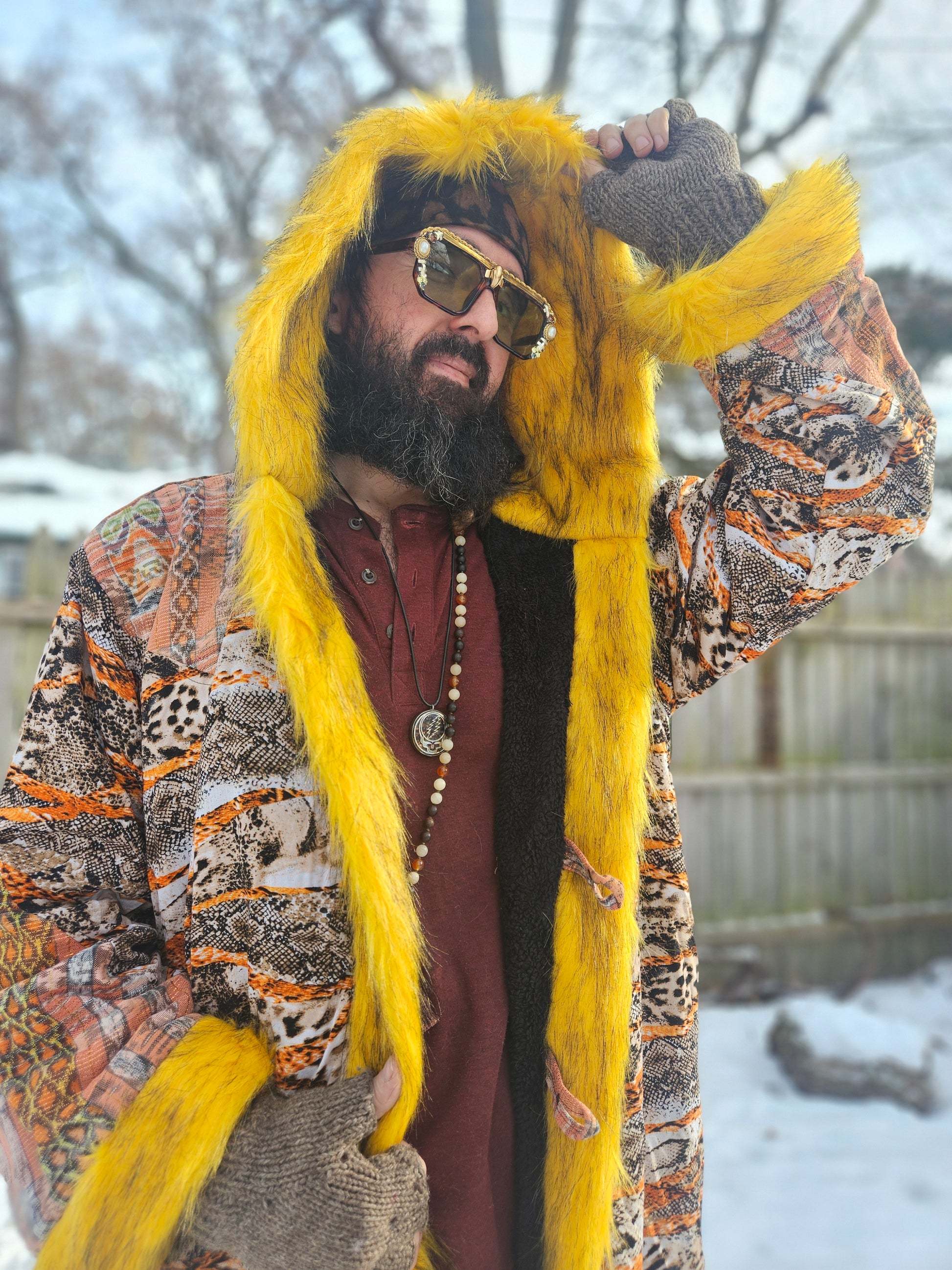 Liberate your journey and Funk up your Vibe with the latest Cloak by Moksha Moda. This one-of-a-kind wearable work of art is ethically crafted in Guatemala by the team of Moksha Moda. Textiles included in this cloak are beautiful upcycled fabrics from traditional hand-woven cotton Mayan skirts sourced from second-hand markets in Guatemala, wild polyester print, luxurious long faux fur, and sherpa fleece for the lining. The cloak includes three pockets including an inside zipper pocket, wo front coconut buttons, and has a wild faux fur hood.