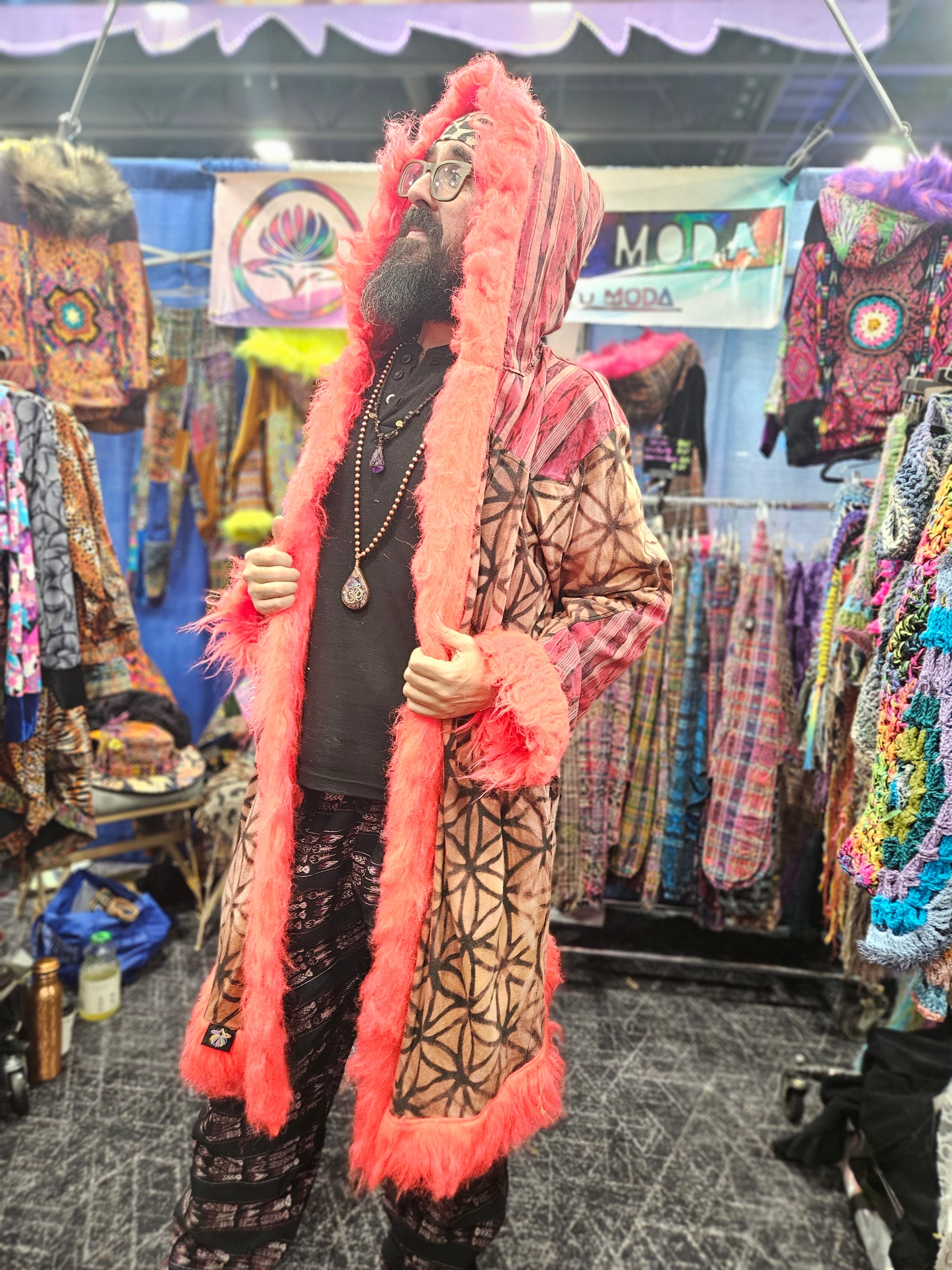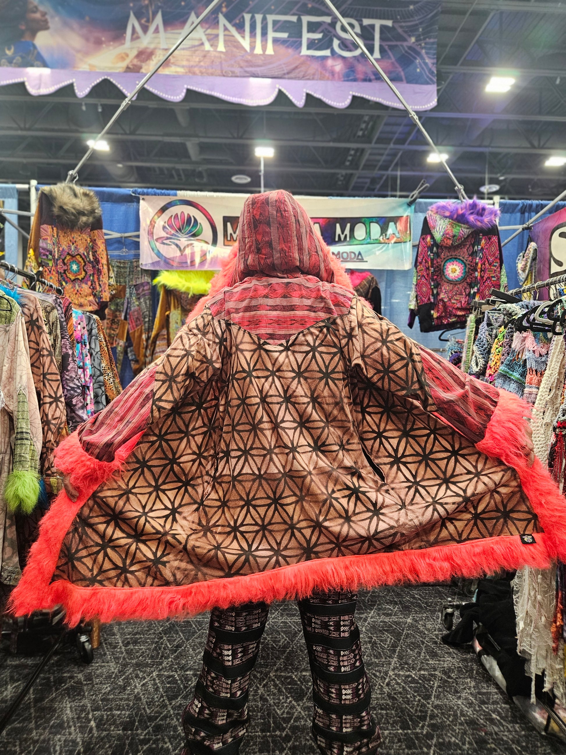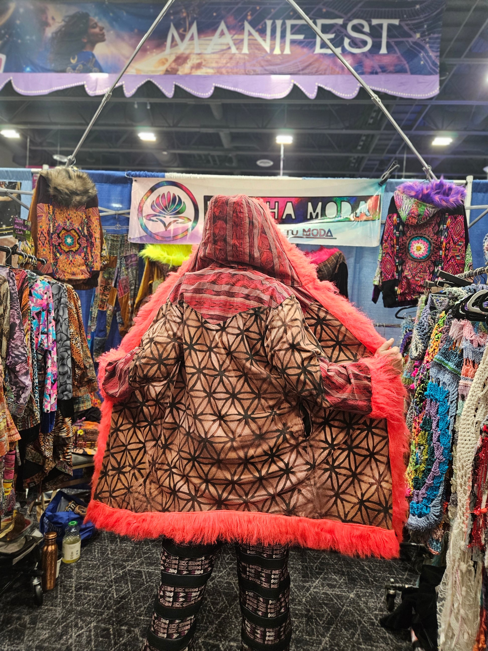 Funk up Your Vibe & Liberate Your Fashion with this super heady one of a kind collab cloaks by Moksha Moda & Jenzified Designs. The cloak is ethically crafted with beautiful upcycled hand woven Mayan fabrics from Guatemala for the detail, luxurious faux fur, and super soft breathable jersey that is then shipped to Jenzified Designs in Maine for her to hand bleach stencil each cloak. This one of a kind unisex cloak also features two pockets.