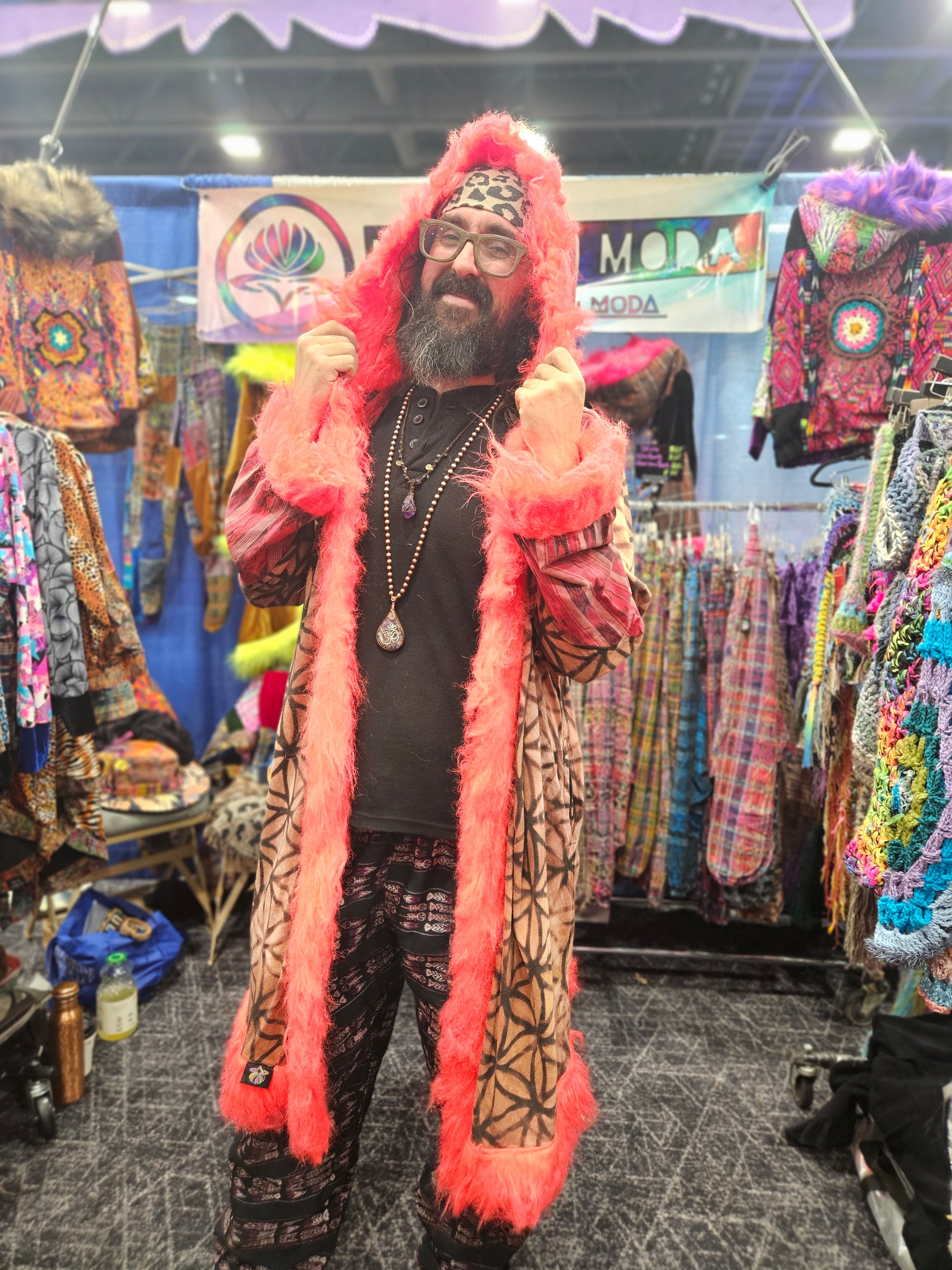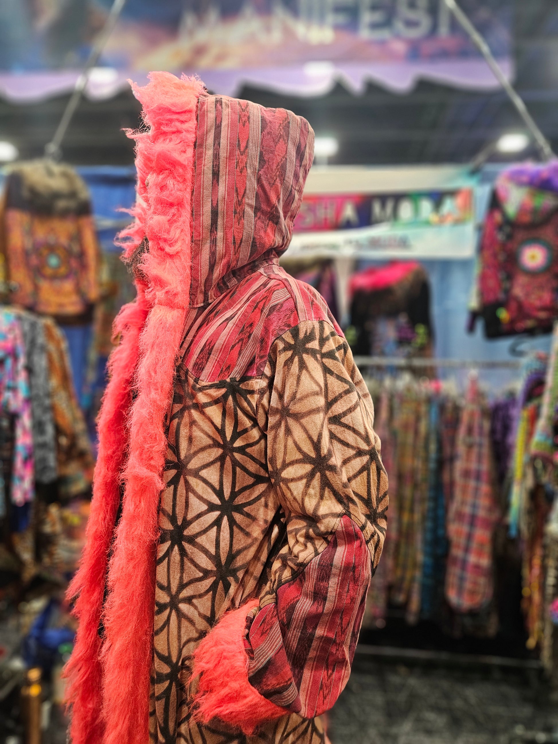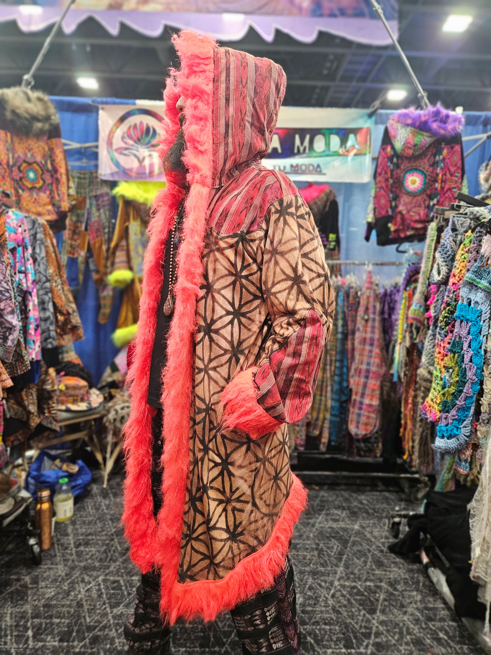 Funk up Your Vibe & Liberate Your Fashion with this super heady one of a kind collab cloaks by Moksha Moda & Jenzified Designs. The cloak is ethically crafted with beautiful upcycled hand woven Mayan fabrics from Guatemala for the detail, luxurious faux fur, and super soft breathable jersey that is then shipped to Jenzified Designs in Maine for her to hand bleach stencil each cloak. This one of a kind unisex cloak also features two pockets.
