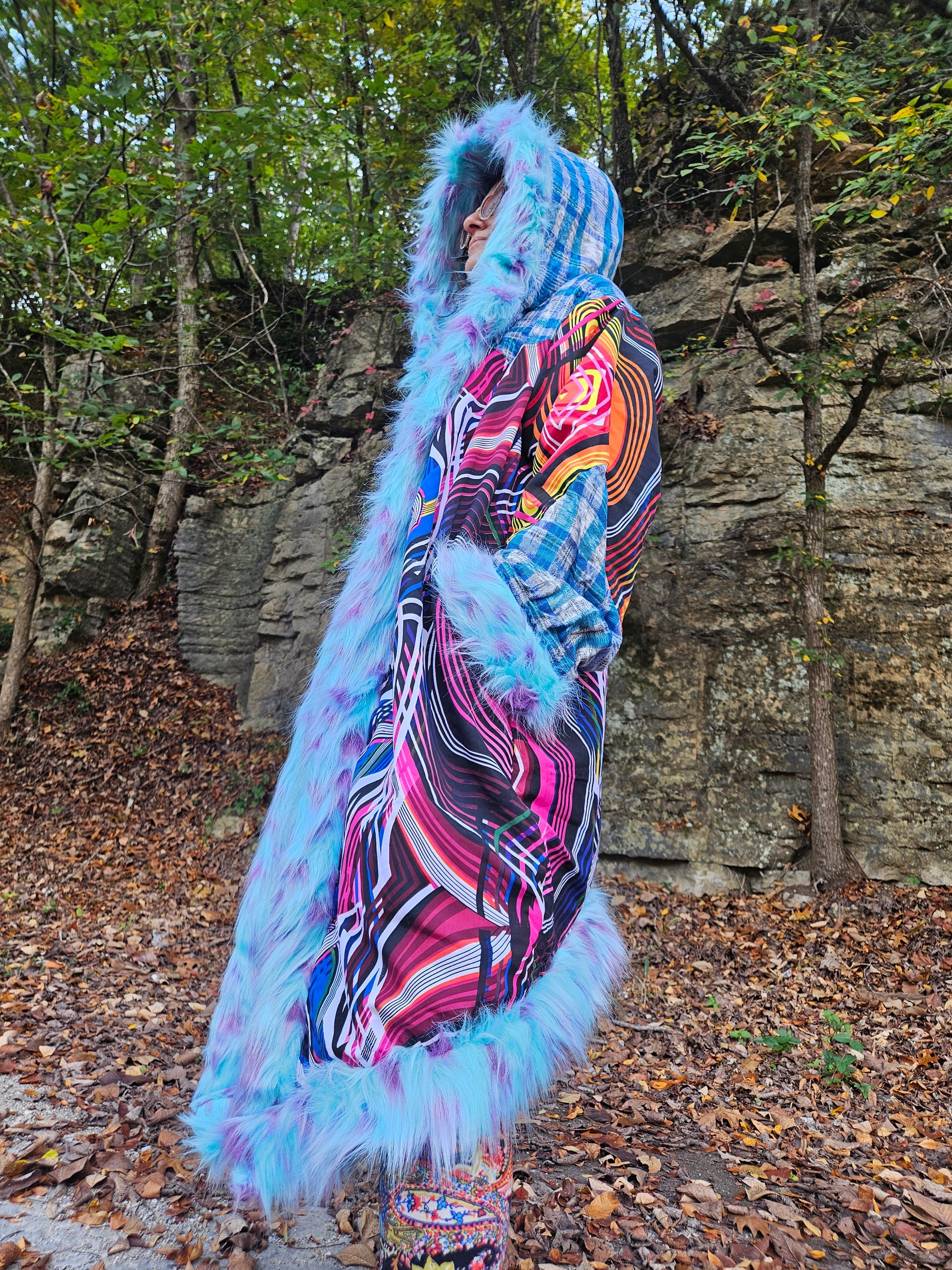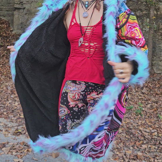 Liberate your Fashion and Funk up your Vibe with this incredible wild Cloak by Moksha Moda. This one-of-a-kind wearable work of art is ethically crafted in Guatemala with upcycled cortes which are traditional hand woven skirts that are sourced from second-hand markets in Guatemala, vibrant abstract polyester print, soft sherpa fleece, and wild faux fur. This cloak includes three pockets, one is a velcro pocket inside.