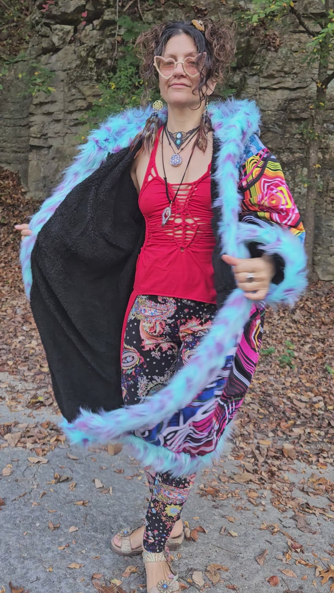 Each Moksha Moda cloak is a one-of-a-kind wearable work of art. With its unique blend of ethical craftsmanship, upcycled materials, and funky style, this wild cloak is sure to Funk Up Your Vibe, Liberate your Fashion, and it is ready for an adventure of a lifetime.