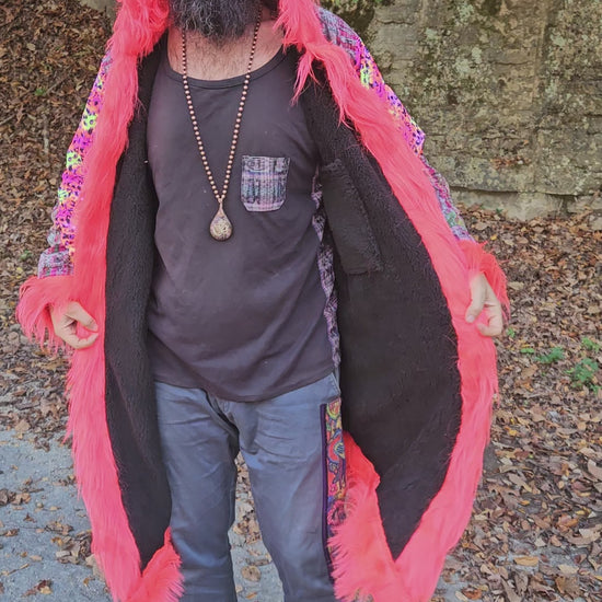 Liberate your Fashion and Funk up your Vibe with this incredible wild Cloak by Moksha Moda. This one-of-a-kind wearable work of art is ethically crafted in Guatemala with upcycled cortes which are traditional hand woven skirts that are sourced from second-hand markets in Guatemala, vibrant cheetah polyester print, soft sherpa fleece, and wild faux fur. This cloak includes three pockets, one is a velcro pocket inside.