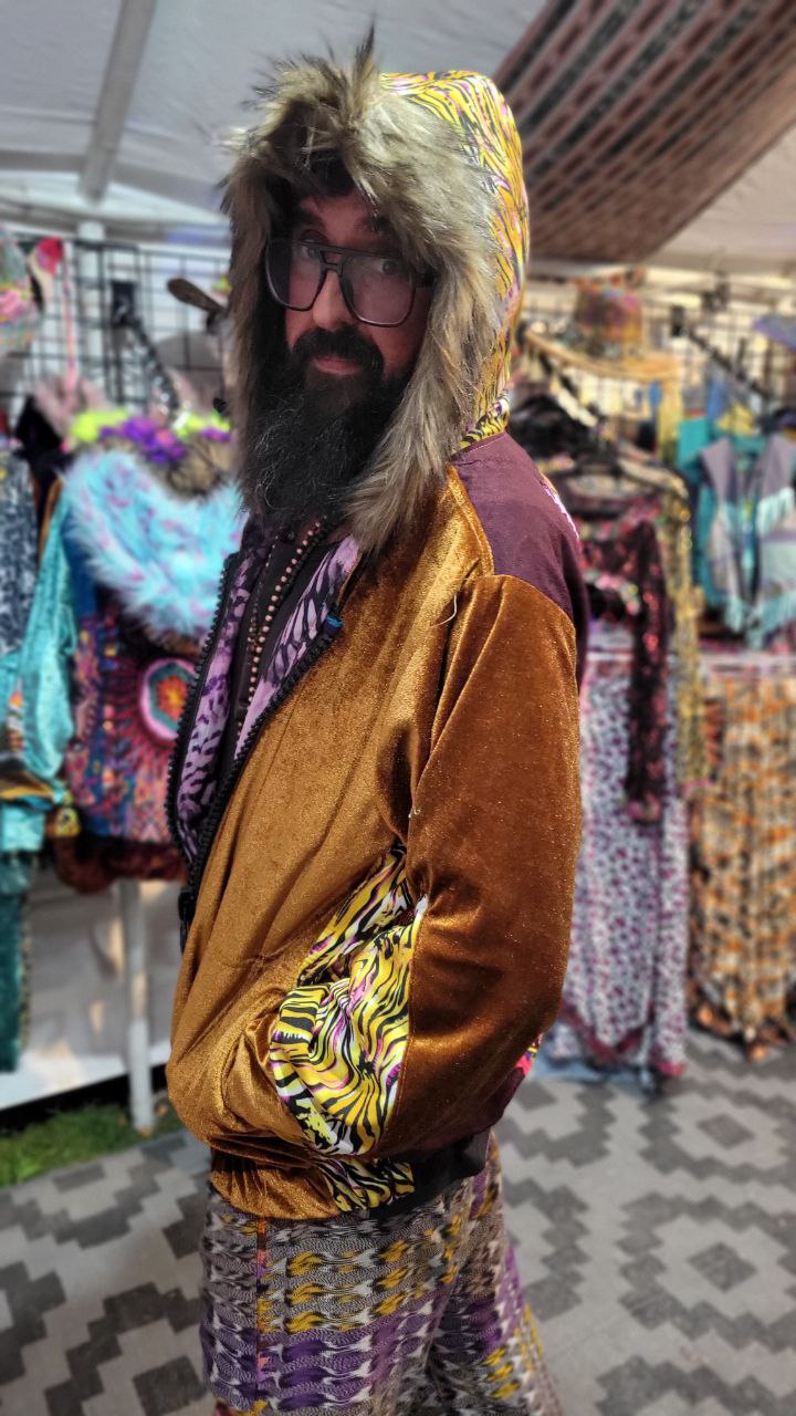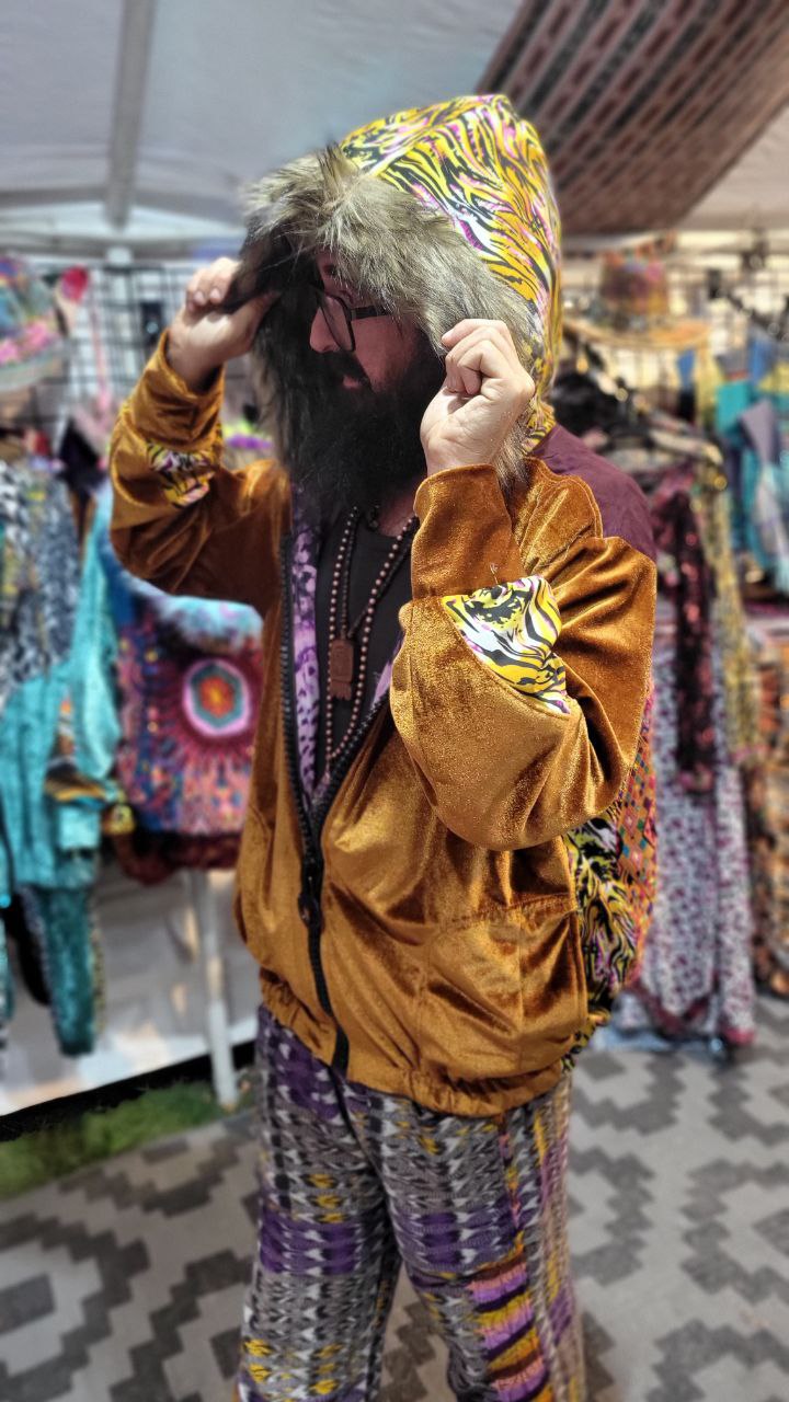 The intricate design of this flower of life jacket features upcycled hand embroidered Mayan huipiles from Chichicastetenango Guatemala. Huipiles are traditional blouses worm by Mayan women and the embroidery being significant to different villages in Guatemala. Even though huipiles across Guatemala are beautiful, huipiles from Chichicastetenango is in our opinion the most impressive and beautiful. The team behind Moksha Moda & Starlily Creations are grateful to be able to upcycle these incredible works of art and give them new life. This jacket is also lined and features detail with a super vibrant wild polyester print. The hood features a wild faux fur that will make you feel like a Queen or King late night at any festival. The jacket also features an elegant velvet for the sleeves/front body, thumb holes on the sleeves, three pockets, elastic waist, plus a ridiculous oversized zipper. However the focus of this jacket is the sacred geometry flower of life crocheted by the incredibly talented Starlily Creations which we feel shows one's gratitude for this beautiful gift called life.