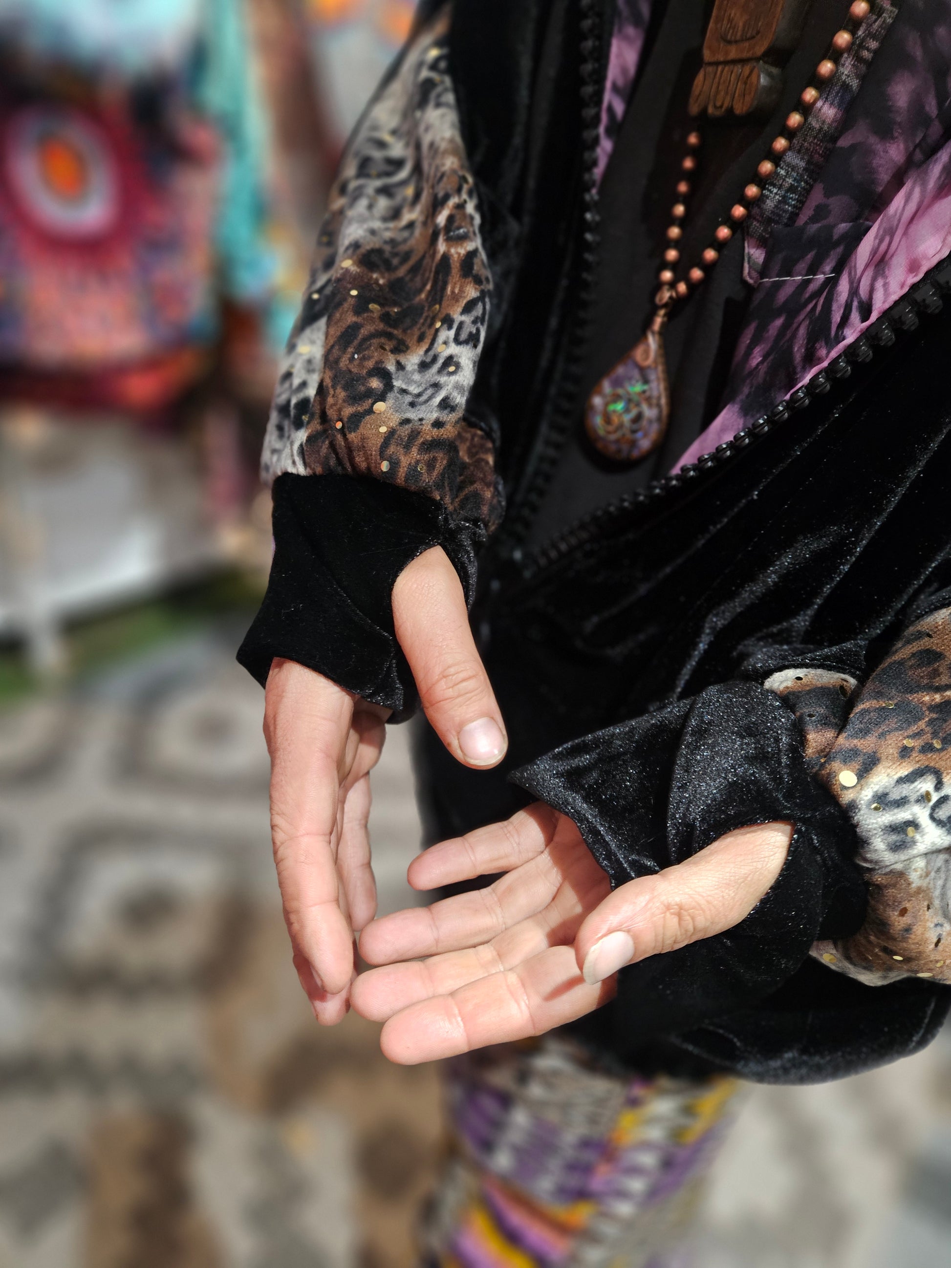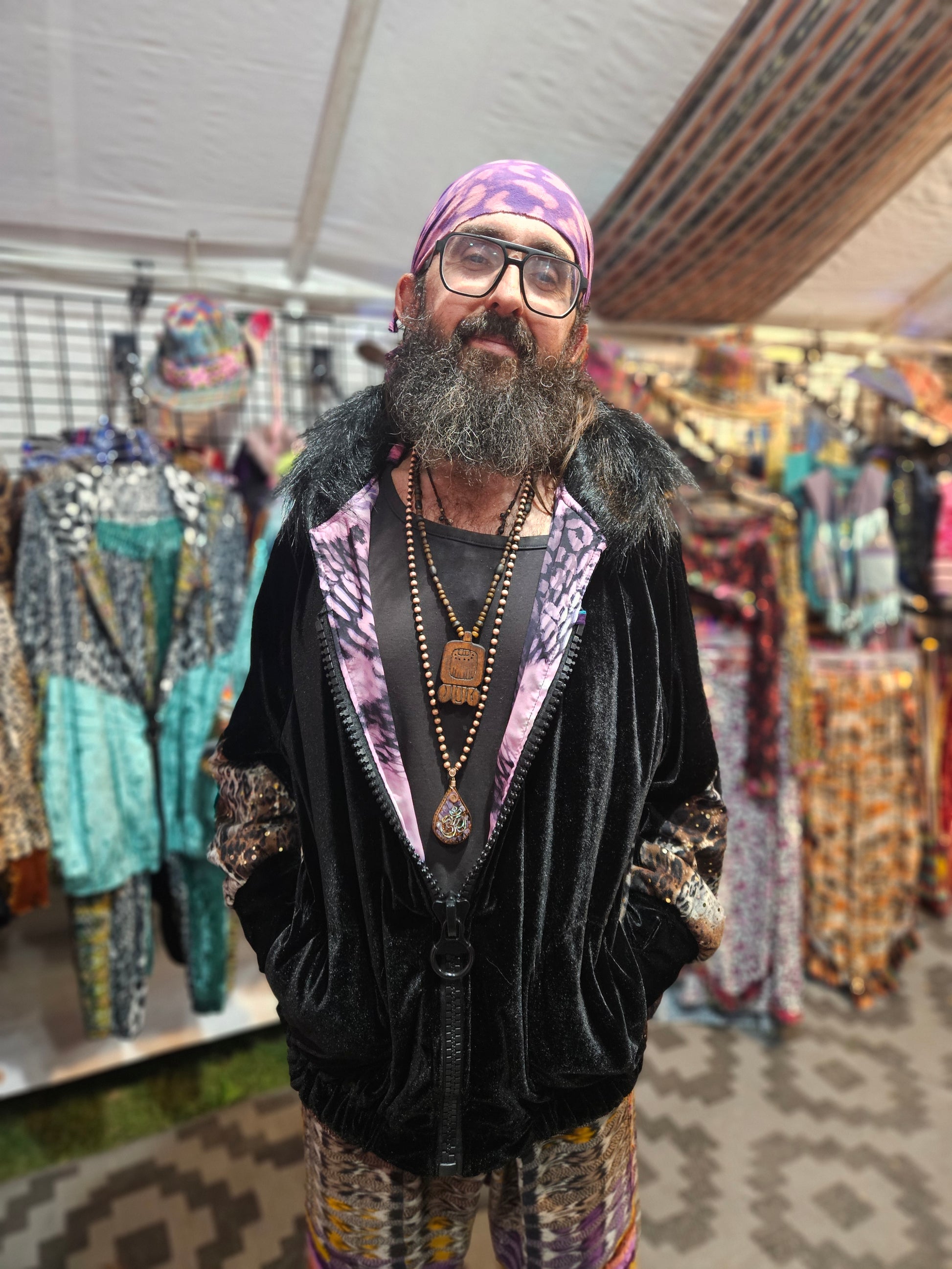 The intricate design of this flower of life jacket features upcycled hand embroidered Mayan huipiles from Chichicastetenango Guatemala. Huipiles are traditional blouses worm by Mayan women and the embroidery being significant to different villages in Guatemala. Even though huipiles across Guatemala are beautiful, huipiles from Chichicastetenango is in our opinion the most impressive and beautiful. The team behind Moksha Moda & Starlily Creations are grateful to be able to upcycle these incredible works of art and give them new life. This jacket is also lined and features detail with a super vibrant wild polyester print. The hood features a wild faux fur that will make you feel like a Queen or King late night at any festival. The jacket also features an elegant velvet for the sleeves/front body, thumb holes on the sleeves, three pockets, elastic waist, plus a ridiculous oversized zipper. However the focus of this jacket is the sacred geometry flower of life crocheted by the incredibly talented Starlily Creations which we feel shows one's gratitude for this beautiful gift called life.