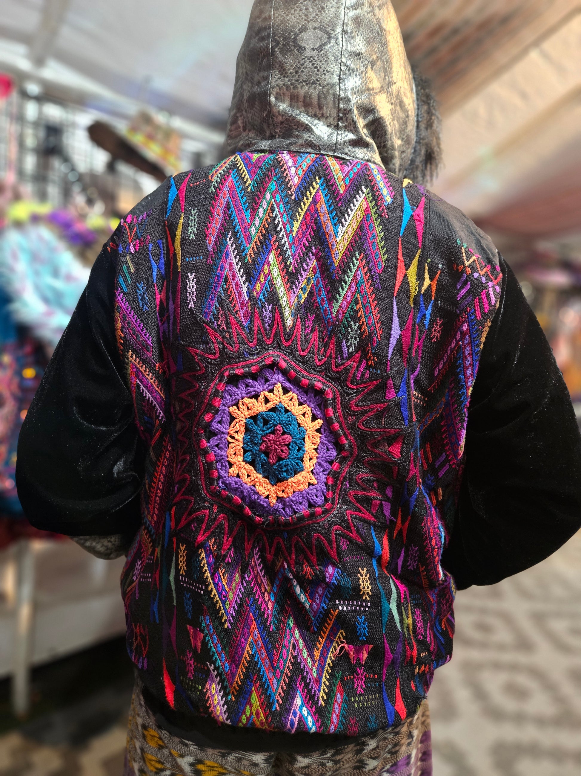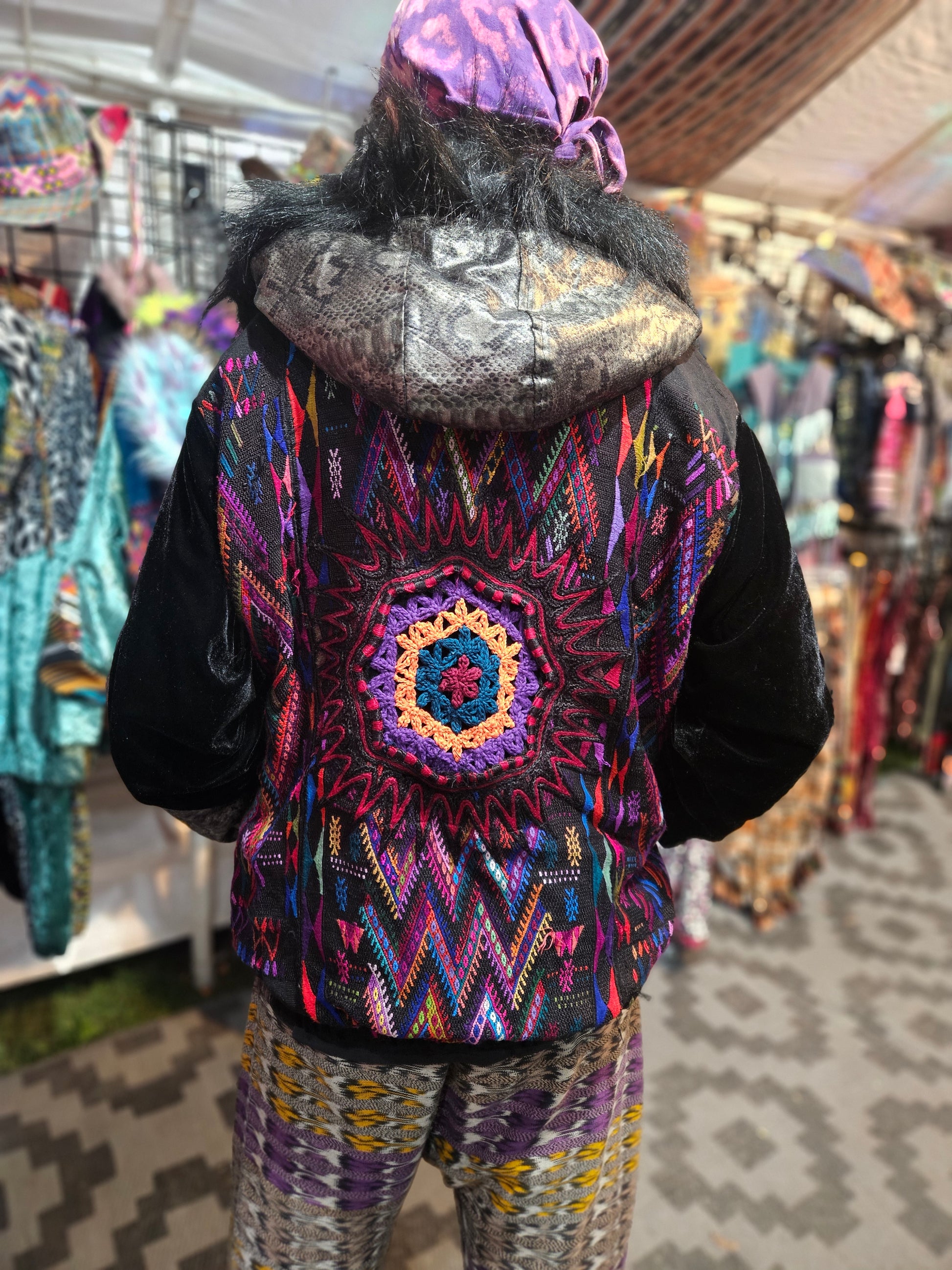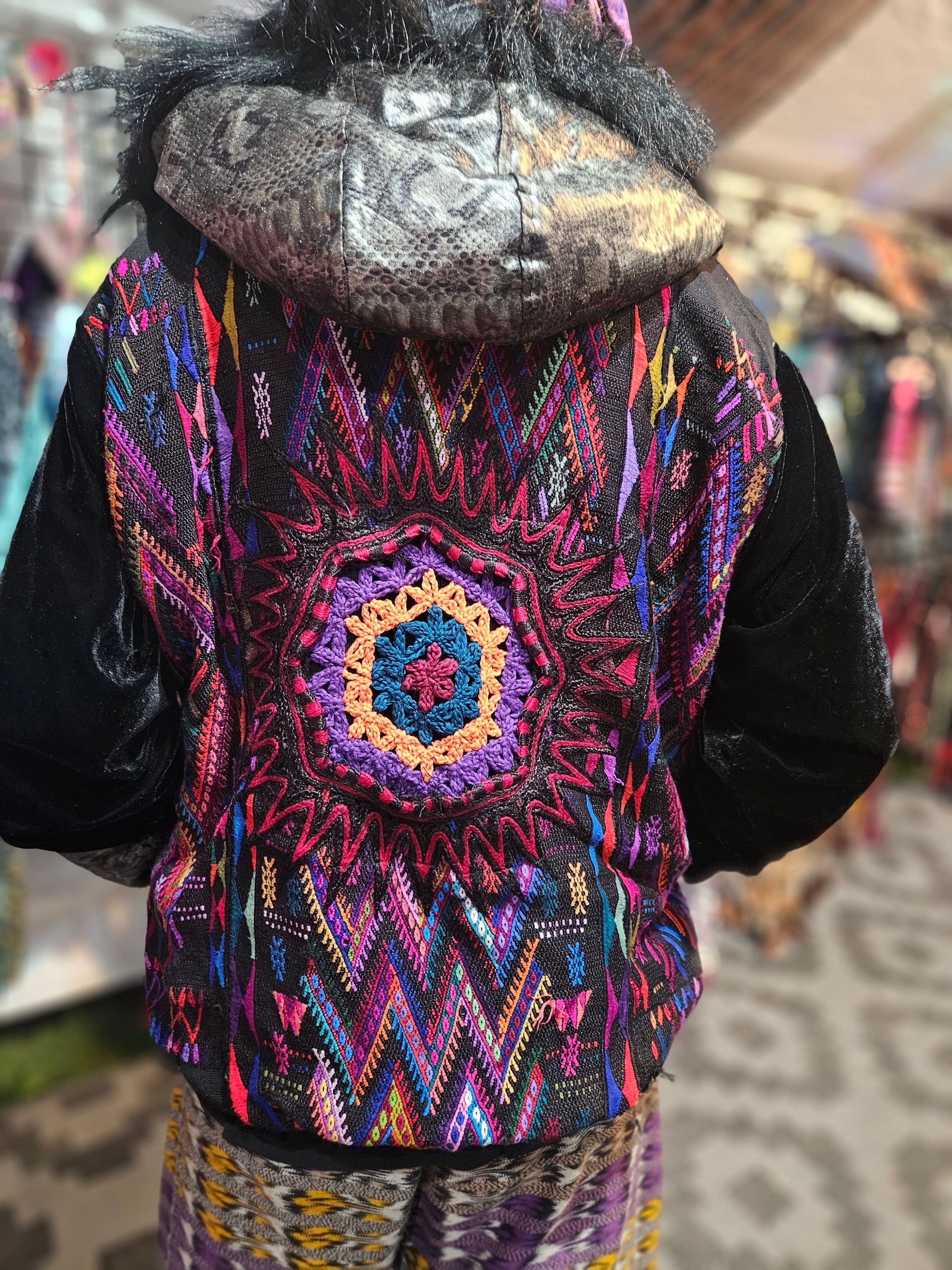 The intricate design of this flower of life jacket features upcycled hand embroidered Mayan huipiles from Chichicastetenango Guatemala. Huipiles are traditional blouses worm by Mayan women and the embroidery being significant to different villages in Guatemala. Even though huipiles across Guatemala are beautiful, huipiles from Chichicastetenango is in our opinion the most impressive and beautiful. The team behind Moksha Moda & Starlily Creations are grateful to be able to upcycle these incredible works of art and give them new life. This jacket is also lined and features detail with a super vibrant wild polyester print. The hood features a wild faux fur that will make you feel like a Queen or King late night at any festival. The jacket also features an elegant velvet for the sleeves/front body, thumb holes on the sleeves, two pockets, elastic waist, plus a ridiculous oversized zipper. However the focus of this jacket is the sacred geometry flower of life crocheted by the incredibly talented Starlily Creations which we feel shows one's gratitude for this beautiful gift called life.
