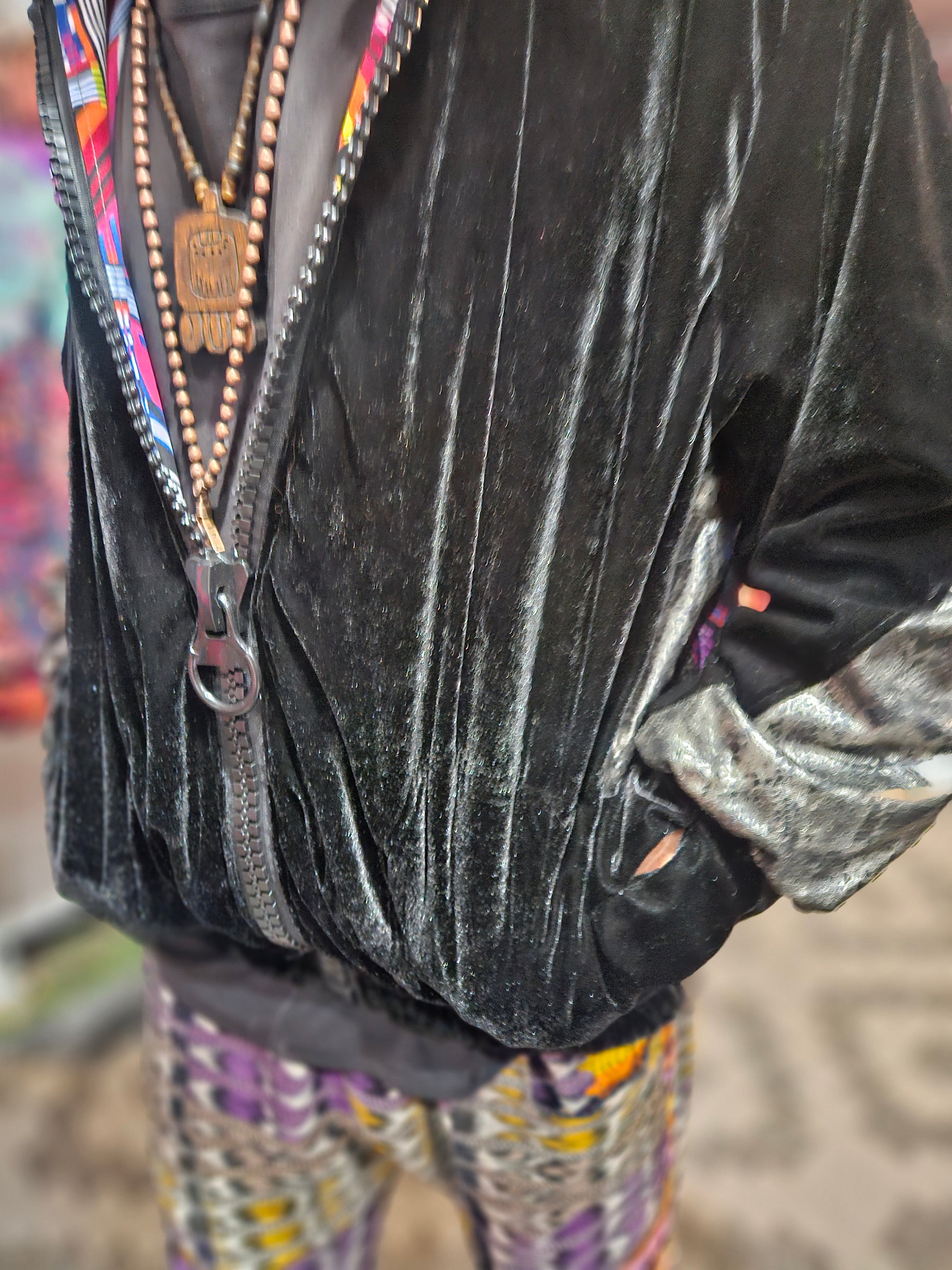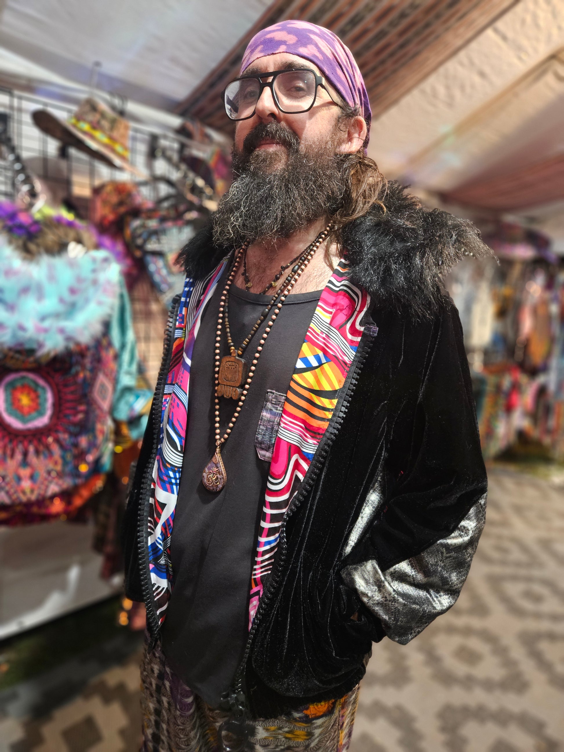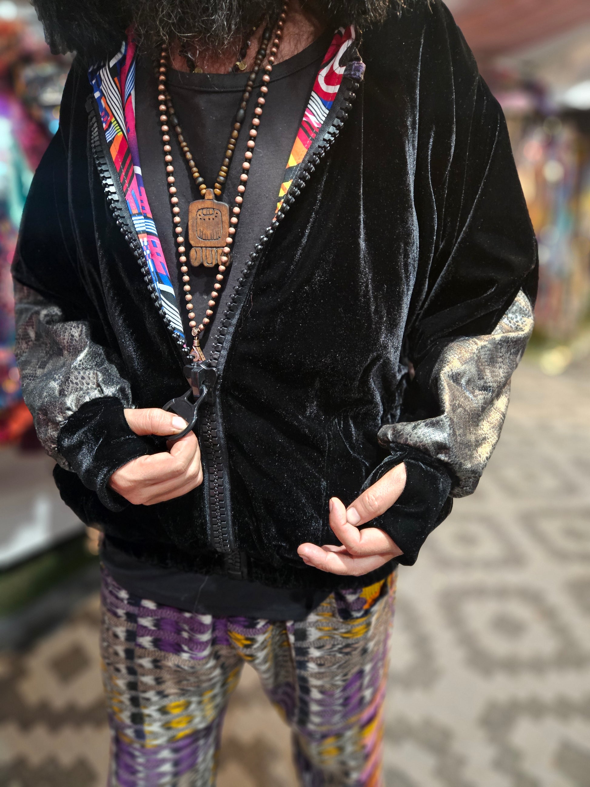 The intricate design of this flower of life jacket features upcycled hand embroidered Mayan huipiles from Chichicastetenango Guatemala. Huipiles are traditional blouses worm by Mayan women and the embroidery being significant to different villages in Guatemala. Even though huipiles across Guatemala are beautiful, huipiles from Chichicastetenango is in our opinion the most impressive and beautiful. The team behind Moksha Moda & Starlily Creations are grateful to be able to upcycle these incredible works of art and give them new life. This jacket is also lined and features detail with a super vibrant wild polyester print. The hood features a wild faux fur that will make you feel like a Queen or King late night at any festival. The jacket also features an elegant velvet for the sleeves/front body, thumb holes on the sleeves, two pockets, elastic waist, plus a ridiculous oversized zipper. However the focus of this jacket is the sacred geometry flower of life crocheted by the incredibly talented Starlily Creations which we feel shows one's gratitude for this beautiful gift called life.