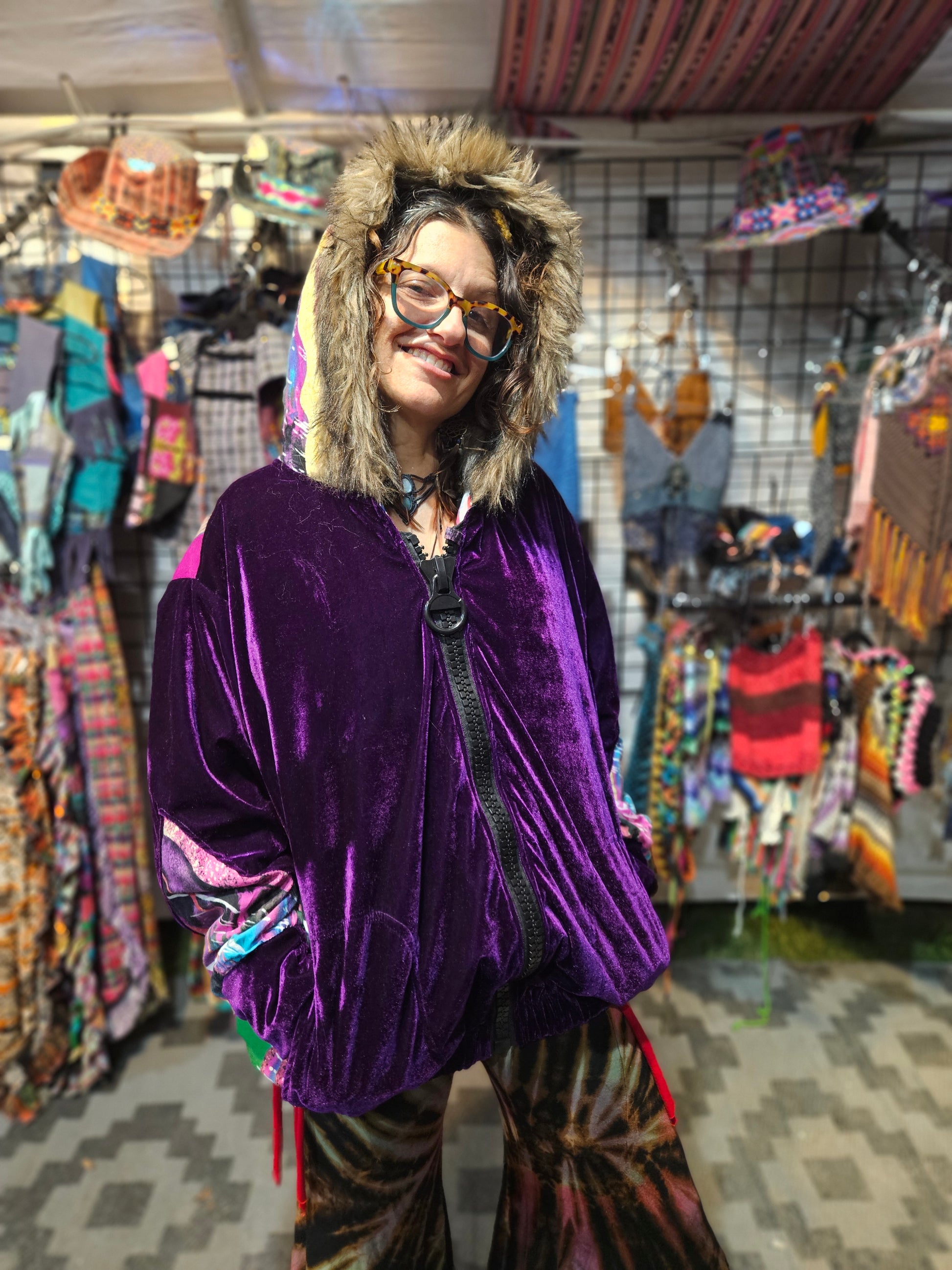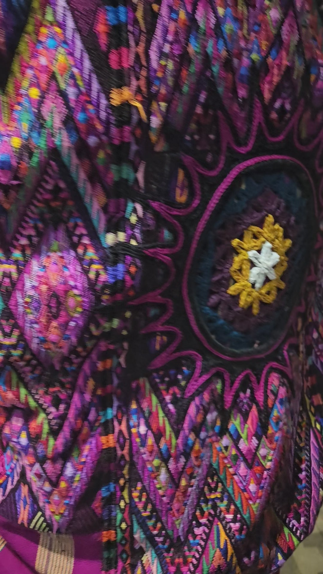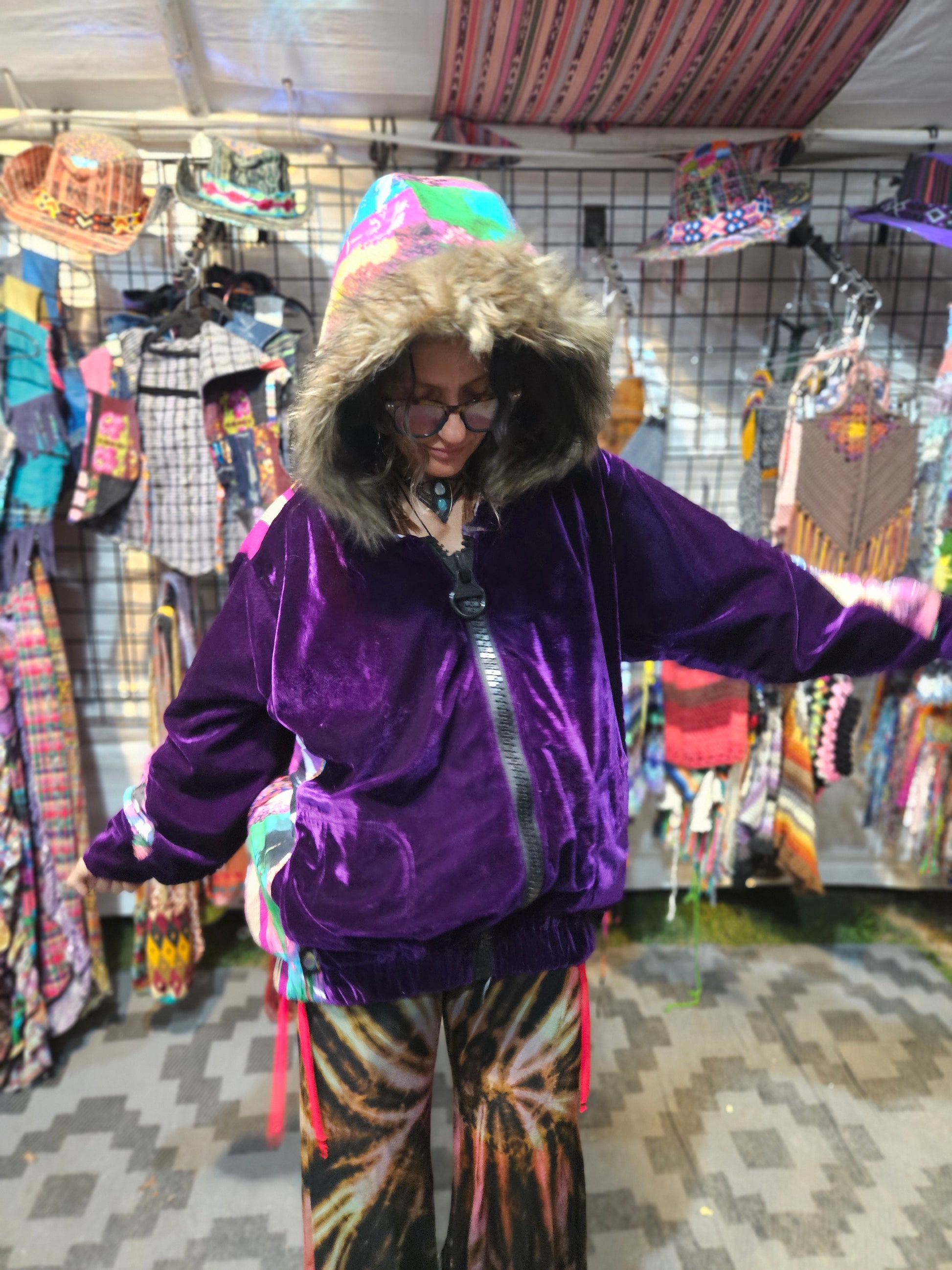 The intricate design of this flower of life jacket features upcycled hand embroidered Mayan huipiles from Chichicastetenango Guatemala. Huipiles are traditional blouses worm by Mayan women and the embroidery being significant to different villages in Guatemala. Even though huipiles across Guatemala are beautiful, huipiles from Chichicastetenango is in our opinion the most impressive and beautiful. The team behind Moksha Moda & Starlily Creations are grateful to be able to upcycle these incredible works of art and give them new life. This jacket is also lined and features detail with a super vibrant wild polyester print. The hood features a wild faux fur that will make you feel like a Queen or King late night at any festival. The jacket also features an elegant velvet for the sleeves/front body, thumb holes on the sleeves, three pockets, elastic waist, plus a ridiculous oversized zipper. However the focus of this jacket is the sacred geometry flower of life crocheted by the incredibly talented Starlily Creations which we feel shows one's gratitude for this beautiful gift called life.