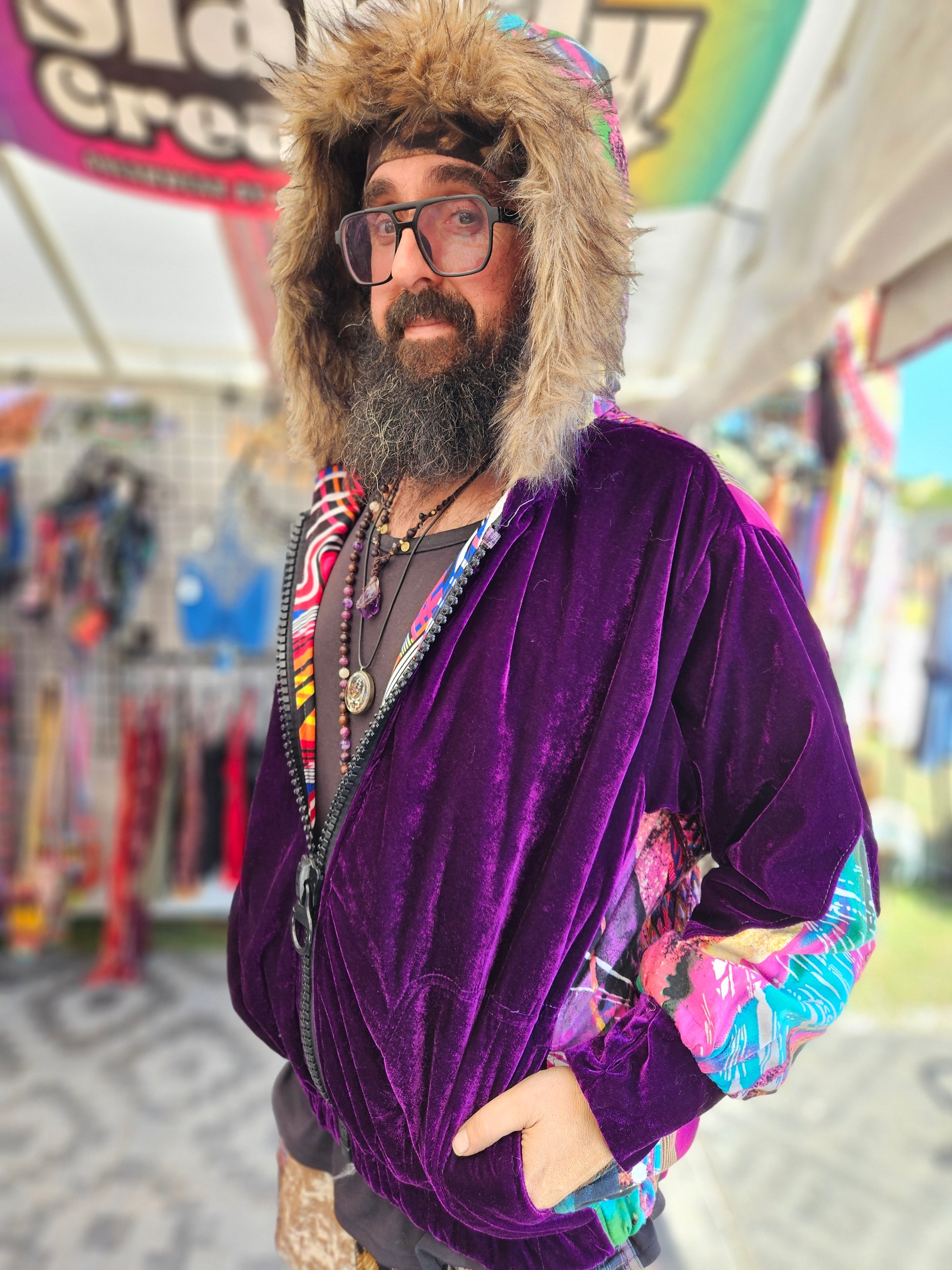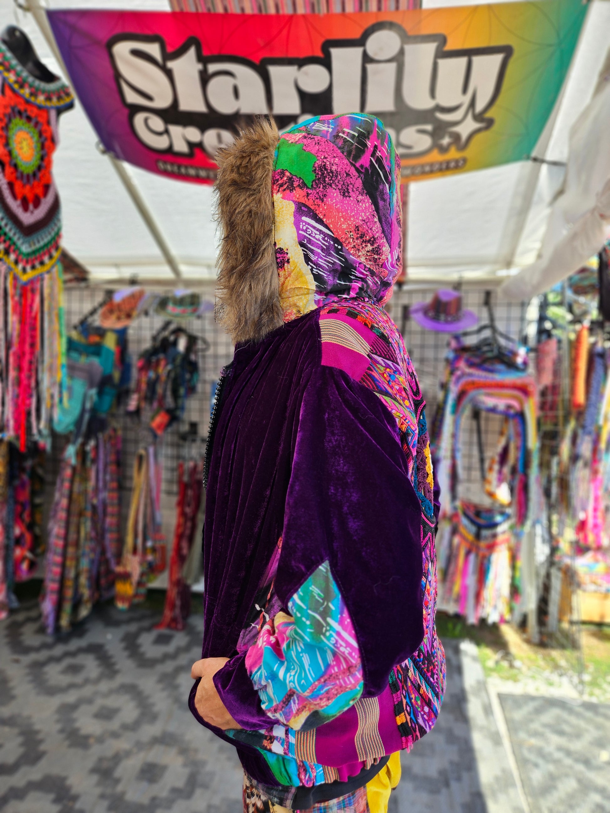 The intricate design of this flower of life jacket features upcycled hand embroidered Mayan huipiles from Chichicastetenango Guatemala. Huipiles are traditional blouses worm by Mayan women and the embroidery being significant to different villages in Guatemala. Even though huipiles across Guatemala are beautiful, huipiles from Chichicastetenango is in our opinion the most impressive and beautiful. The team behind Moksha Moda & Starlily Creations are grateful to be able to upcycle these incredible works of art and give them new life. This jacket is also lined and features detail with a super vibrant wild polyester print. The hood features a wild faux fur that will make you feel like a Queen or King late night at any festival. The jacket also features an elegant velvet for the sleeves/front body, thumb holes on the sleeves, three pockets, elastic waist, plus a ridiculous oversized zipper. However the focus of this jacket is the sacred geometry flower of life crocheted by the incredibly talented Starlily Creations which we feel shows one's gratitude for this beautiful gift called life.
