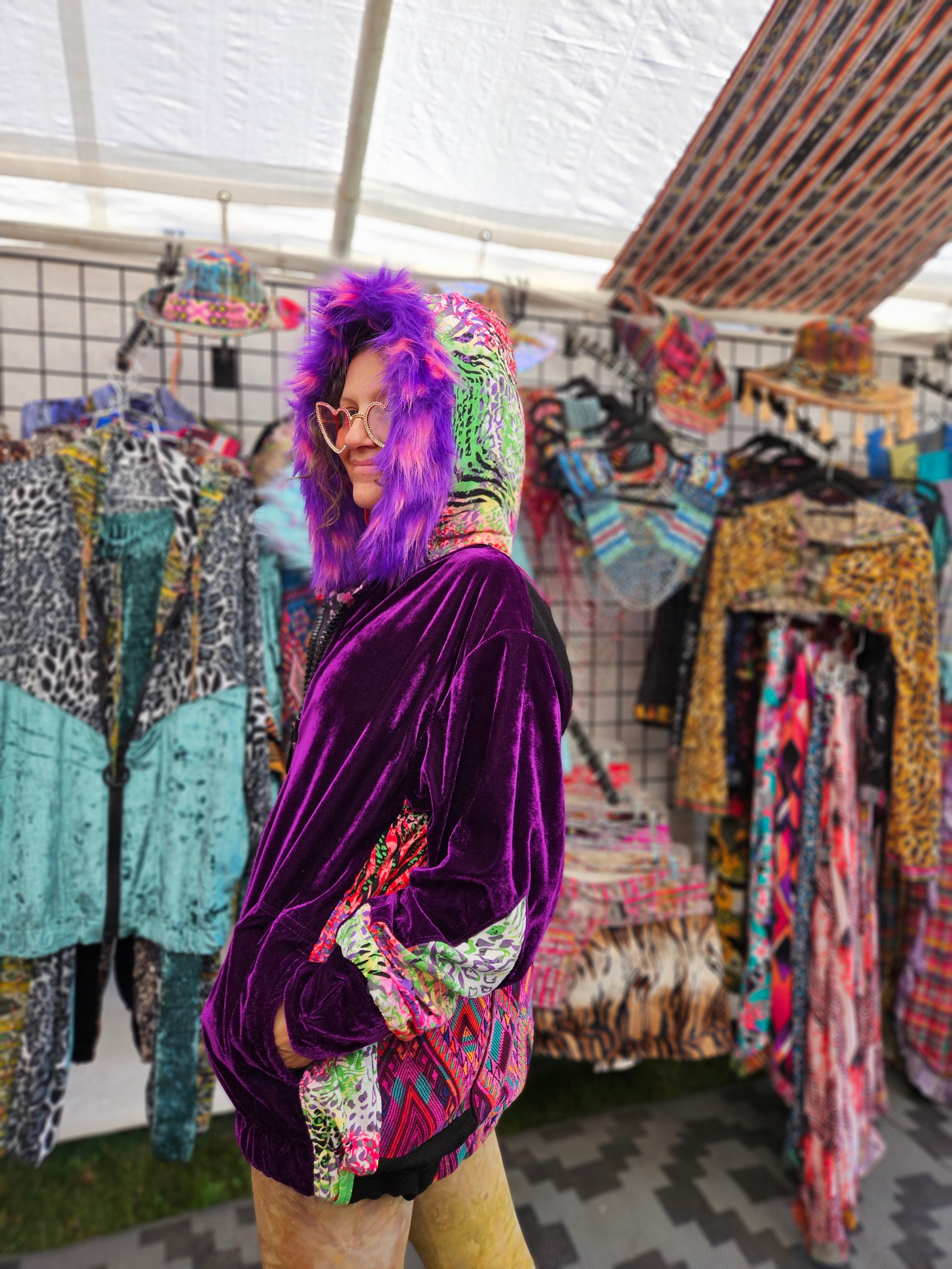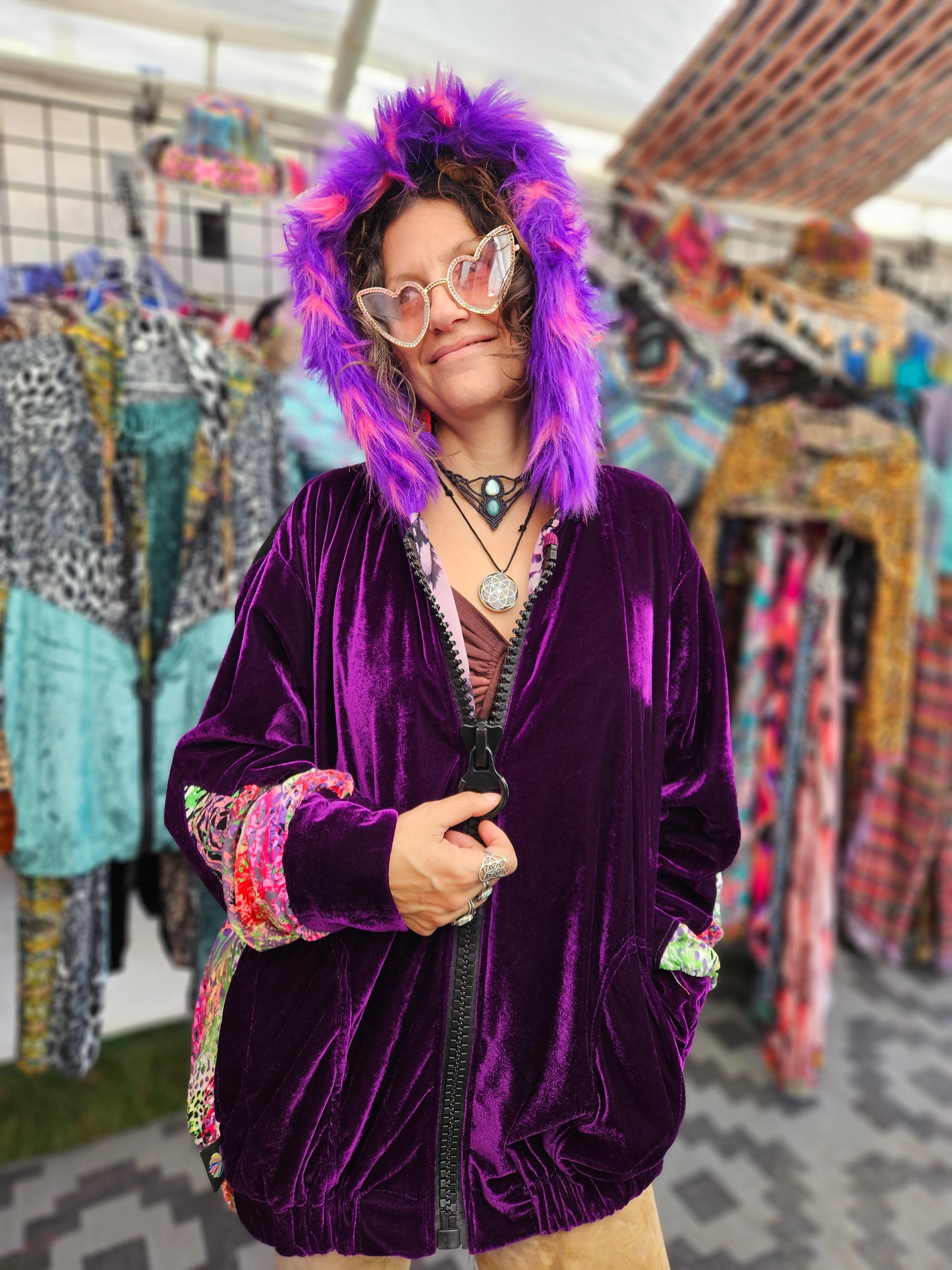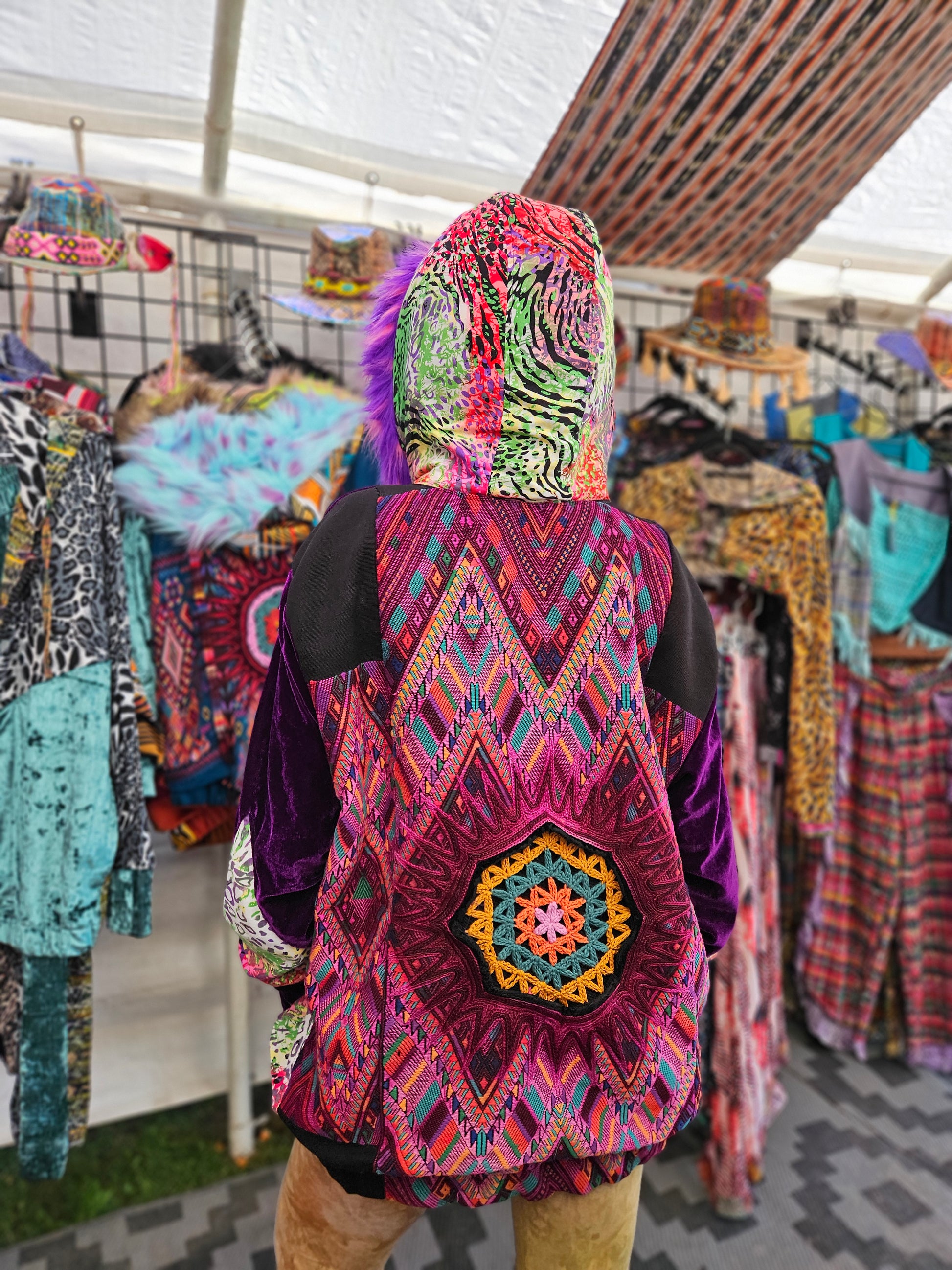 The intricate design of this flower of life jacket features upcycled hand embroidered Mayan huipiles from Chichicastetenango Guatemala. Huipiles are traditional blouses worm by Mayan women and the embroidery being significant to different villages in Guatemala. Even though huipiles across Guatemala are beautiful, huipiles from Chichicastetenango is in our opinion the most impressive and beautiful. The team behind Moksha Moda & Starlily Creations are grateful to be able to upcycle these incredible works of art and give them new life. This jacket is also lined and features detail with a super vibrant wild polyester print. The hood features a wild faux fur that will make you feel like a Queen or King late night at any festival. The jacket also features an elegant velvet for the sleeves/front body, thumb holes on the sleeves, three pockets, elastic waist, plus a ridiculous oversized zipper. However the focus of this jacket is the sacred geometry flower of life crocheted by the incredibly talented Starlily Creations which we feel shows one's gratitude for this beautiful gift called life.