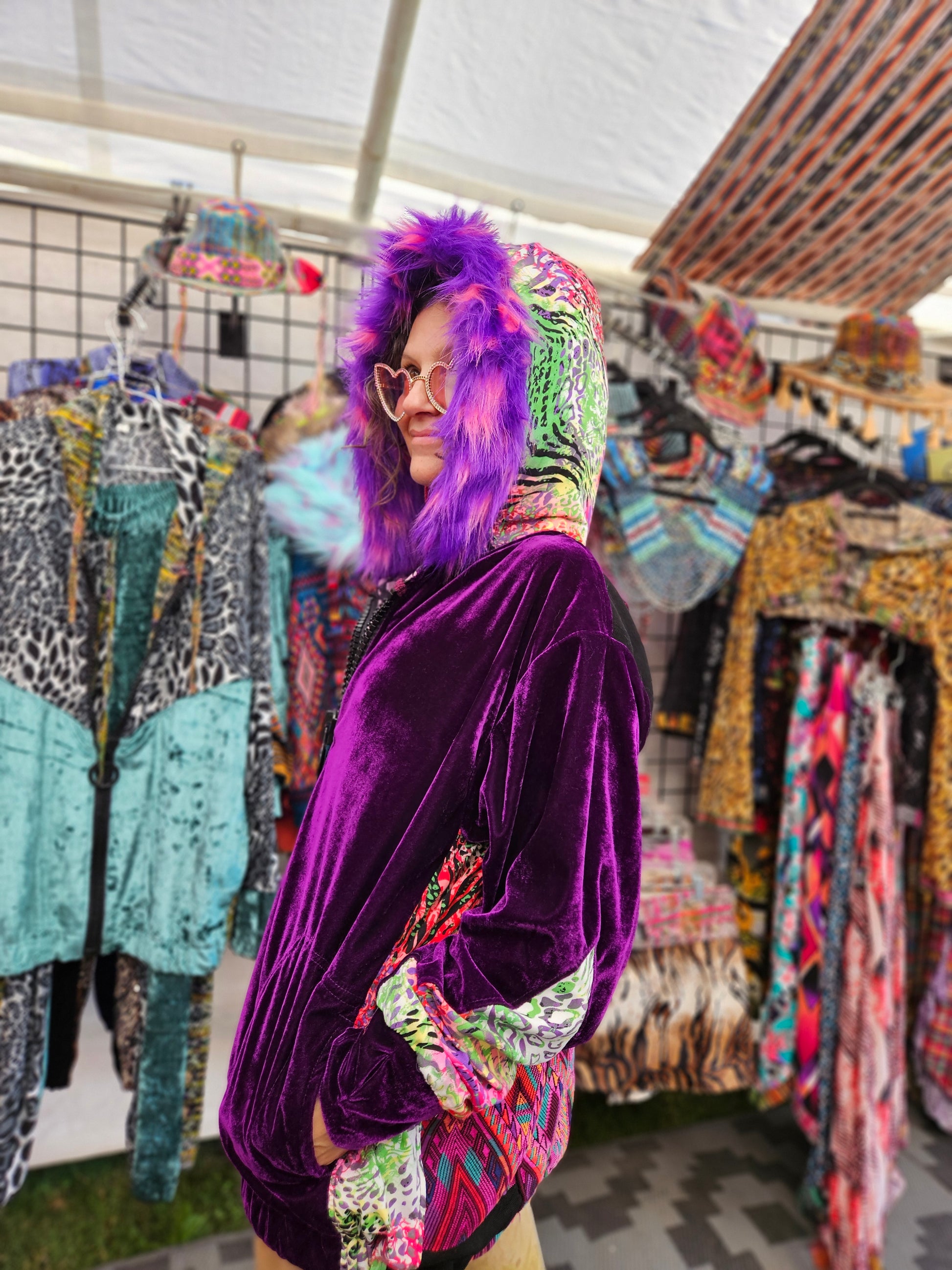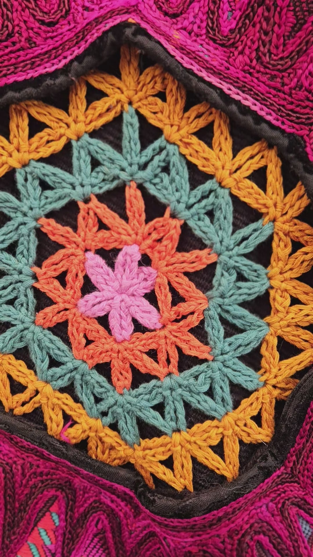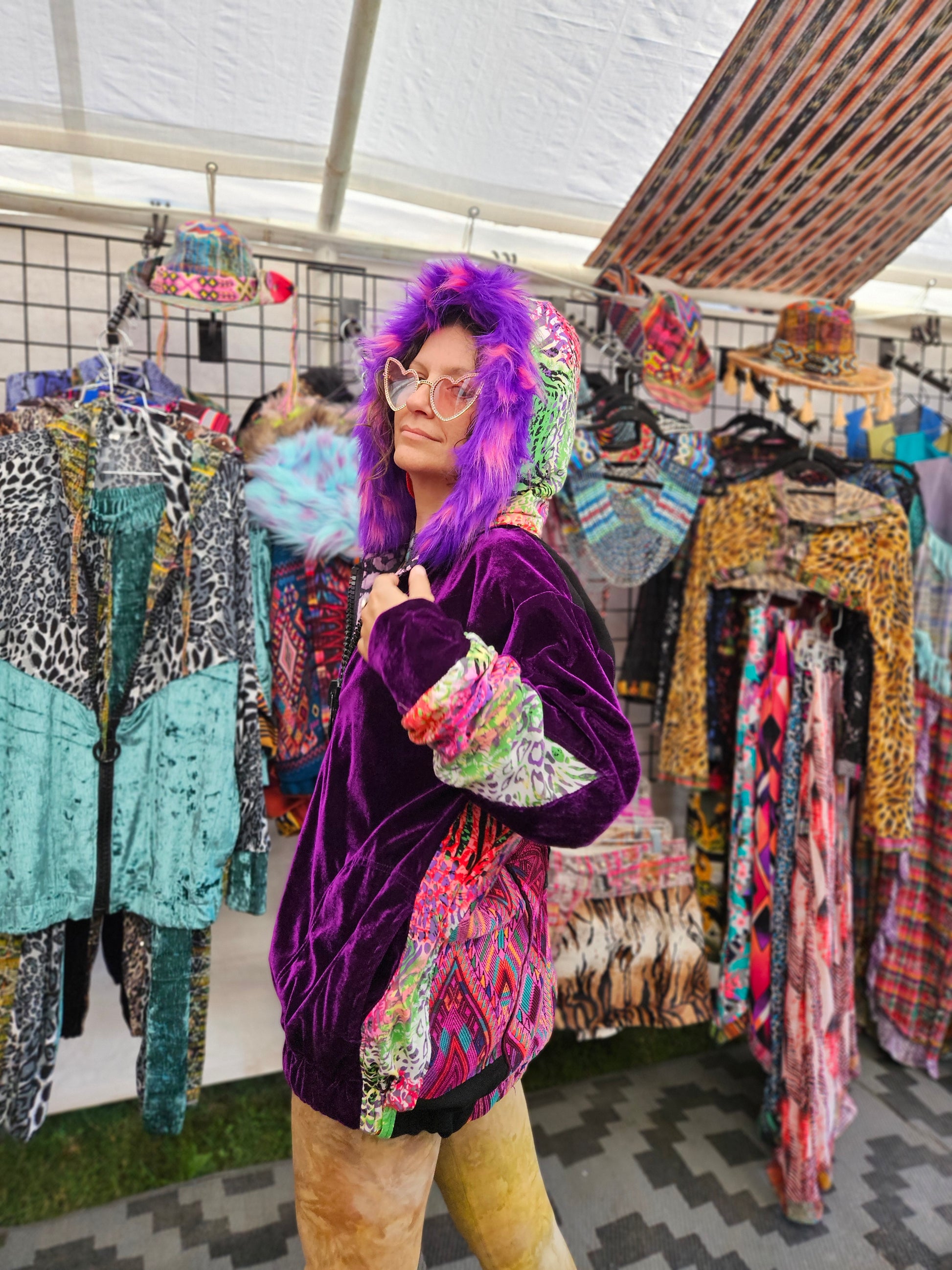 The intricate design of this flower of life jacket features upcycled hand embroidered Mayan huipiles from Chichicastetenango Guatemala. Huipiles are traditional blouses worm by Mayan women and the embroidery being significant to different villages in Guatemala. Even though huipiles across Guatemala are beautiful, huipiles from Chichicastetenango is in our opinion the most impressive and beautiful. The team behind Moksha Moda & Starlily Creations are grateful to be able to upcycle these incredible works of art and give them new life. This jacket is also lined and features detail with a super vibrant wild polyester print. The hood features a wild faux fur that will make you feel like a Queen or King late night at any festival. The jacket also features an elegant velvet for the sleeves/front body, thumb holes on the sleeves, three pockets, elastic waist, plus a ridiculous oversized zipper. However the focus of this jacket is the sacred geometry flower of life crocheted by the incredibly talented Starlily Creations which we feel shows one's gratitude for this beautiful gift called life.