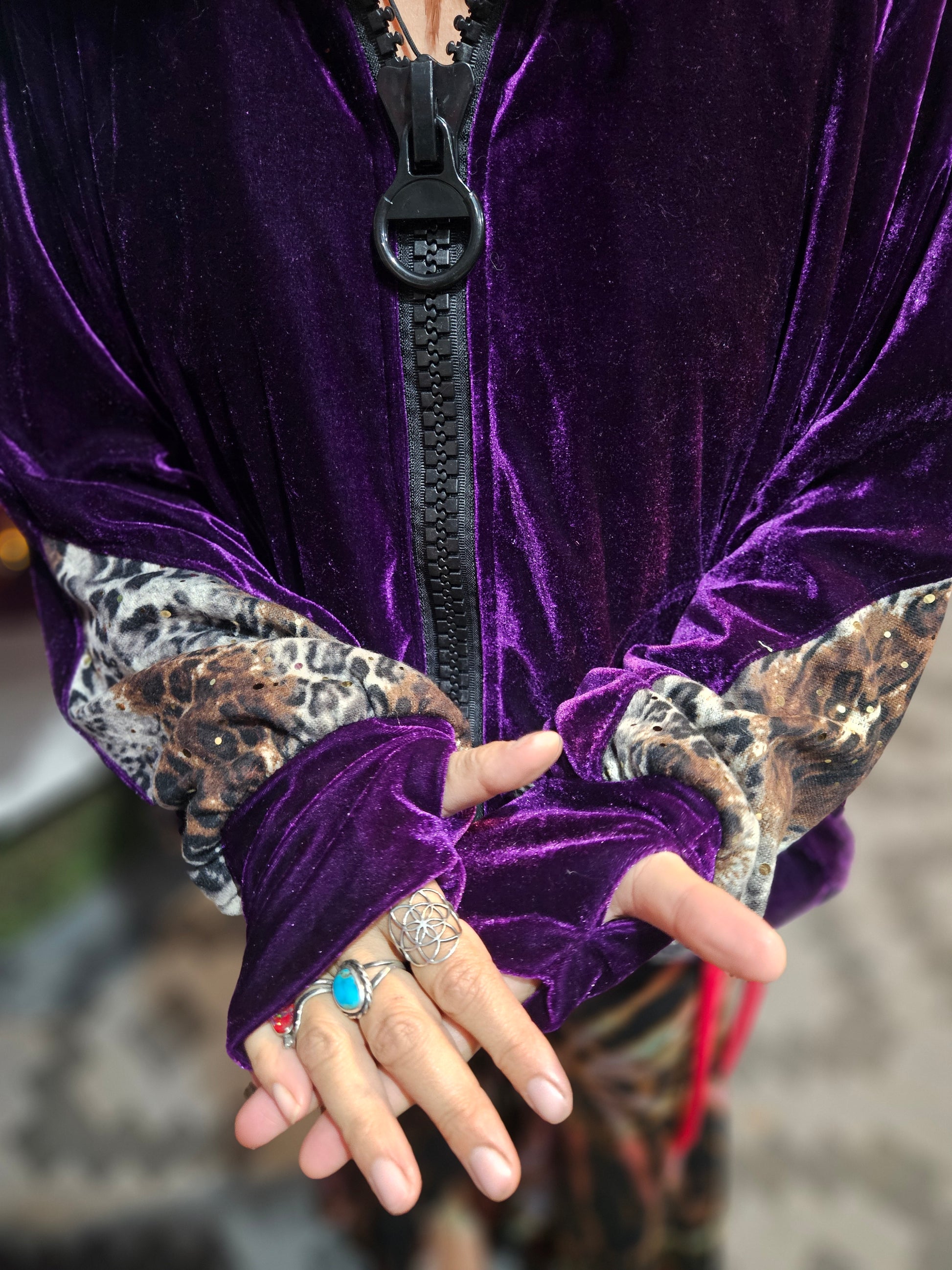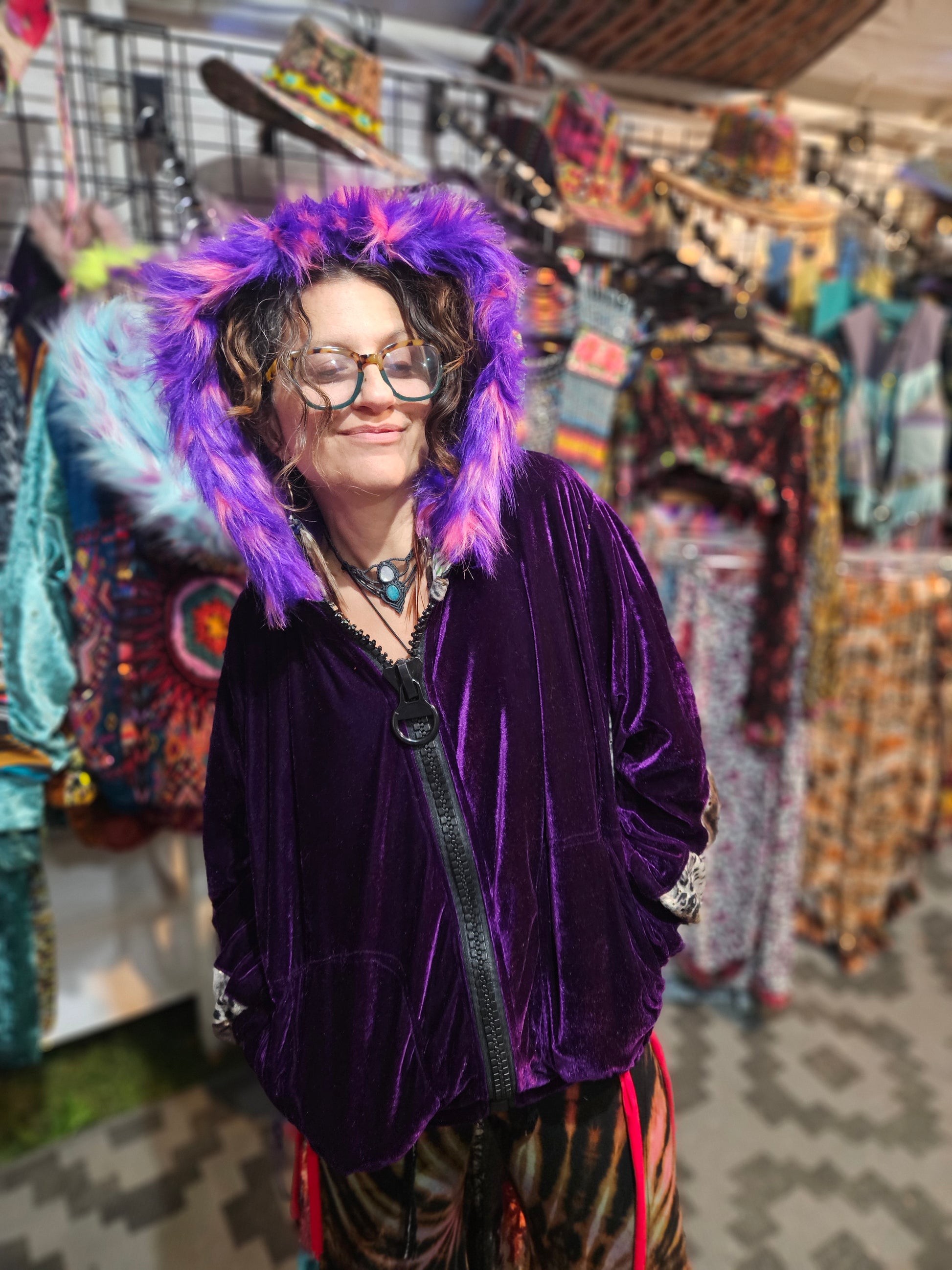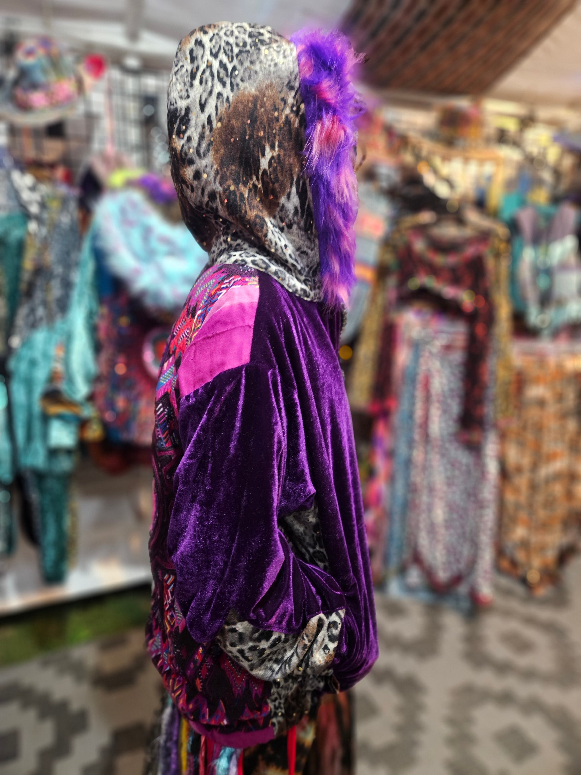 The intricate design of this flower of life jacket features upcycled hand embroidered Mayan huipiles from Chichicastetenango Guatemala. Huipiles are traditional blouses worm by Mayan women and the embroidery being significant to different villages in Guatemala. Even though huipiles across Guatemala are beautiful, huipiles from Chichicastetenango is in our opinion the most impressive and beautiful. The team behind Moksha Moda & Starlily Creations are grateful to be able to upcycle these incredible works of art and give them new life. This jacket is also lined and features detail with a super vibrant wild polyester print. The hood features a wild faux fur that will make you feel like a Queen or King late night at any festival. The jacket also features an elegant velvet for the sleeves/front body, thumb holes on the sleeves, three pockets, elastic waist, plus a ridiculous oversized zipper. However the focus of this jacket is the sacred geometry flower of life crocheted by the incredibly talented Starlily Creations which we feel shows one's gratitude for this beautiful gift called life.