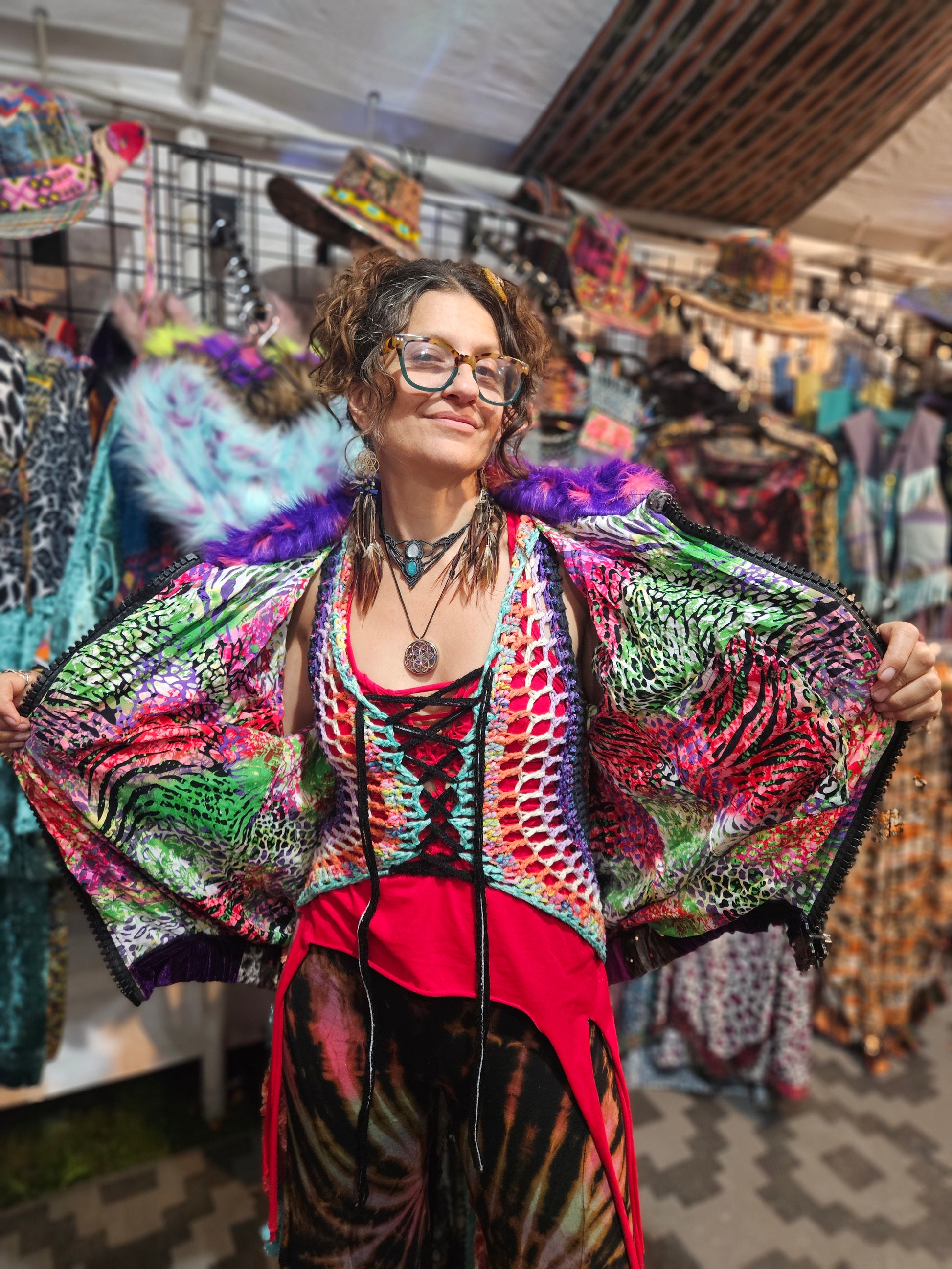 Funk Up Your Vibe & Liberate your Fashion with this incredible second collaboration between two of our featured designers Moksha Moda & Starlilly Creations. Ethically crafted in Guatemala, this stunning flower of life jacket is designed for the free-spirited and fashion-forward festival-goer.