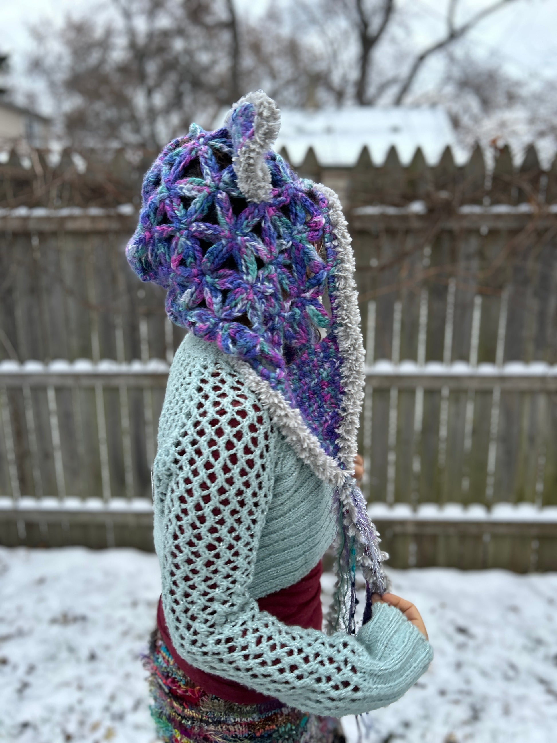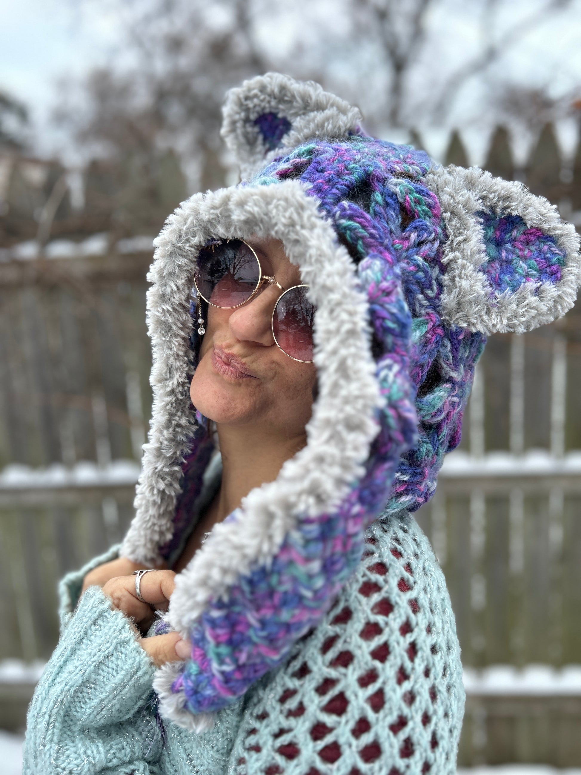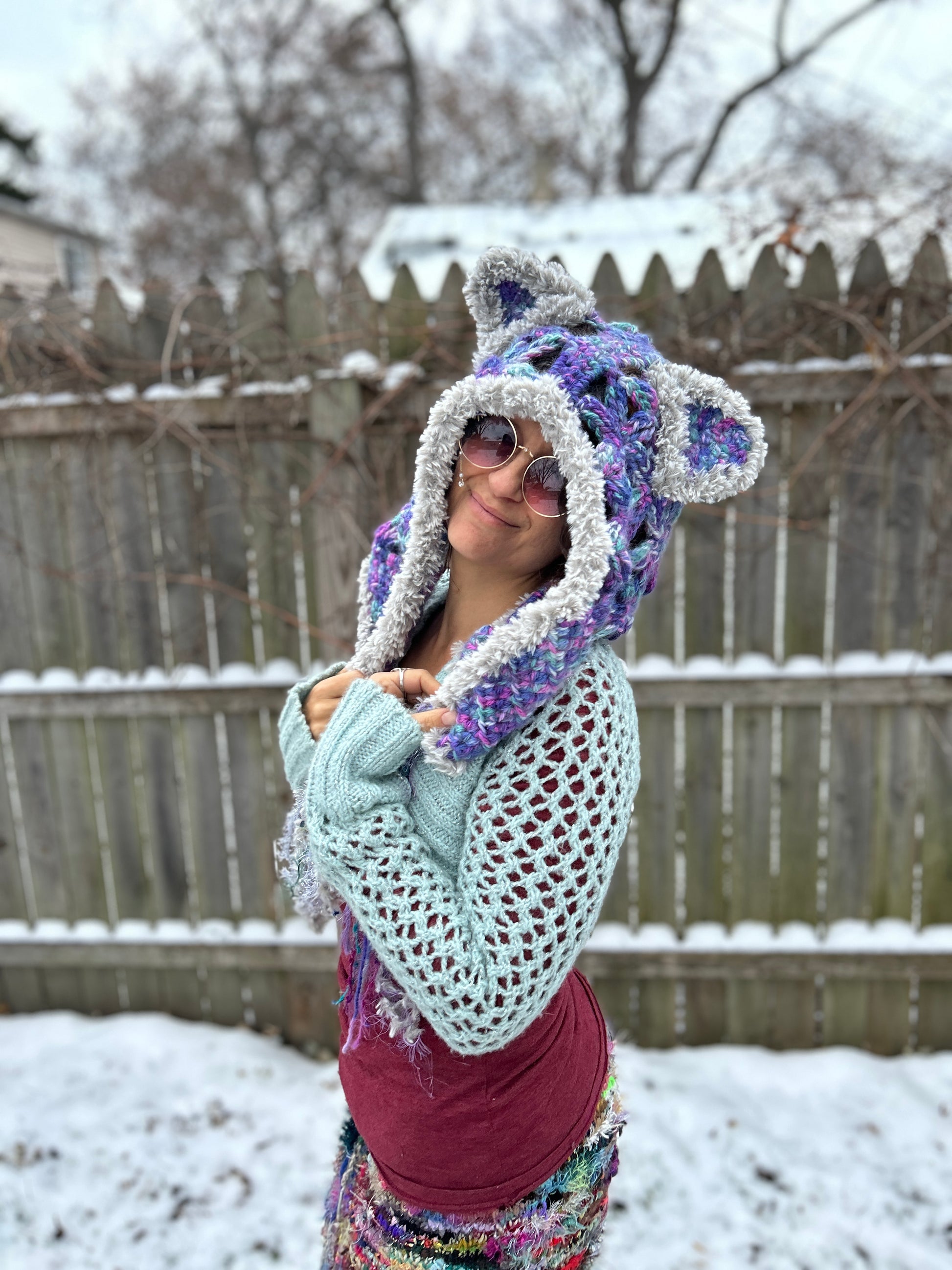 This super cute Flower of Life hood is made with acrylic blend yarn and faux fur yarn. It has adorable animal ears and flowy tassels too! We have a few others listed in the shop if you want to see others that are available :) These hoods are a fun accessory with any outfit, guaranteed! Made by one of our featured designers, Starlily Creations, each hood is truly one of a kind!