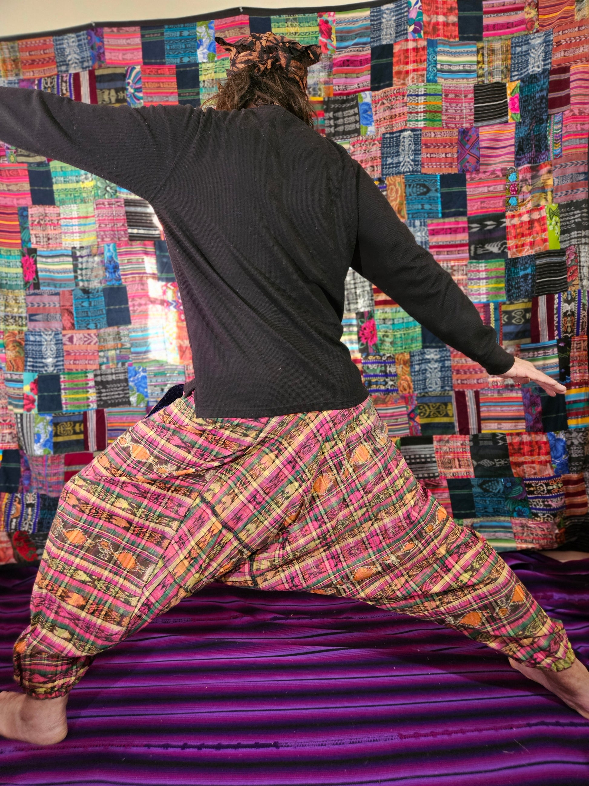 Looking for a unique, artsy, and funky addition to your festival wardrobe? Look no further than Moksha Moda's ethically crafted Harem Pants! These one-of-a-kind wearable works of art are crafted with beautiful upcycled traditional hand-woven cotton Mayan skirts called cortes sourced from second-hand markets in Guatemala. Each fabric gem has its own story, making every harem pants a wearable work of art with a new journey to embark on. The pants include an elastic waist, drawstring, elastic leg cuffs, two velvet lined pockets, & one zipper pocket.