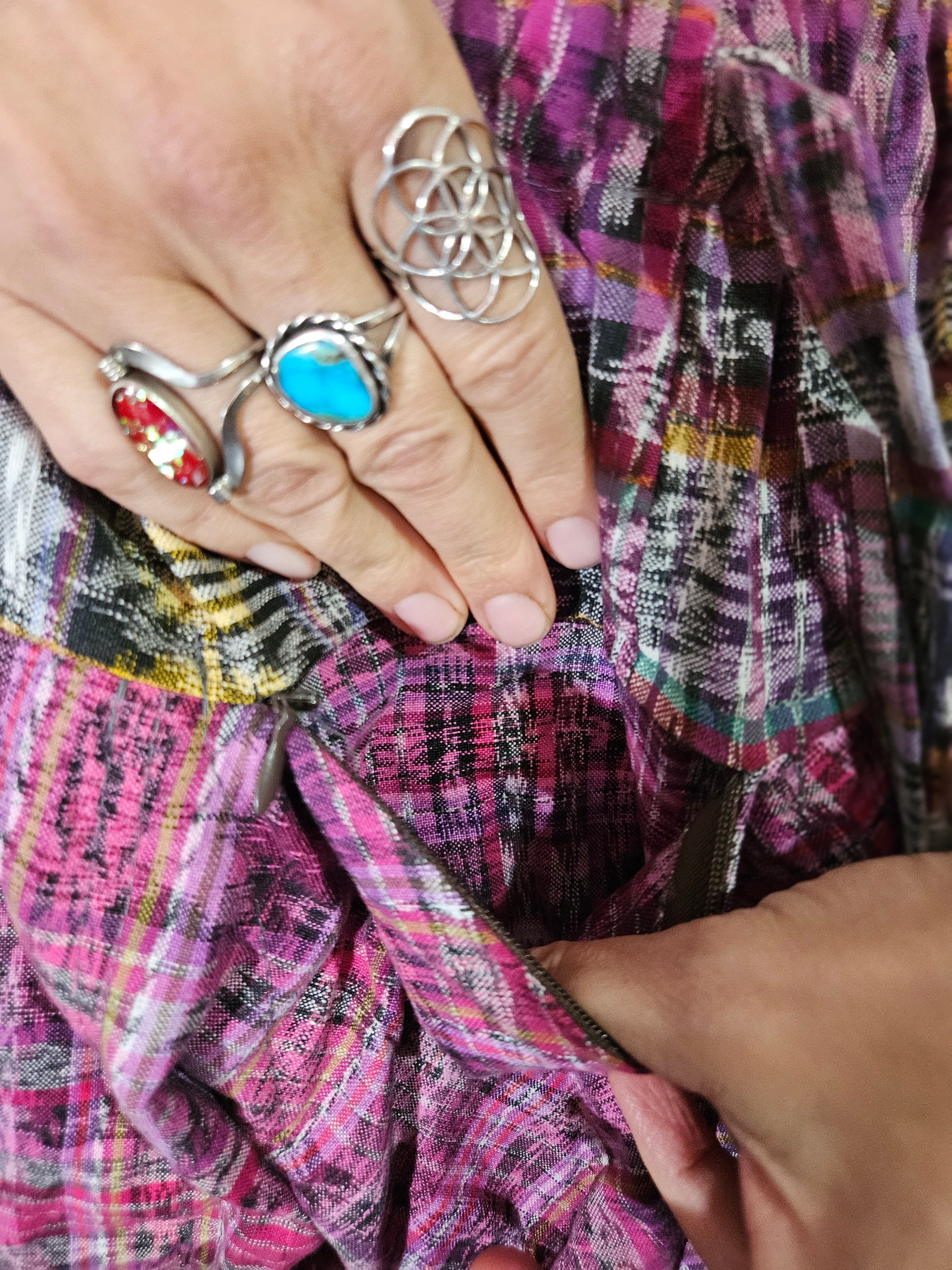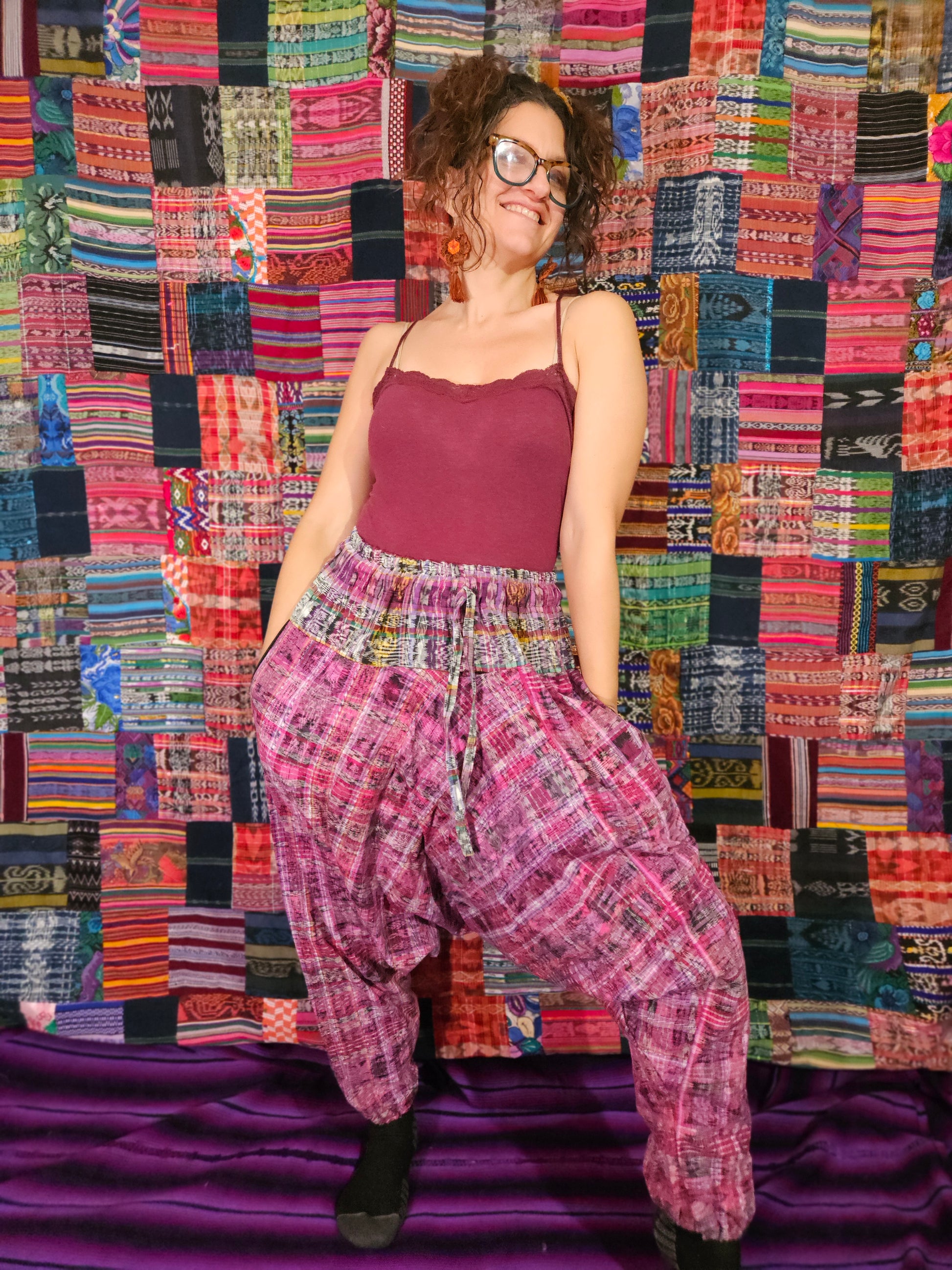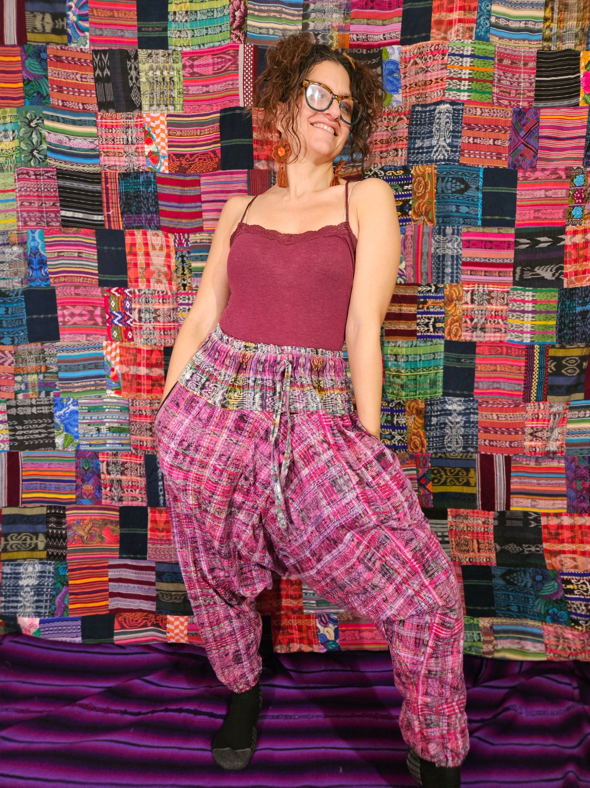 Looking for a unique, artsy, and funky addition to your festival wardrobe? Look no further than Moksha Moda's ethically crafted Harem Pants! These one-of-a-kind wearable works of art are crafted with beautiful upcycled traditional hand-woven Mayan skirts called cortes sourced from second-hand markets in Guatemala. Each fabric gem has its own story, making every harem pants a wearable work of art with a new journey to embark on. The pants include an elastic waist, drawstring, elastic leg cuffs, with three zipper pockets, two of which are lined with velvet.