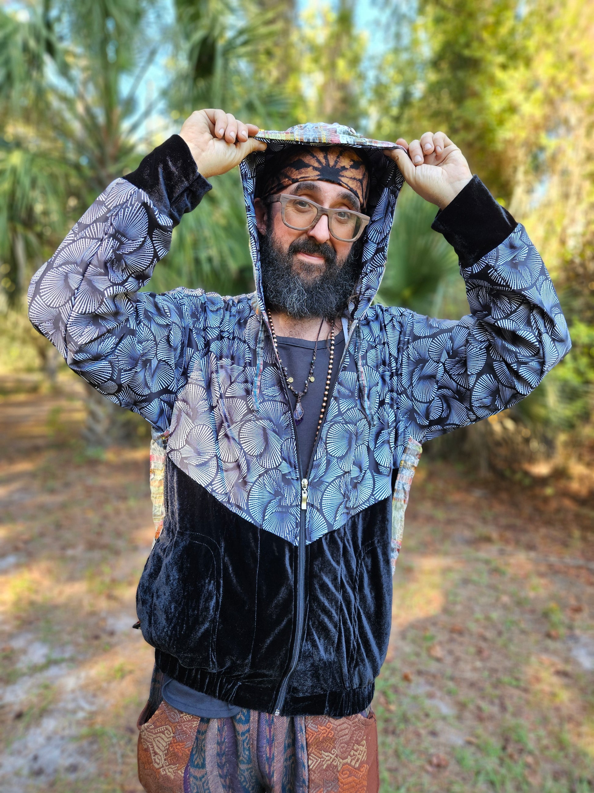 Funk up Your Vibe with this light weight long sleeve hooded jacket from Moksha Moda that is ethically crafted in Guatemala with beautiful upcycled hand woven Mayan fabrics, elegant black velvet, and an abstain black and white polyester print. This one of a kind unisex jacket also features an elastic waist, thumb holes on the sleeves, and three pockets including one in the hood.