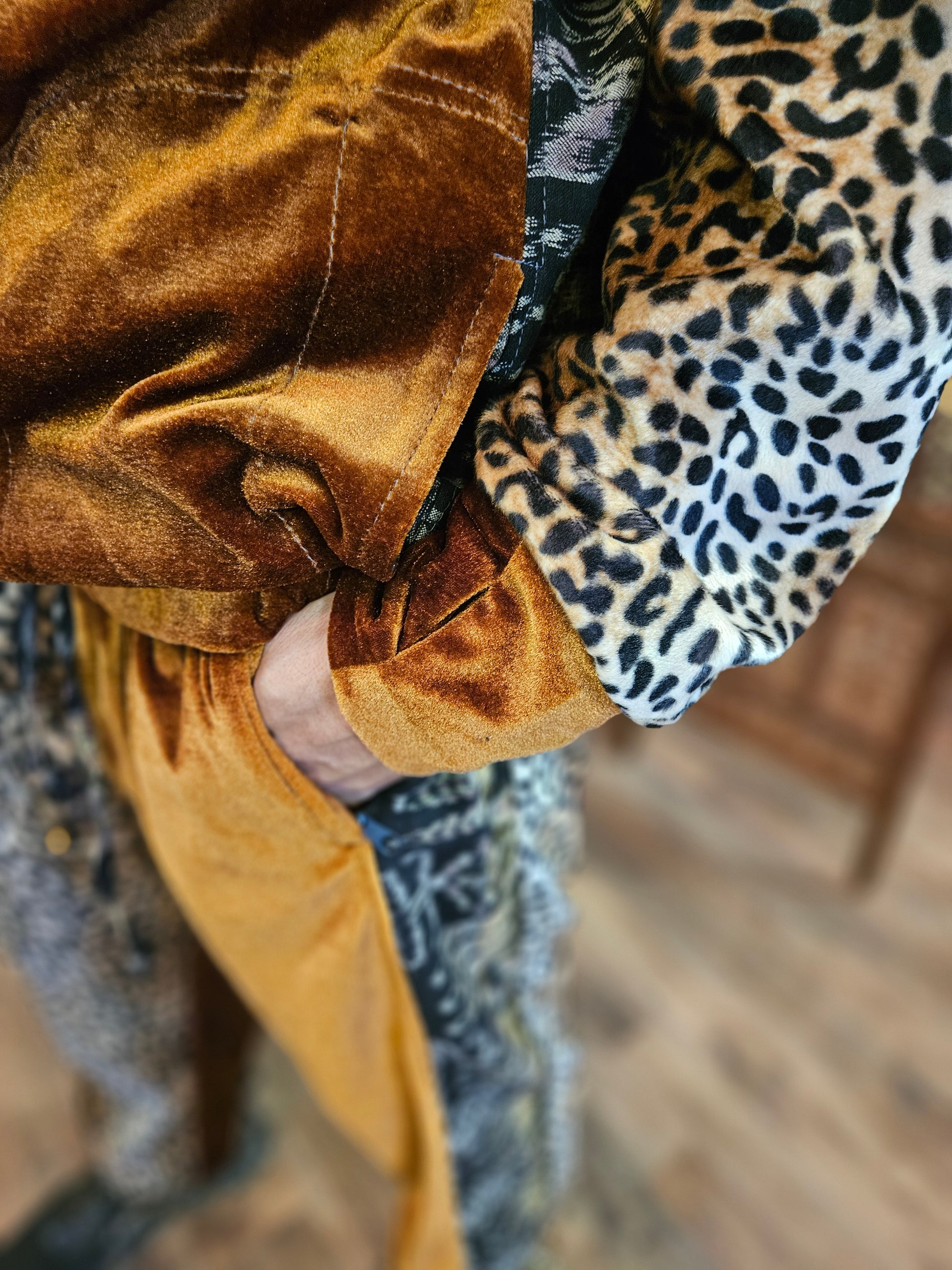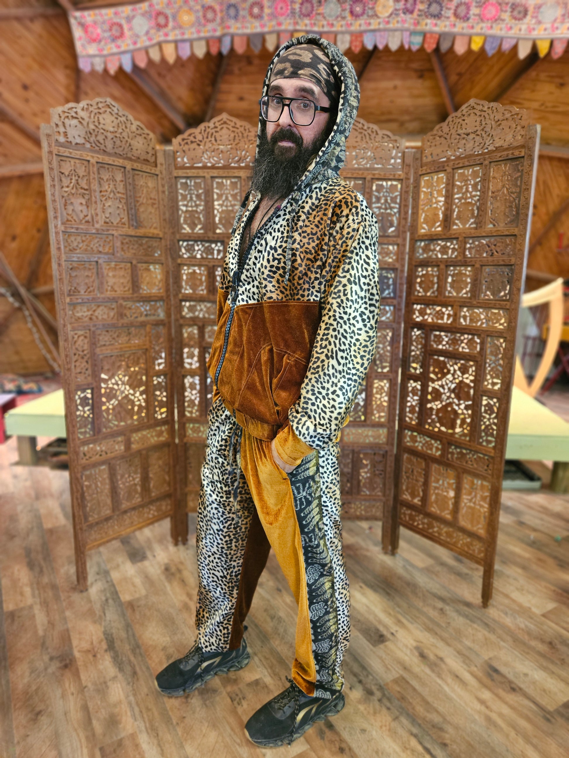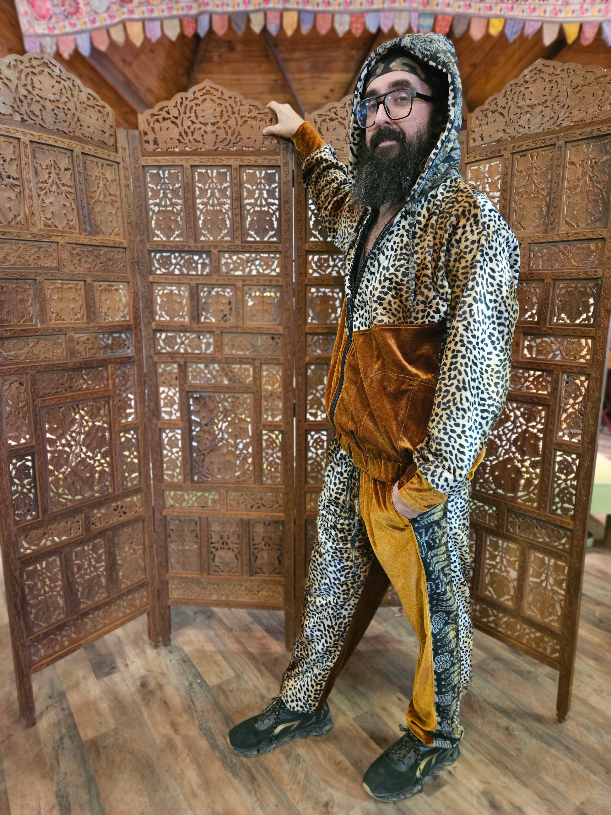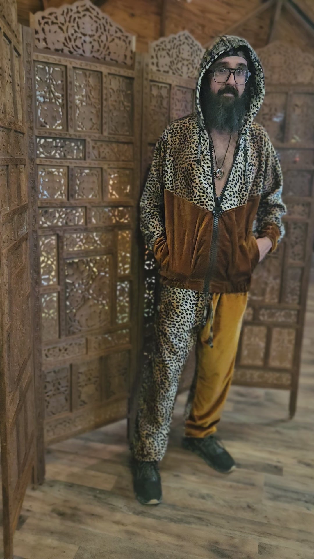 Funk up Your Vibe & Liberate Your Fashion with this super heady one of a kind Jogger Fit by Moksha Moda. The jogger fit is ethically crafted with upcycled hand woven Mayan fabrics from Guatemala for the detail, elegant velvet, and super vibrant faux leopard short hair fur. This one of a kind jogger fit also features three pockets in the jacket including a velcro pocket in the hood, ridiculously large zipper, thumb holes in the sleeves, and three zipper pockets in the joggers.