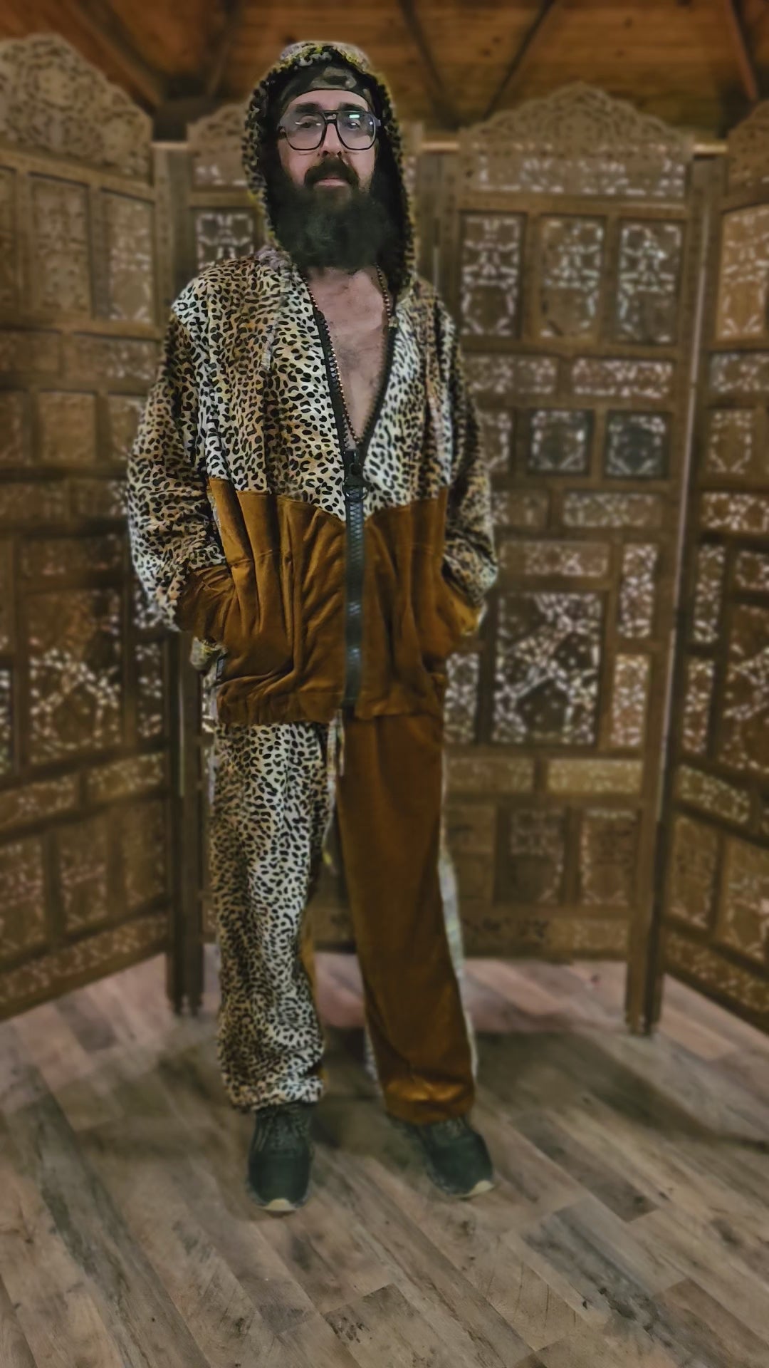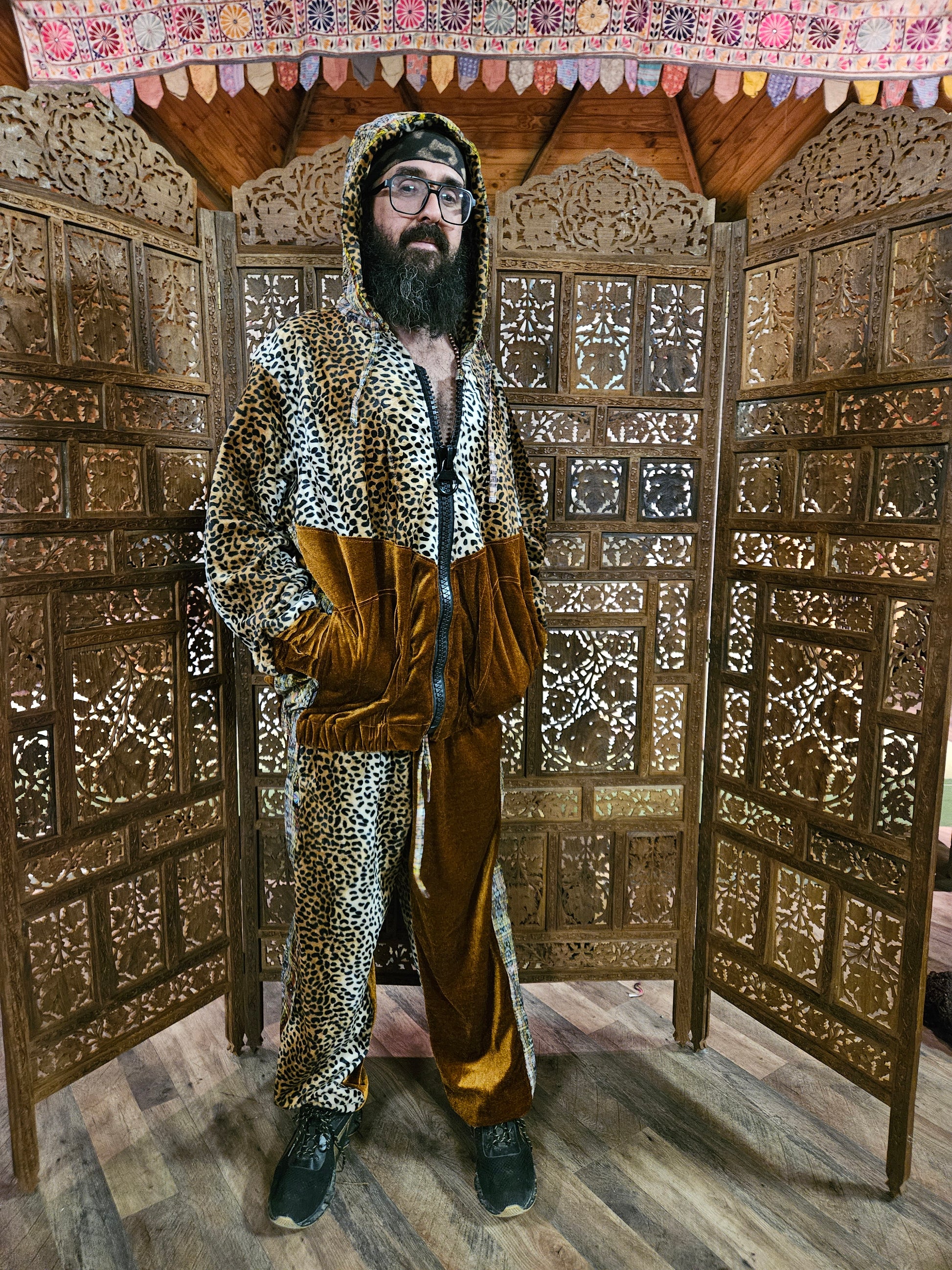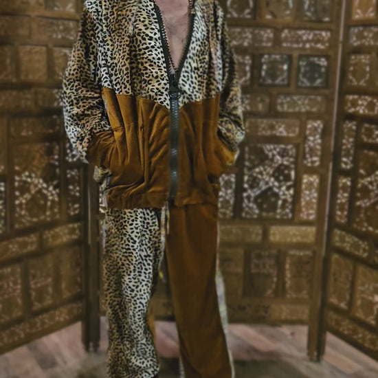 Funk up Your Vibe & Liberate Your Fashion with this super heady one of a kind Jogger Fit by Moksha Moda. The jogger fit is ethically crafted with upcycled hand woven Mayan fabrics from Guatemala for the detail, elegant velvet, and super vibrant faux leopard short hair fur. This one of a kind jogger fit also features three pockets in the jacket including a velcro pocket in the hood, ridiculously large zipper, and three zipper pockets in the joggers.