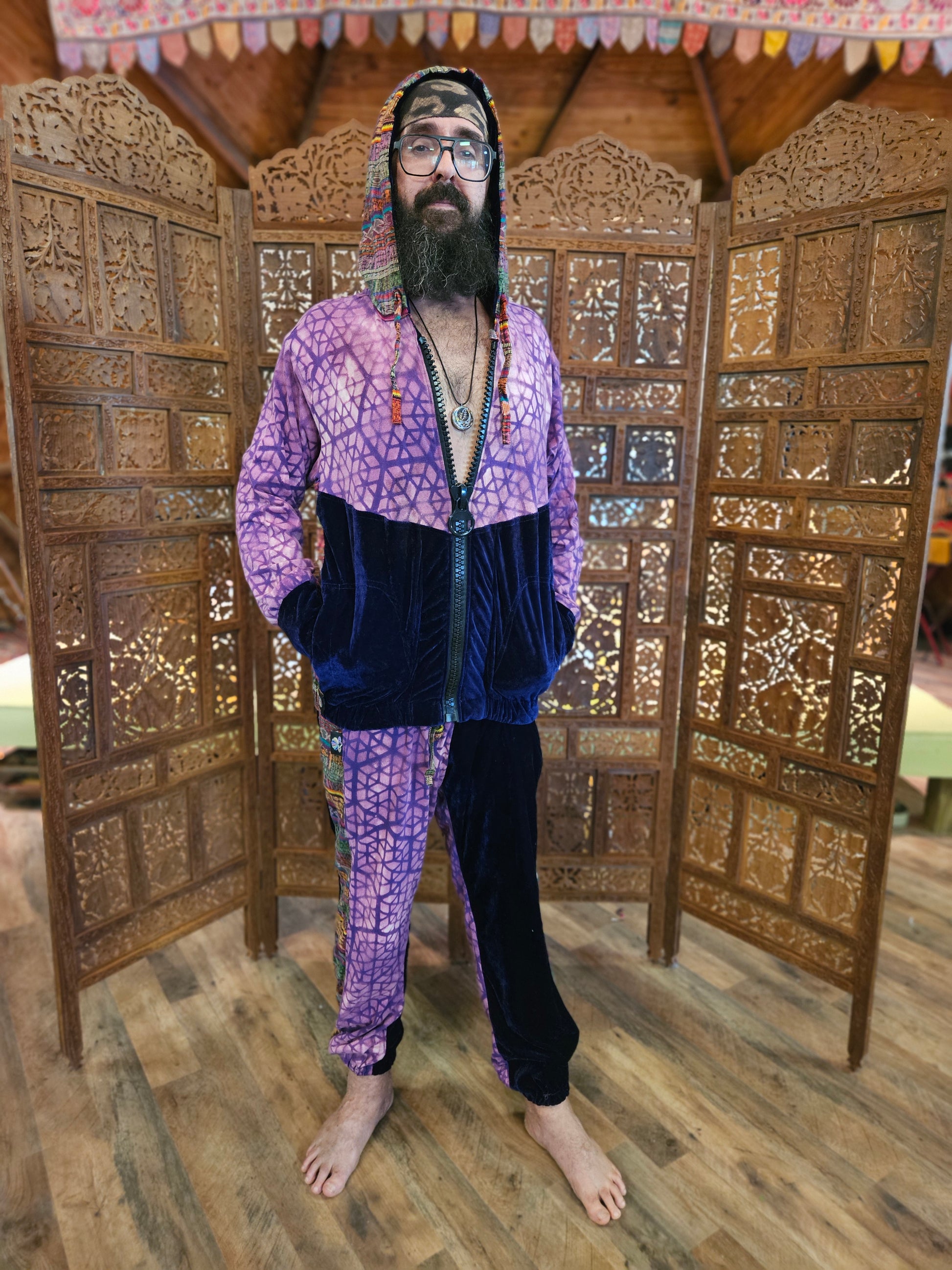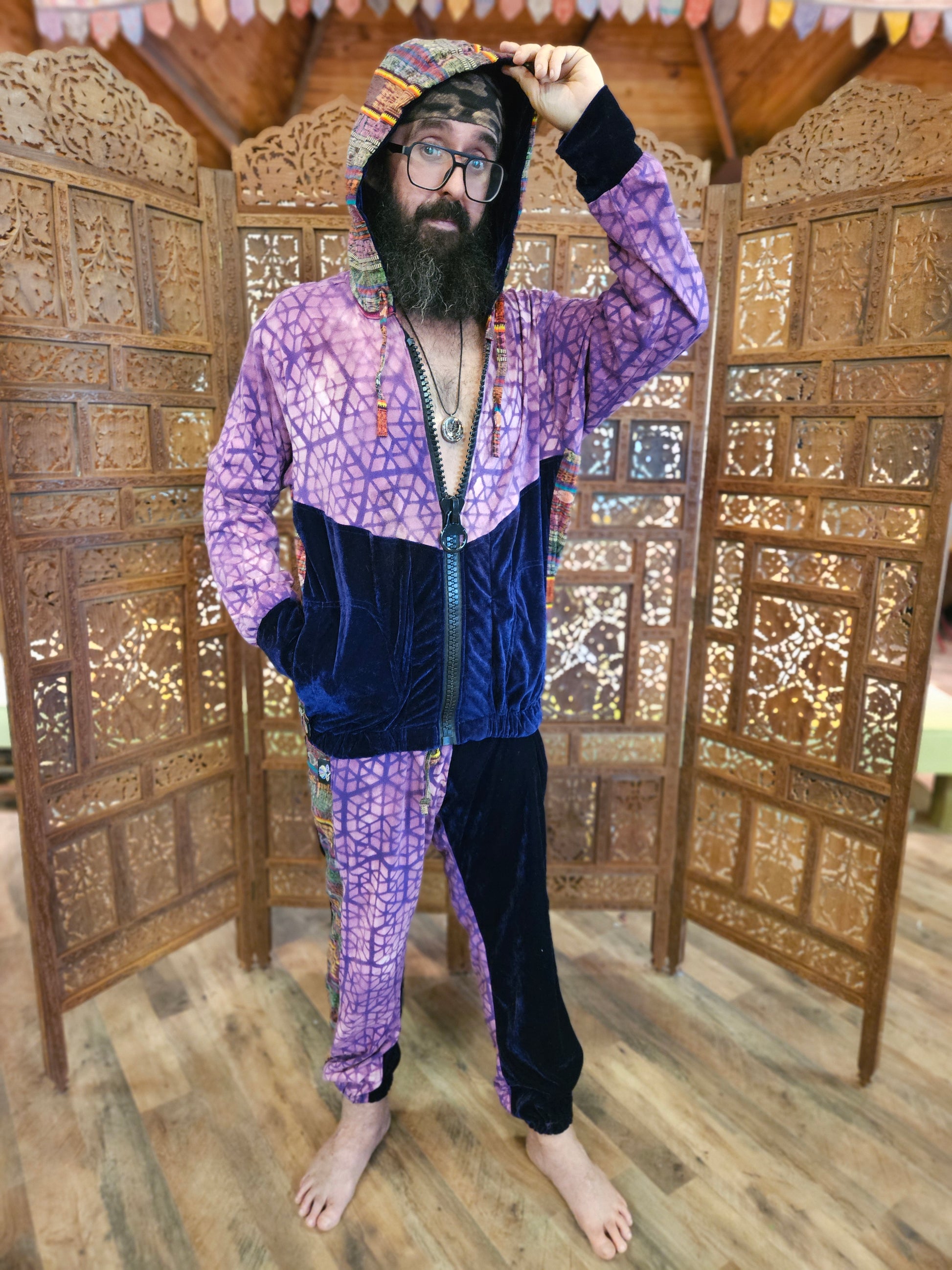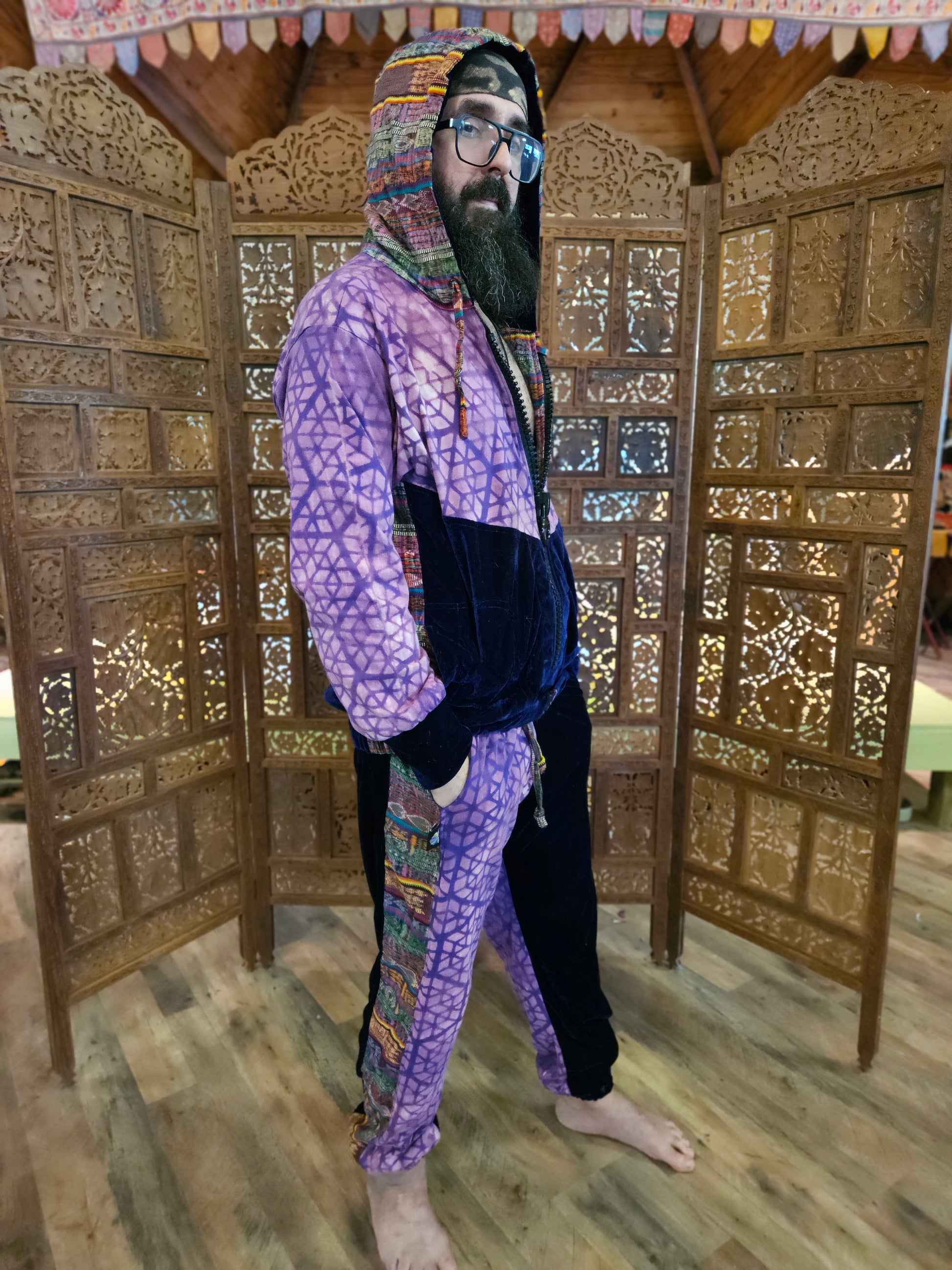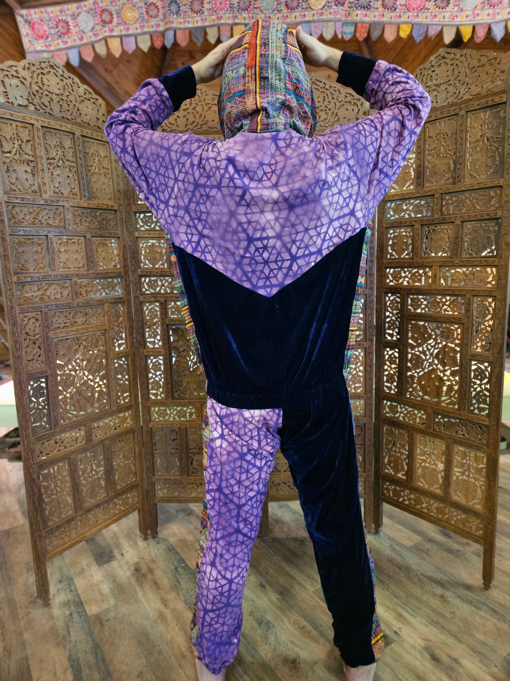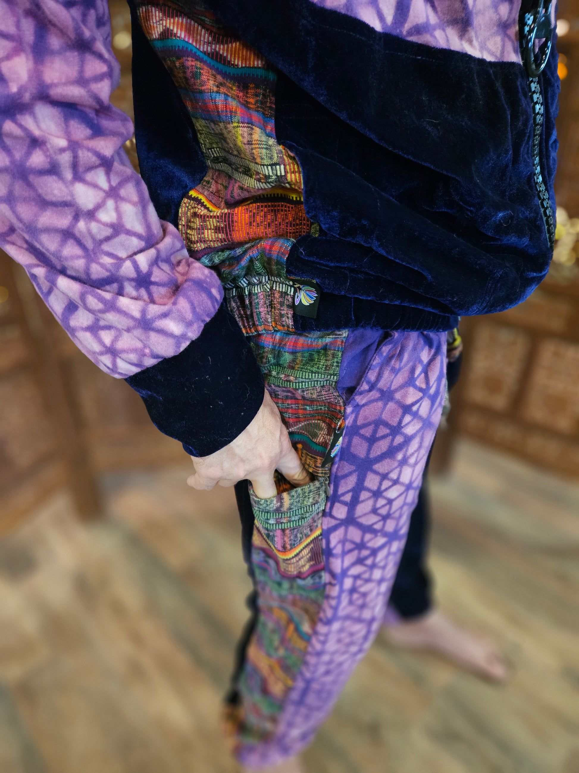 Funk up Your Vibe & Liberate Your Fashion with this super heady one of a kind collab Jogger Fit by Moksha Moda & Jenzified Designs. The jogger fit is ethically crafted with upcycled hand woven Mayan fabrics from Guatemala for the detail, elegant velvet, and super soft breathable jersey that is then shipped to Jenzified Designs in Maine for her to hand bleach stencil. This one of a kind jogger fit also features three pockets in the jacket including a velcro pocket in the hood, ridiculously large zipper, thumb holes in the sleeves, and three pockets in the joggers.
