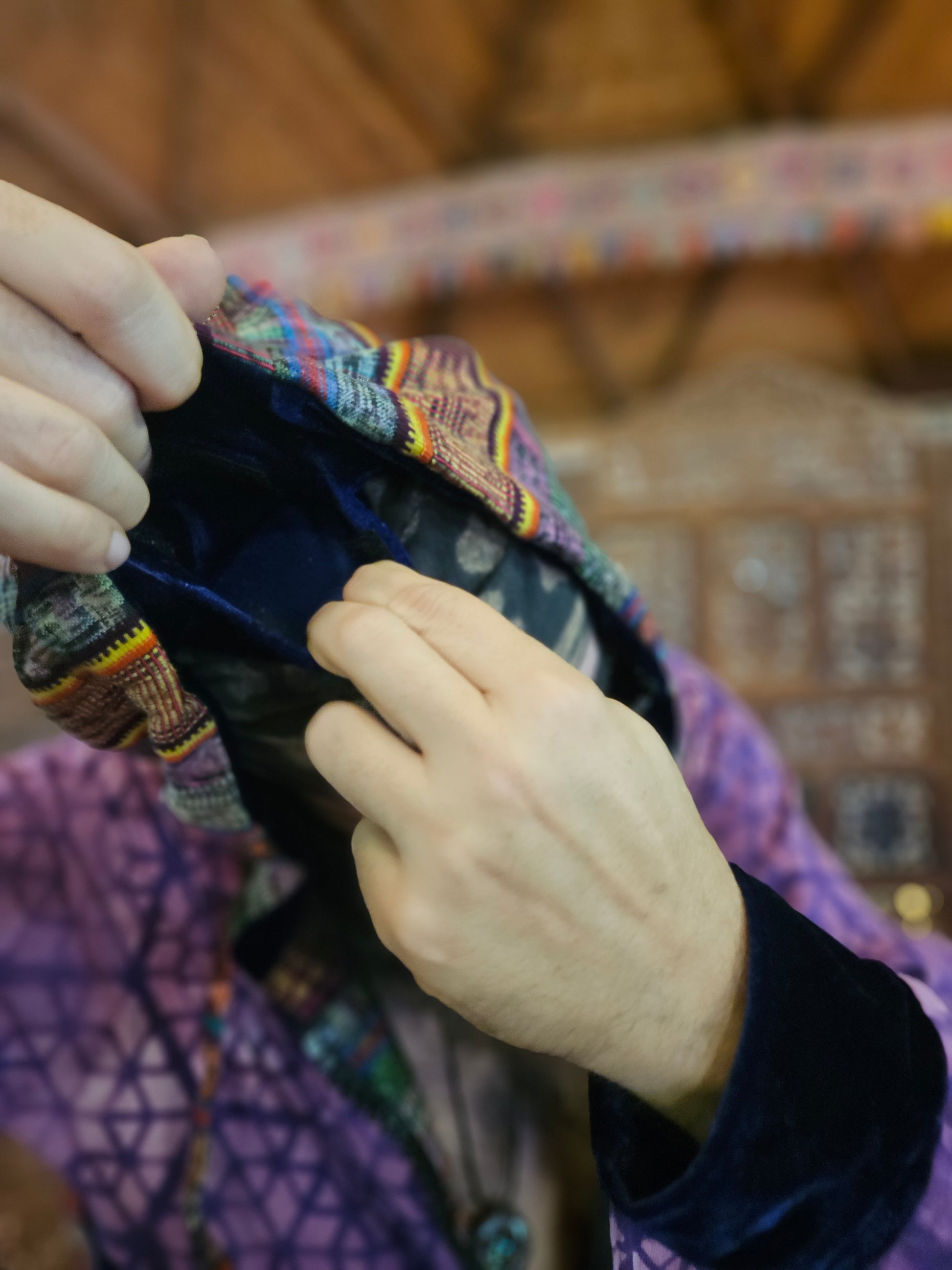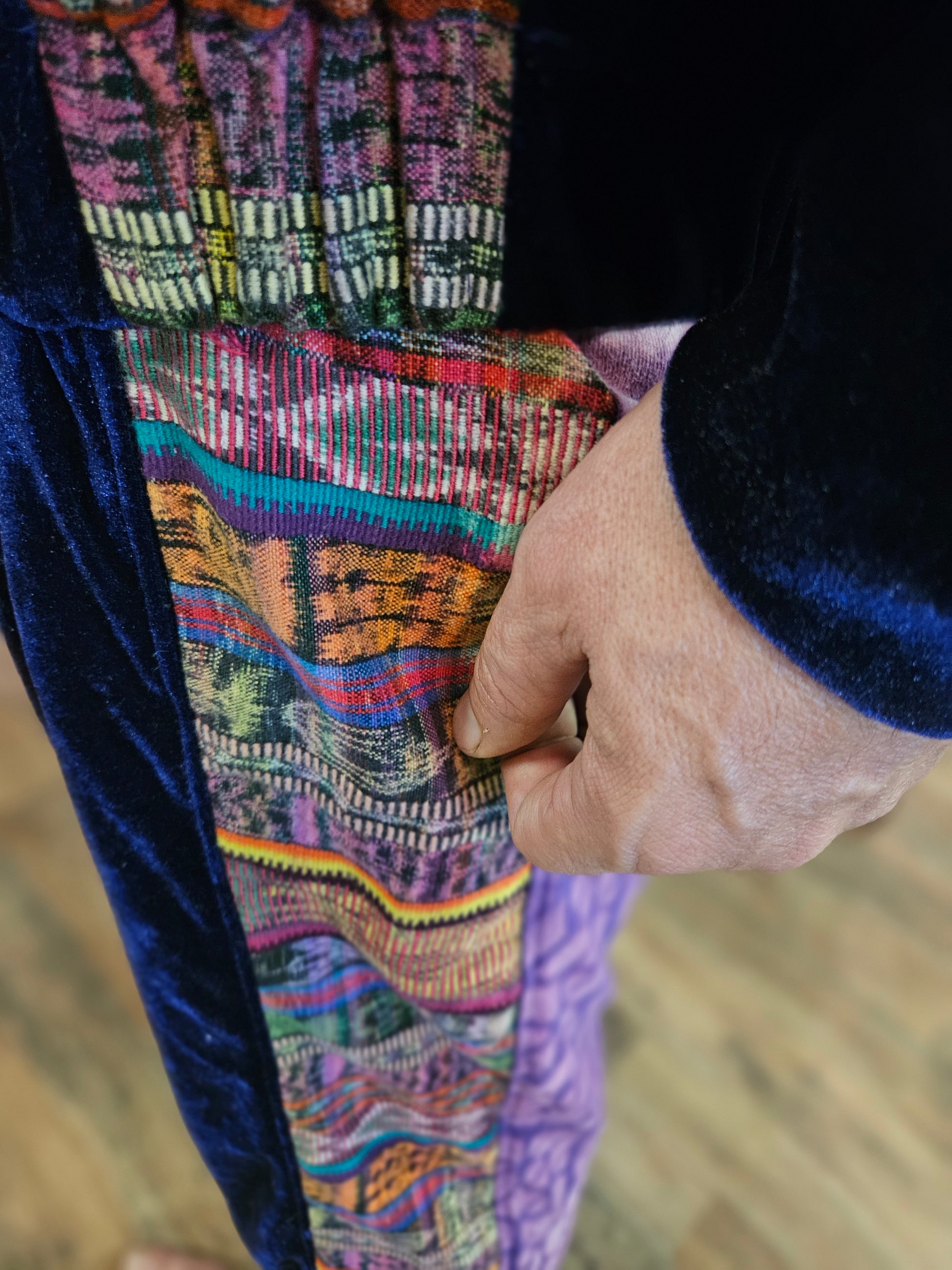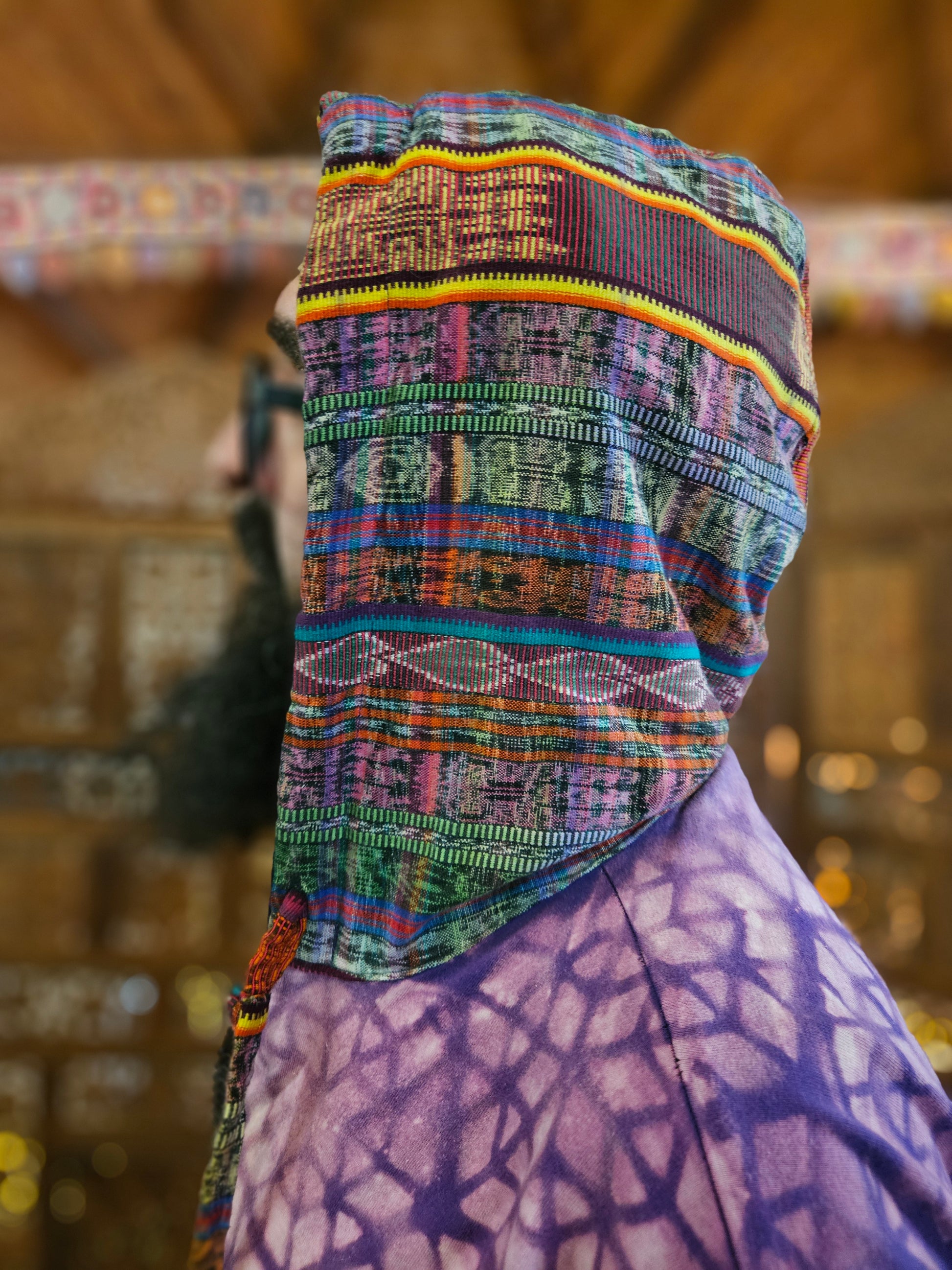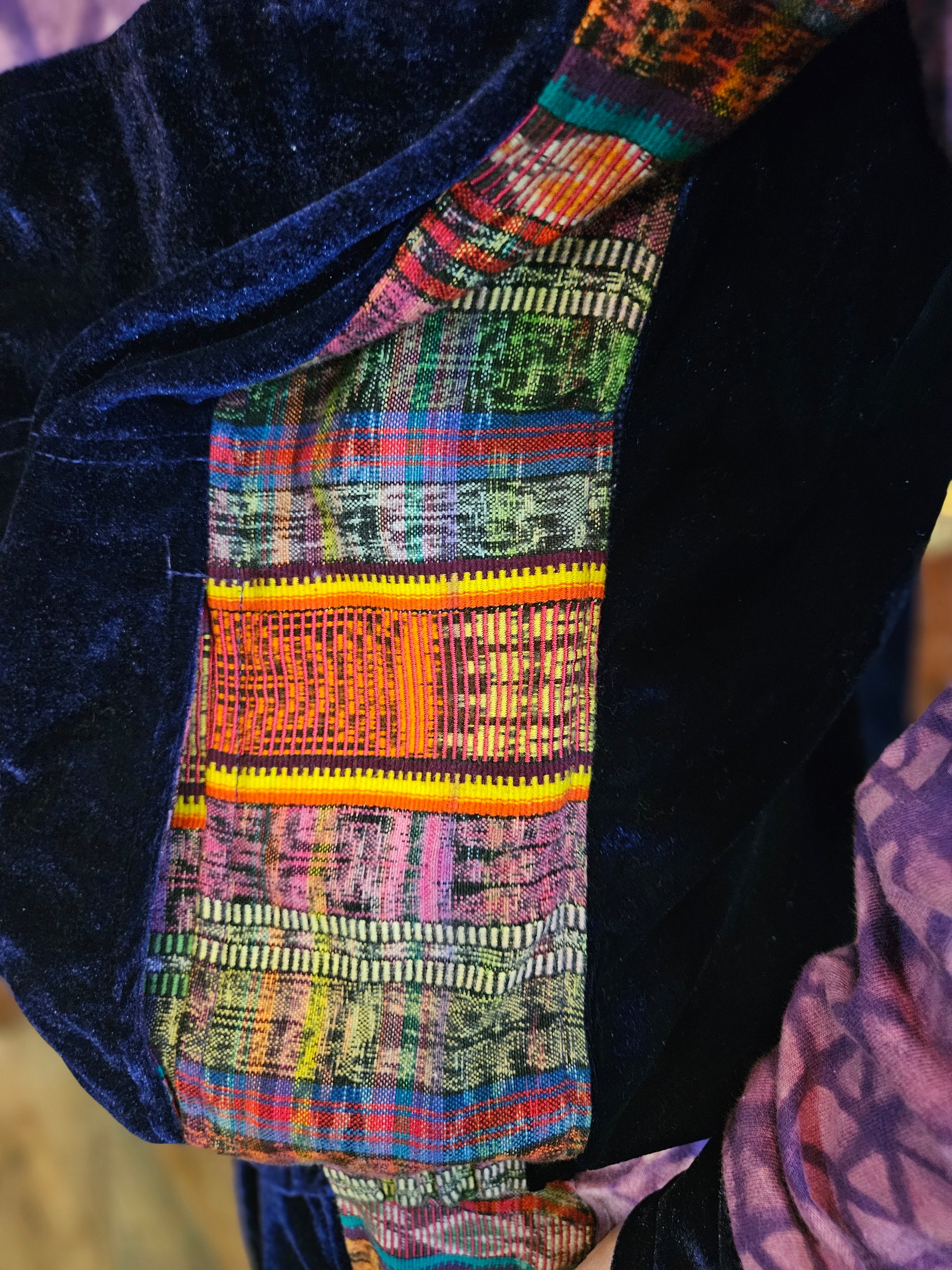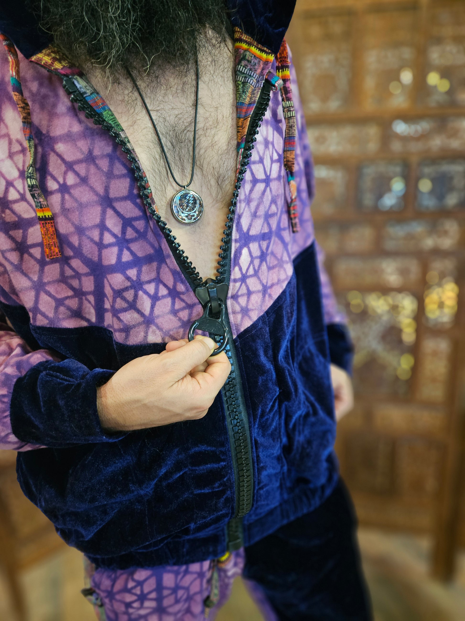 Funk up Your Vibe & Liberate Your Fashion with this super heady one of a kind collab Jogger Fit by Moksha Moda & Jenzified Designs. The jogger fit is ethically crafted with upcycled hand woven Mayan fabrics from Guatemala for the detail, elegant velvet, and super soft breathable jersey that is then shipped to Jenzified Designs in Maine for her to hand bleach stencil. This one of a kind jogger fit also features three pockets in the jacket including a velcro pocket in the hood, ridiculously large zipper, thumb holes in the sleeves, and three pockets in the joggers.