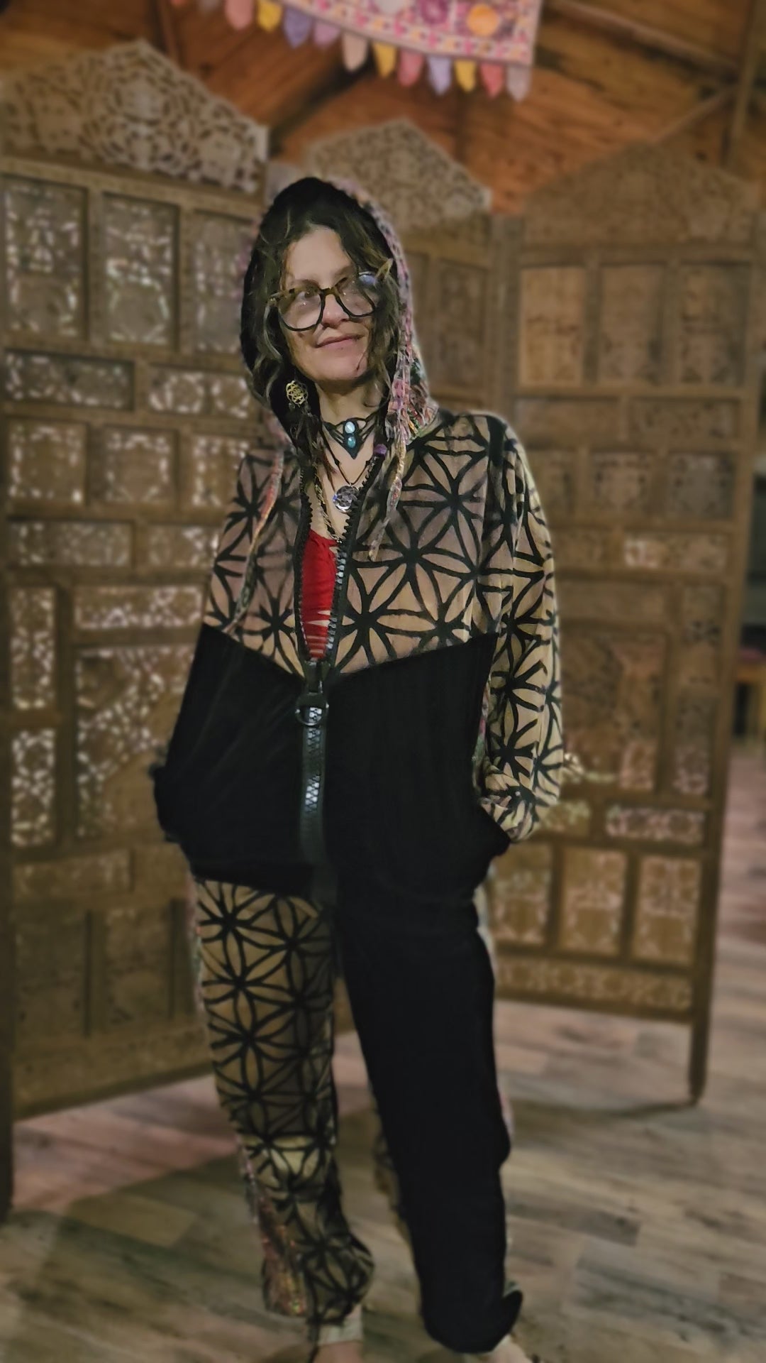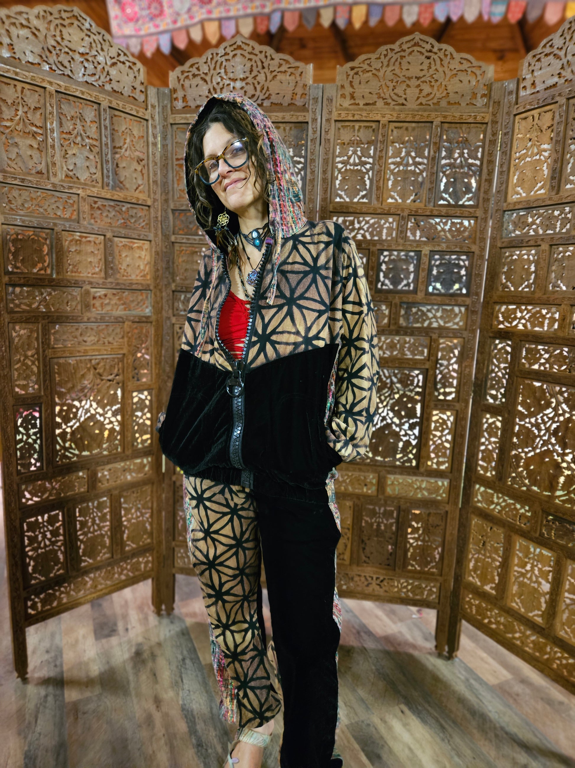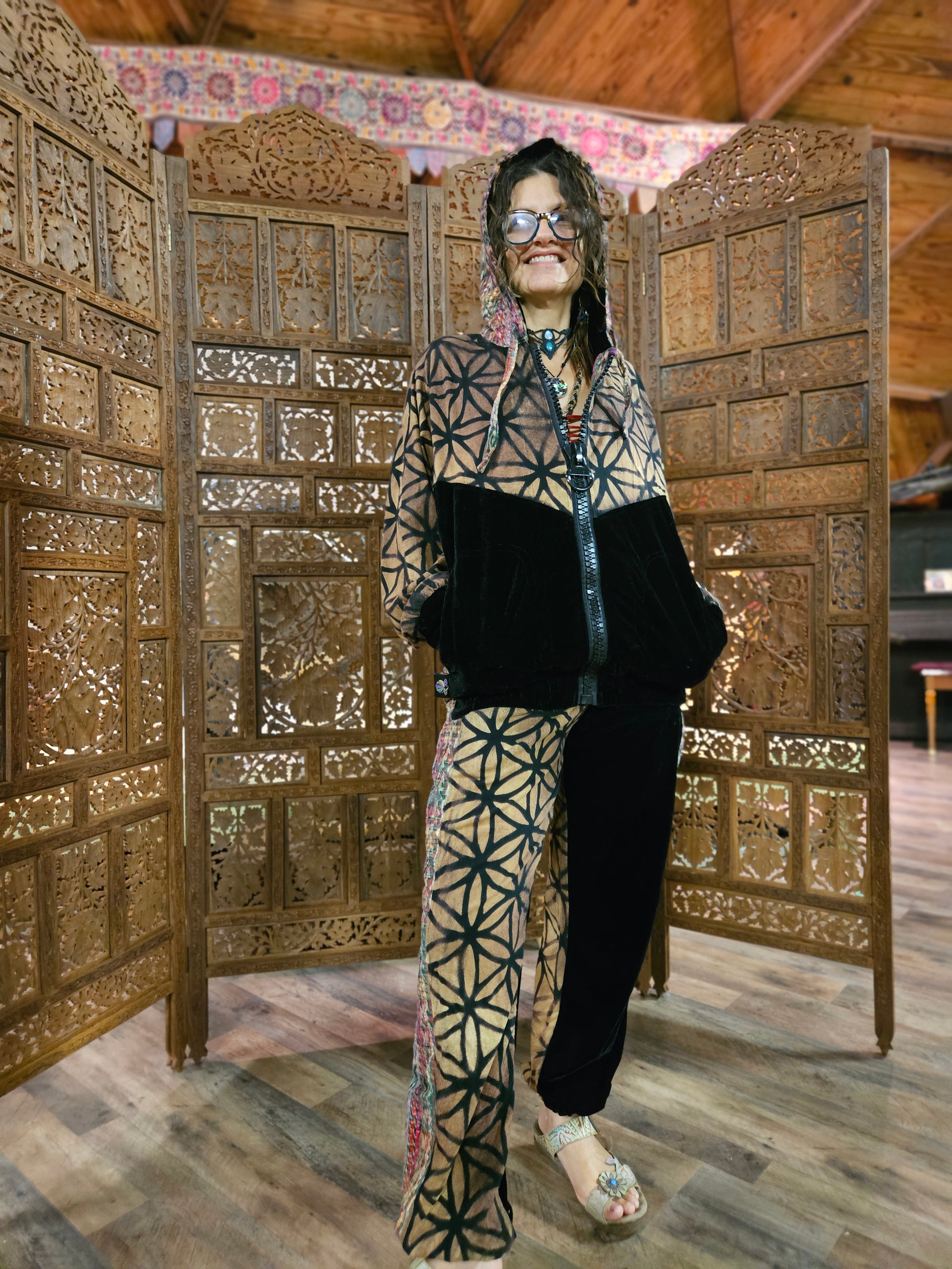 Funk up Your Vibe & Liberate Your Fashion with this super heady one of a kind collab Jogger Fit by Moksha Moda & Jenzified Designs. The jogger fit is ethically crafted with upcycled hand woven Mayan fabrics from Guatemala for the detail, elegant velvet, and super soft breathable jersey that is then shipped to Jenzified Designs in Maine for her to hand bleach stencil. This one of a kind jogger fit also features three pockets in the jacket including a velcro pocket in the hood, ridiculously large zipper, thumb holes in the sleeves, and three pockets in the joggers.