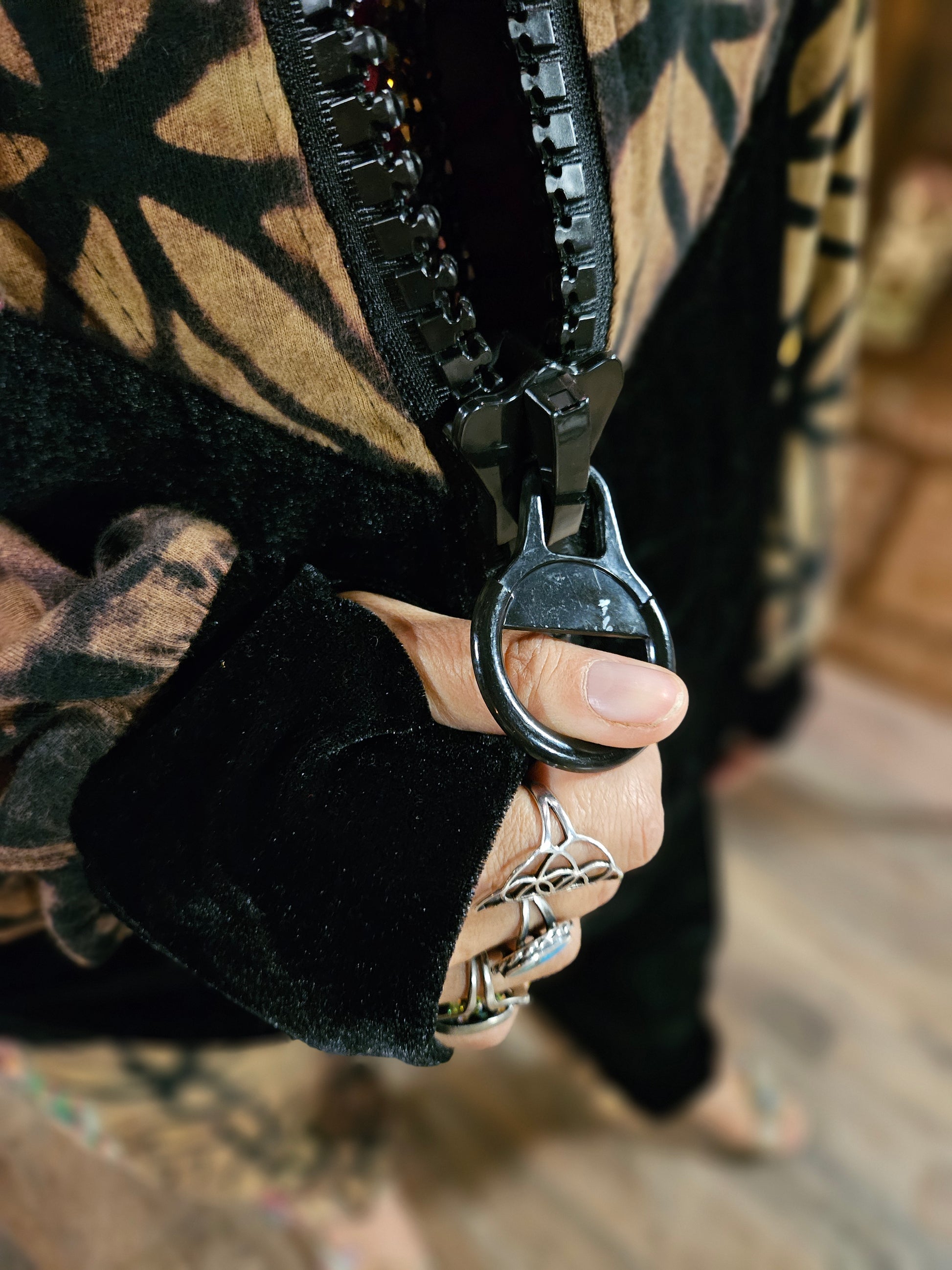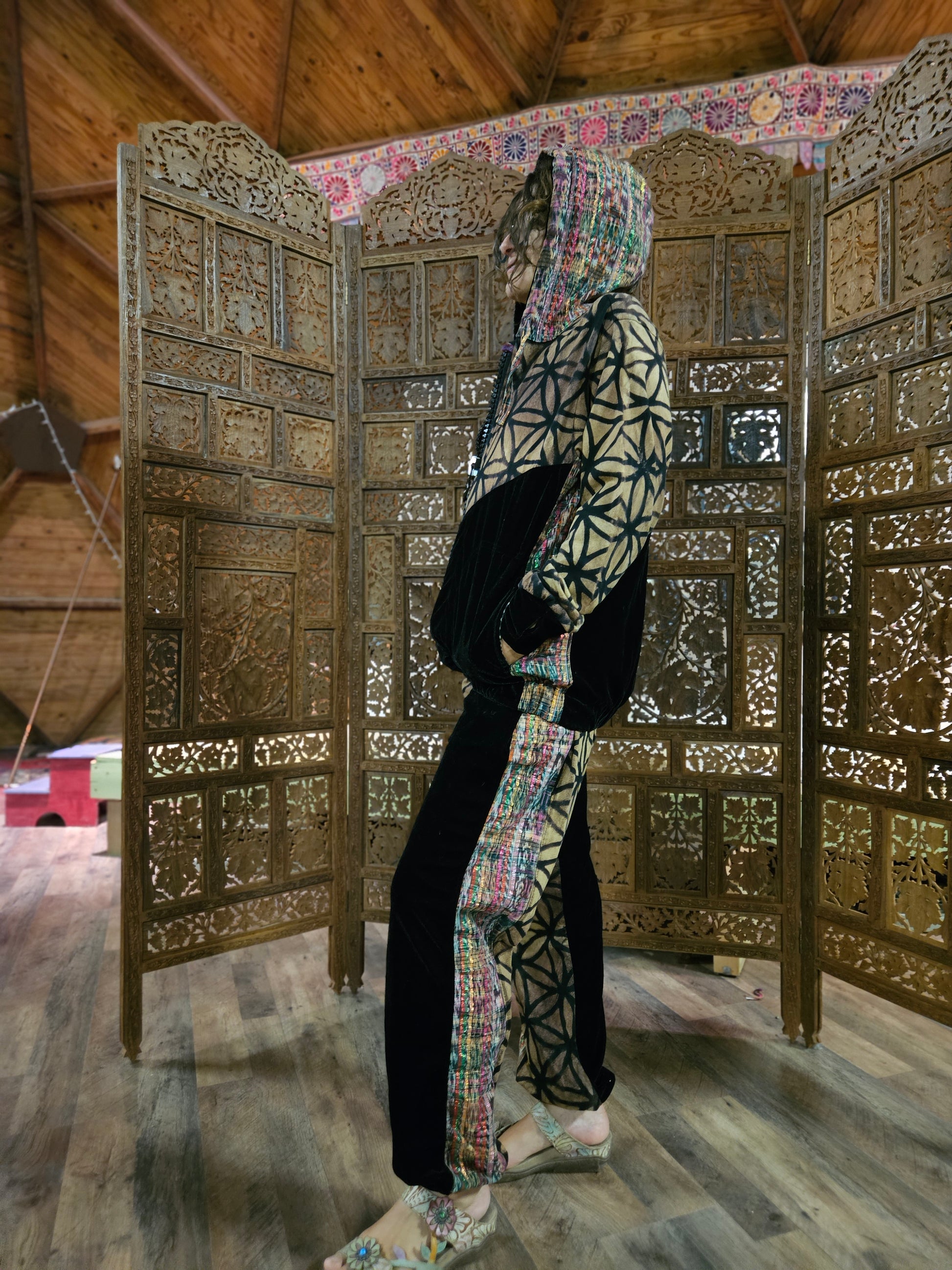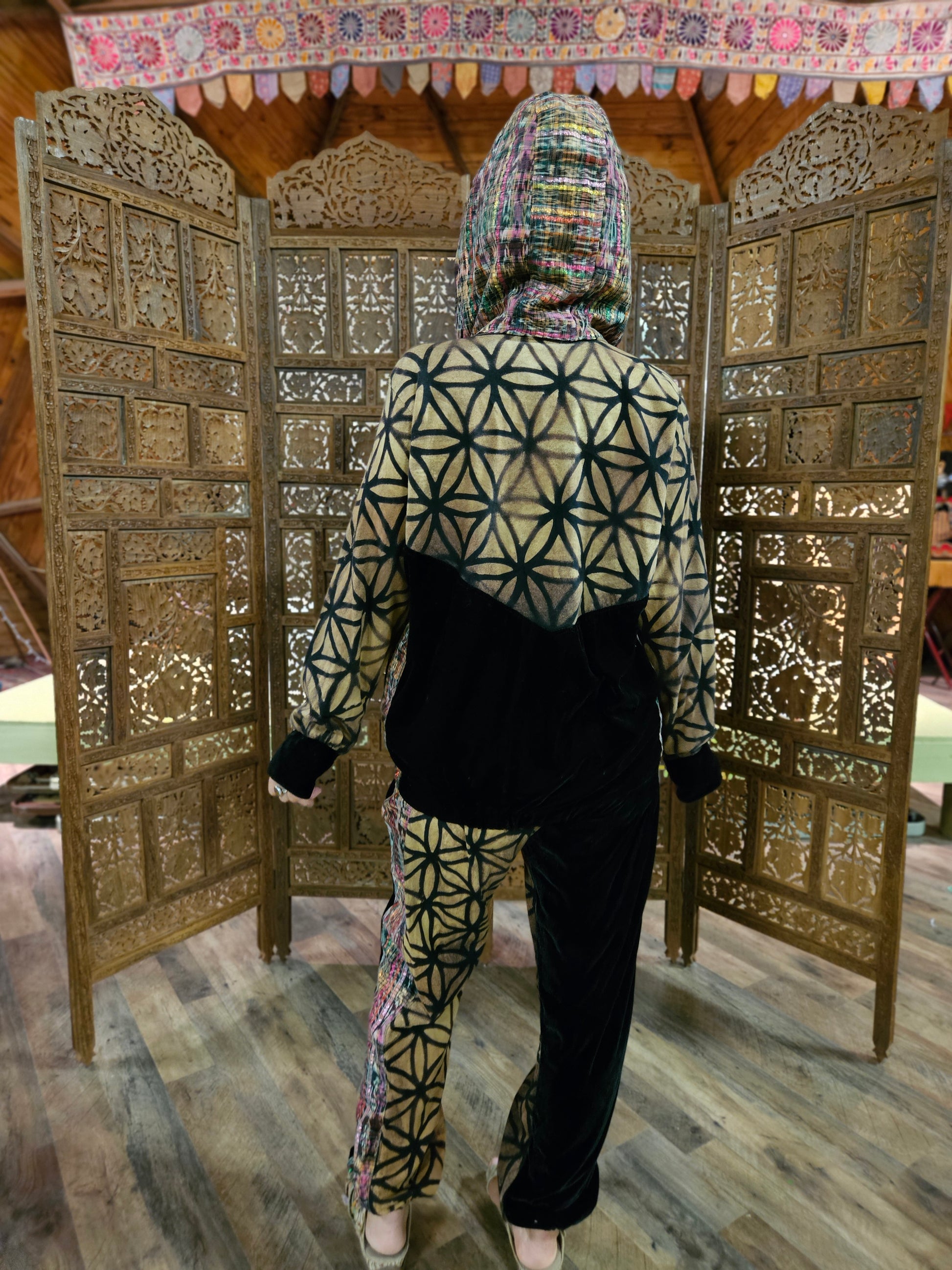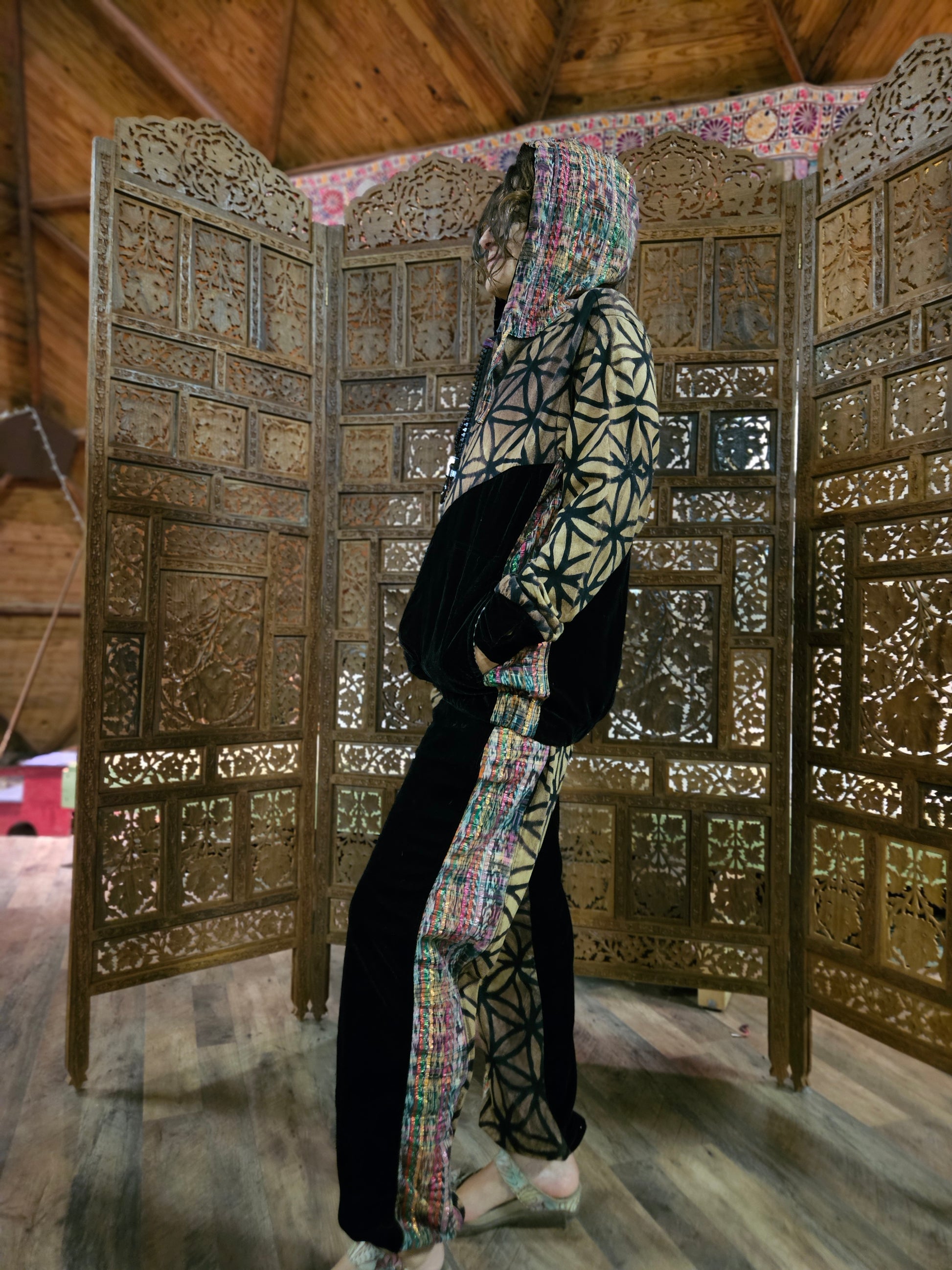 Funk up Your Vibe & Liberate Your Fashion with this super heady one of a kind collab Jogger Fit by Moksha Moda & Jenzified Designs. The jogger fit is ethically crafted with upcycled hand woven Mayan fabrics from Guatemala for the detail, elegant velvet, and super soft breathable jersey that is then shipped to Jenzified Designs in Maine for her to hand bleach stencil. This one of a kind jogger fit also features three pockets in the jacket including a velcro pocket in the hood, ridiculously large zipper, thumb holes in the sleeves, and three pockets in the joggers.