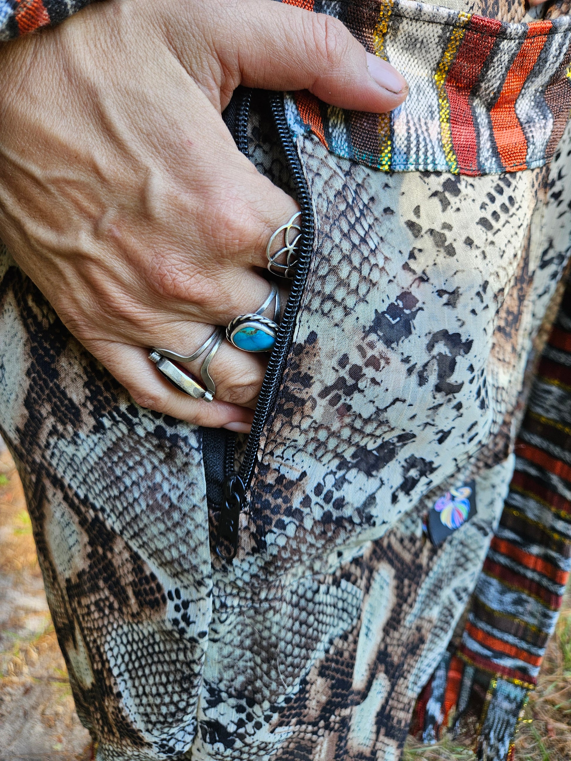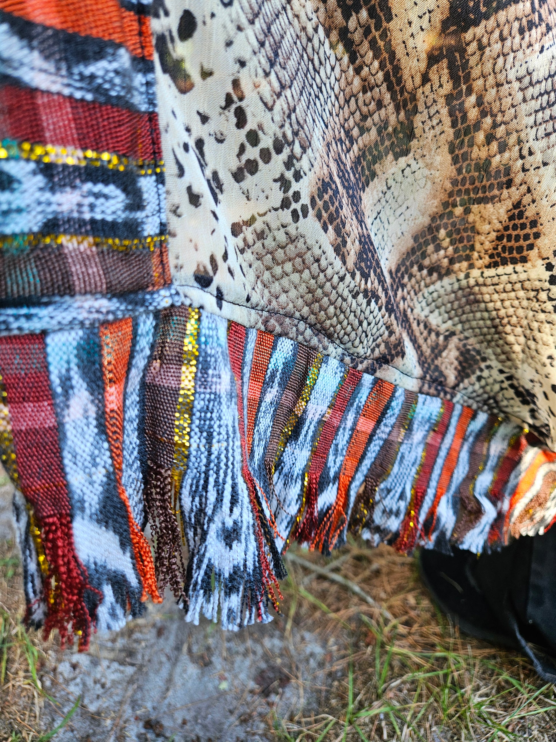 Funk Up Your Vibe & Liberate Your Fashion with this vibrant and flowy kimono by Moksha Moda. This one of a kind kimono is ethically crafted at Lake Atitlan Guatemala with beautiful upcycled hand woven Mayan fabrics for the detail and fringe with a super vibrant wild chiffon polyester print for the body. The kimono also features a removable belt. Plus keep your possessions secure with the four included pockets, two of which are zipper pockets.