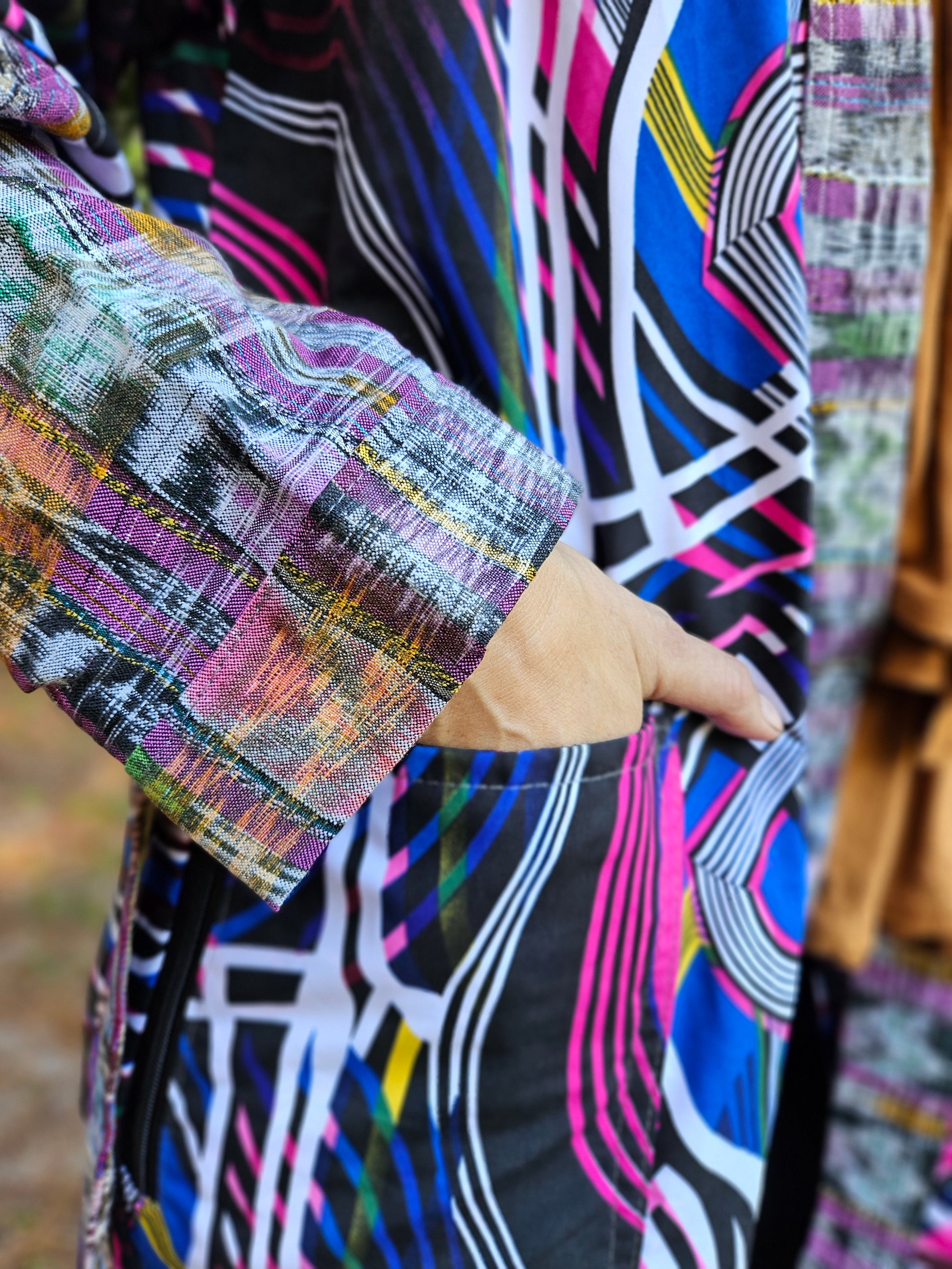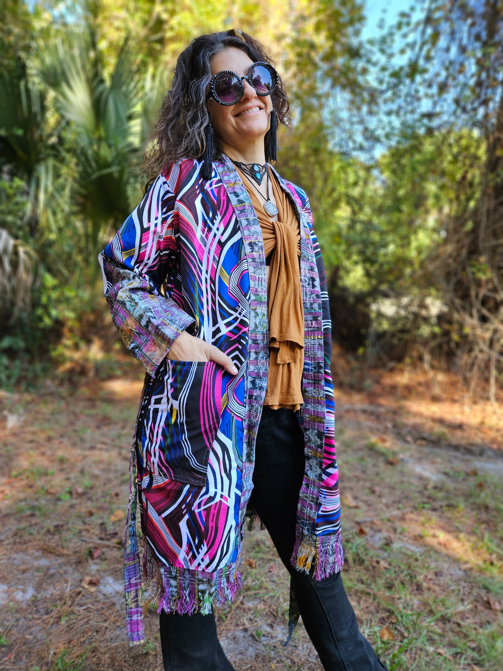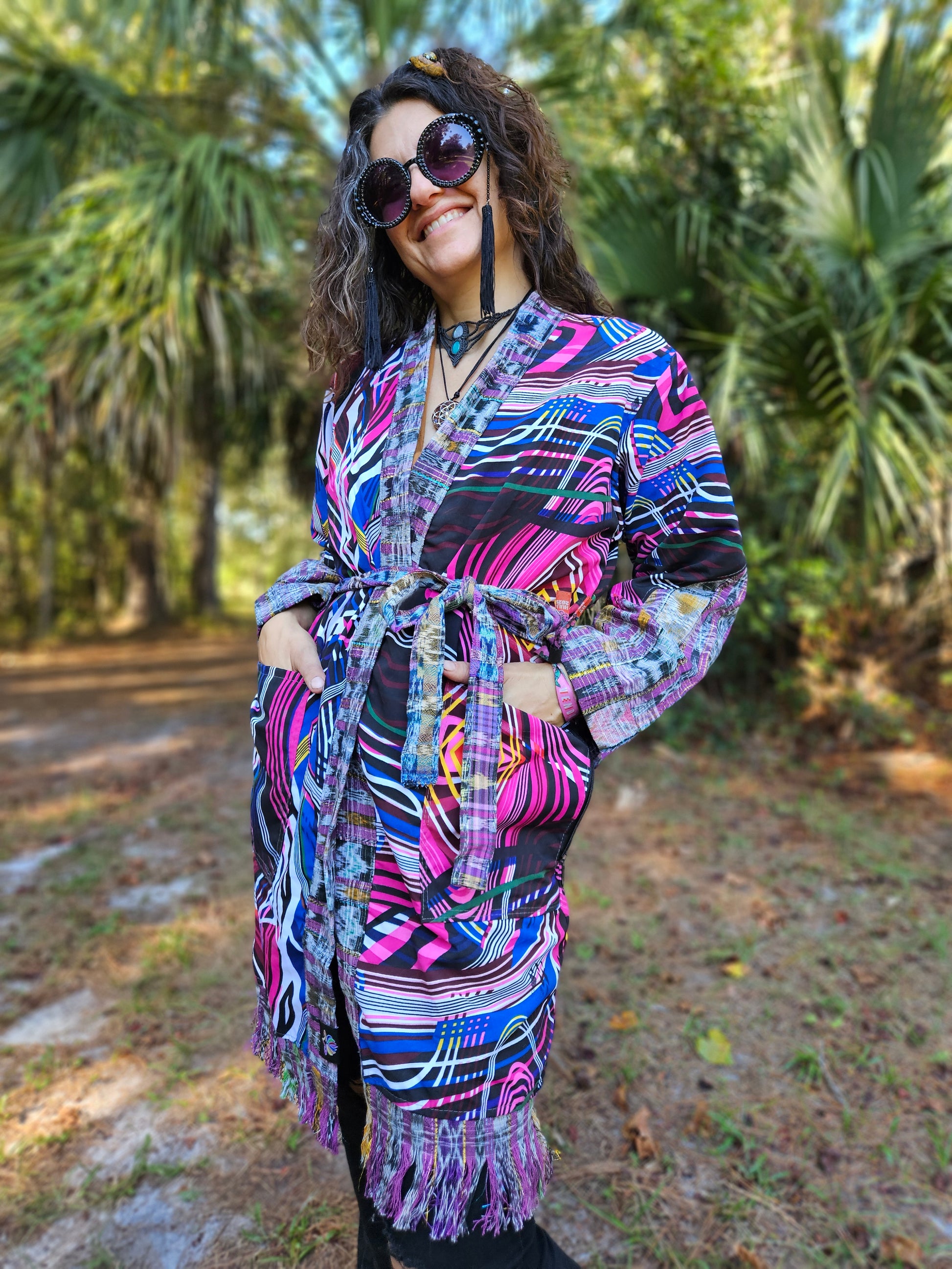 Funk Up Your Vibe & Liberate Your Fashion with this vibrant and flowy kimono by Moksha Moda. This one of a kind kimono is ethically crafted at Lake Atitlan Guatemala with beautiful upcycled hand woven Mayan fabrics for the detail and fringe with a vibrant polyester print for the body. The kimono also features a removable belt. Plus keep your possessions secure with the four included pockets, two of which are zipper pockets.