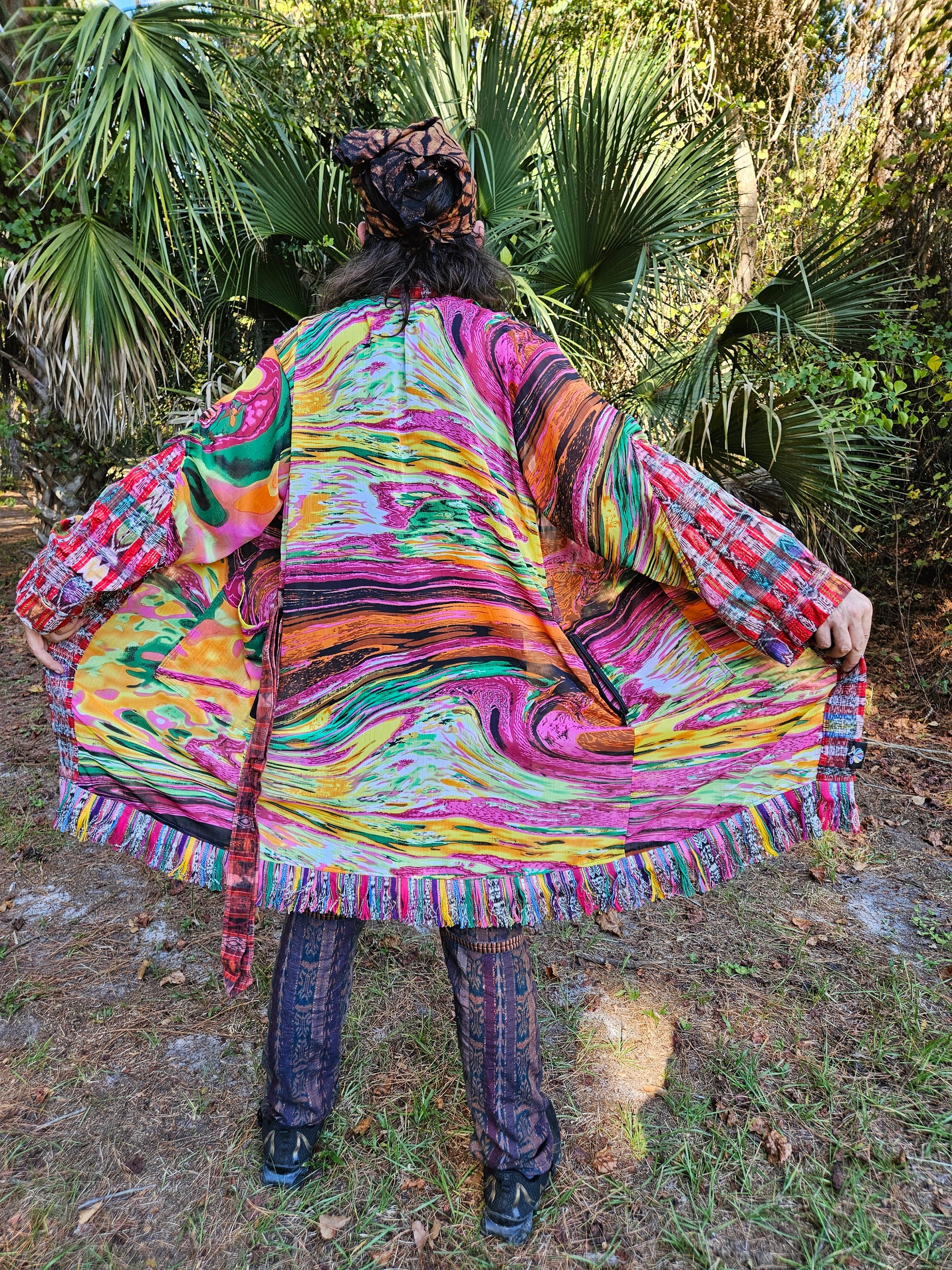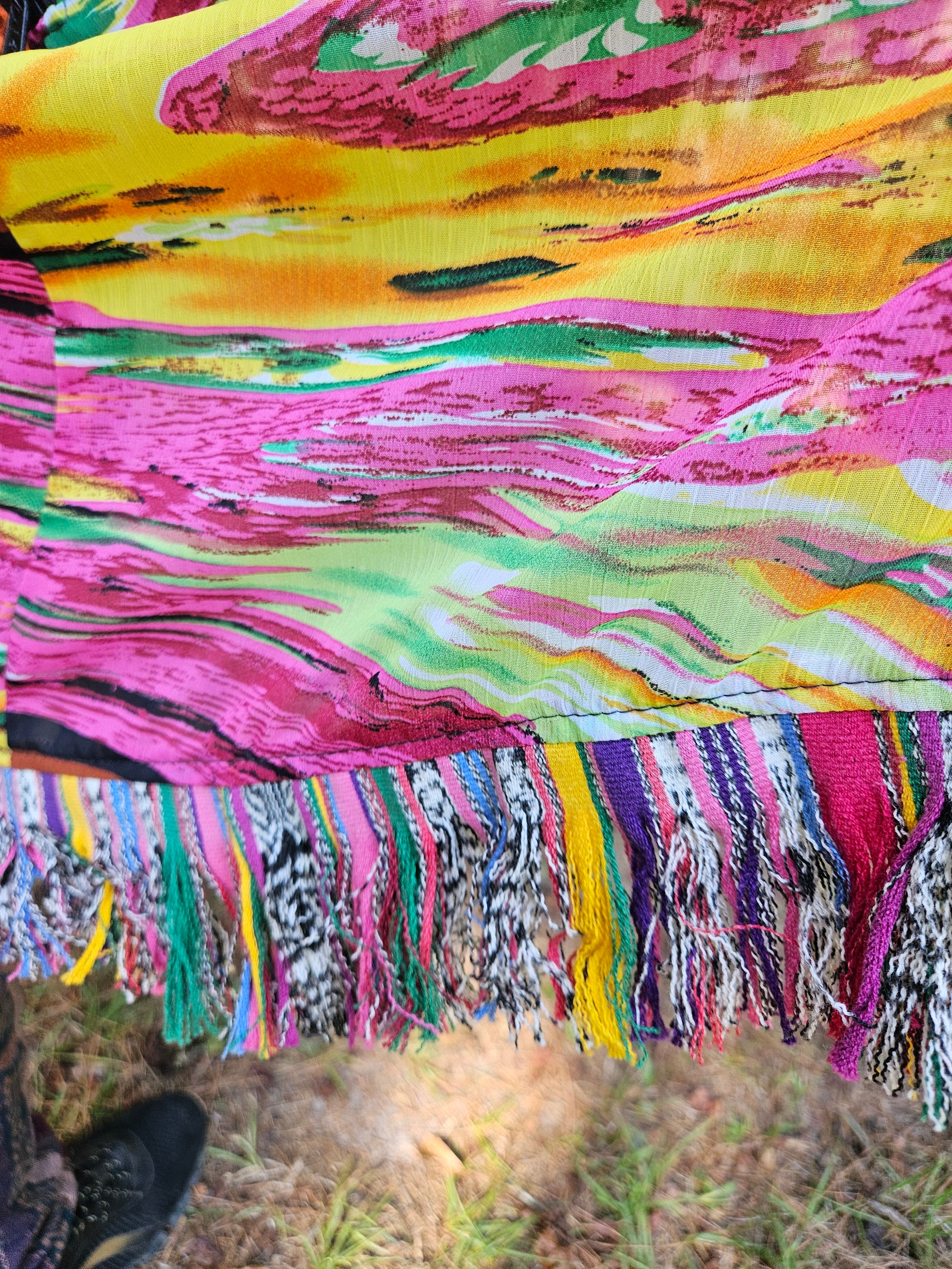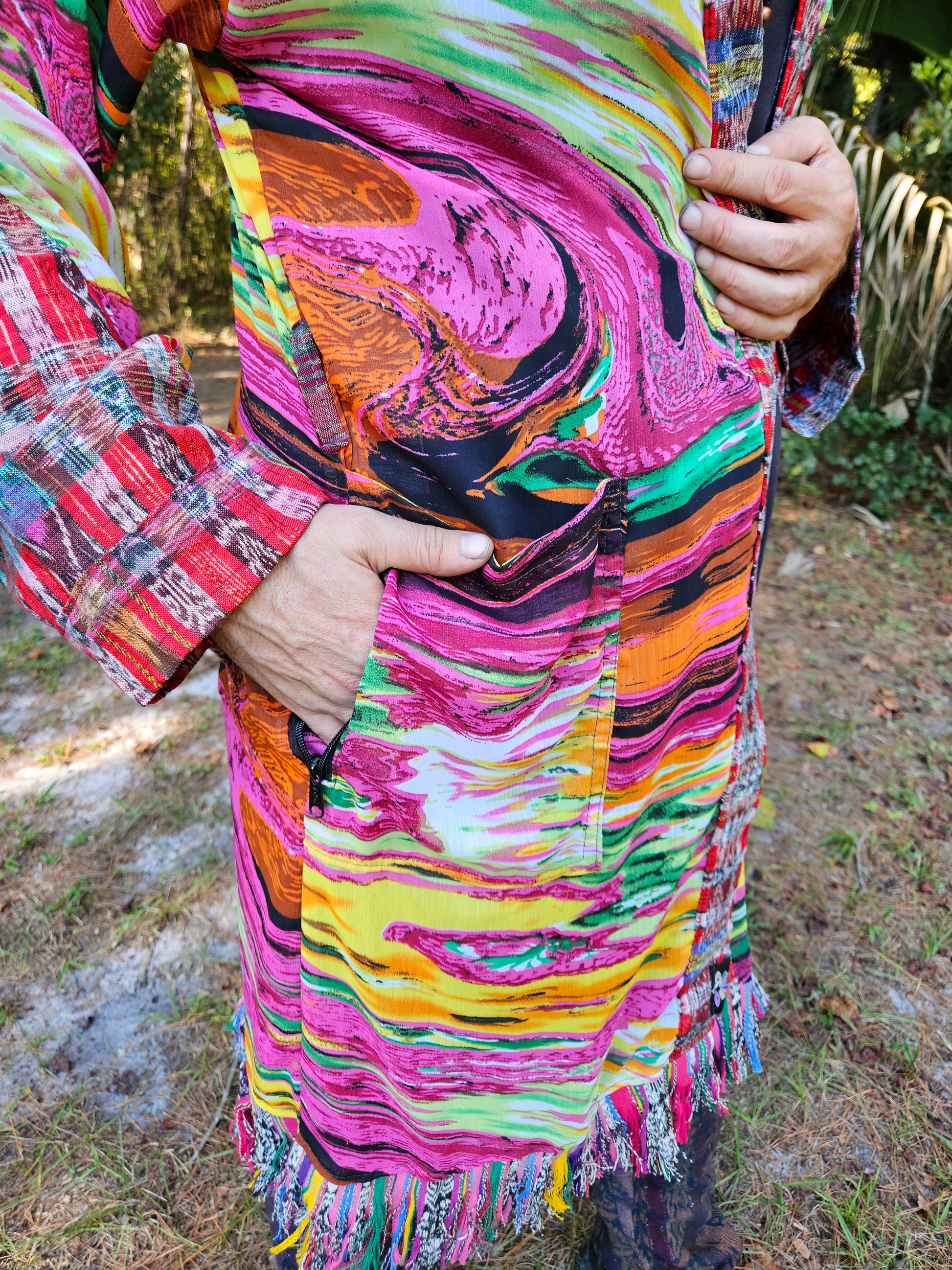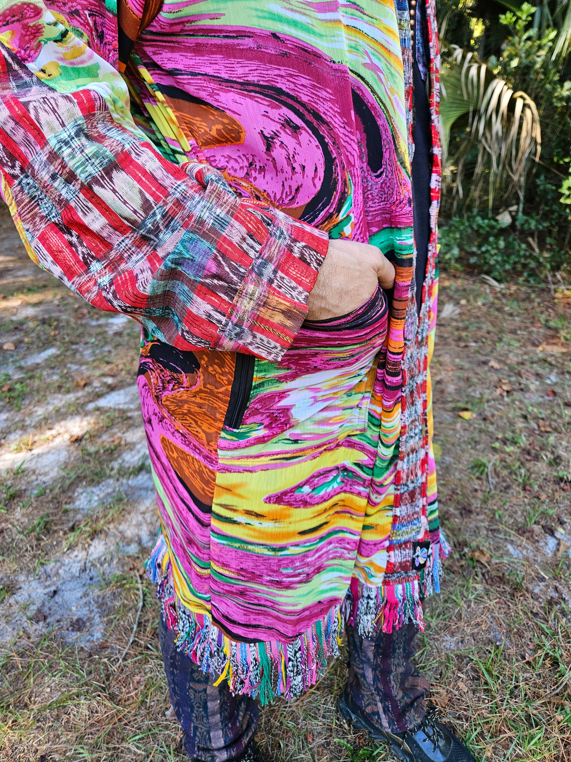 Funk Up Your Vibe & Liberate Your Fashion with this vibrant and flowy kimono by Moksha Moda. This one of a kind kimono is ethically crafted at Lake Atitlan Guatemala with beautiful upcycled hand woven Mayan fabrics for the detail and fringe with a vibrant breathable chiffon polyester print for the body. The kimono also features a removable belt. Plus keep your possessions secure with the four included pockets, two of which are zipper pockets.