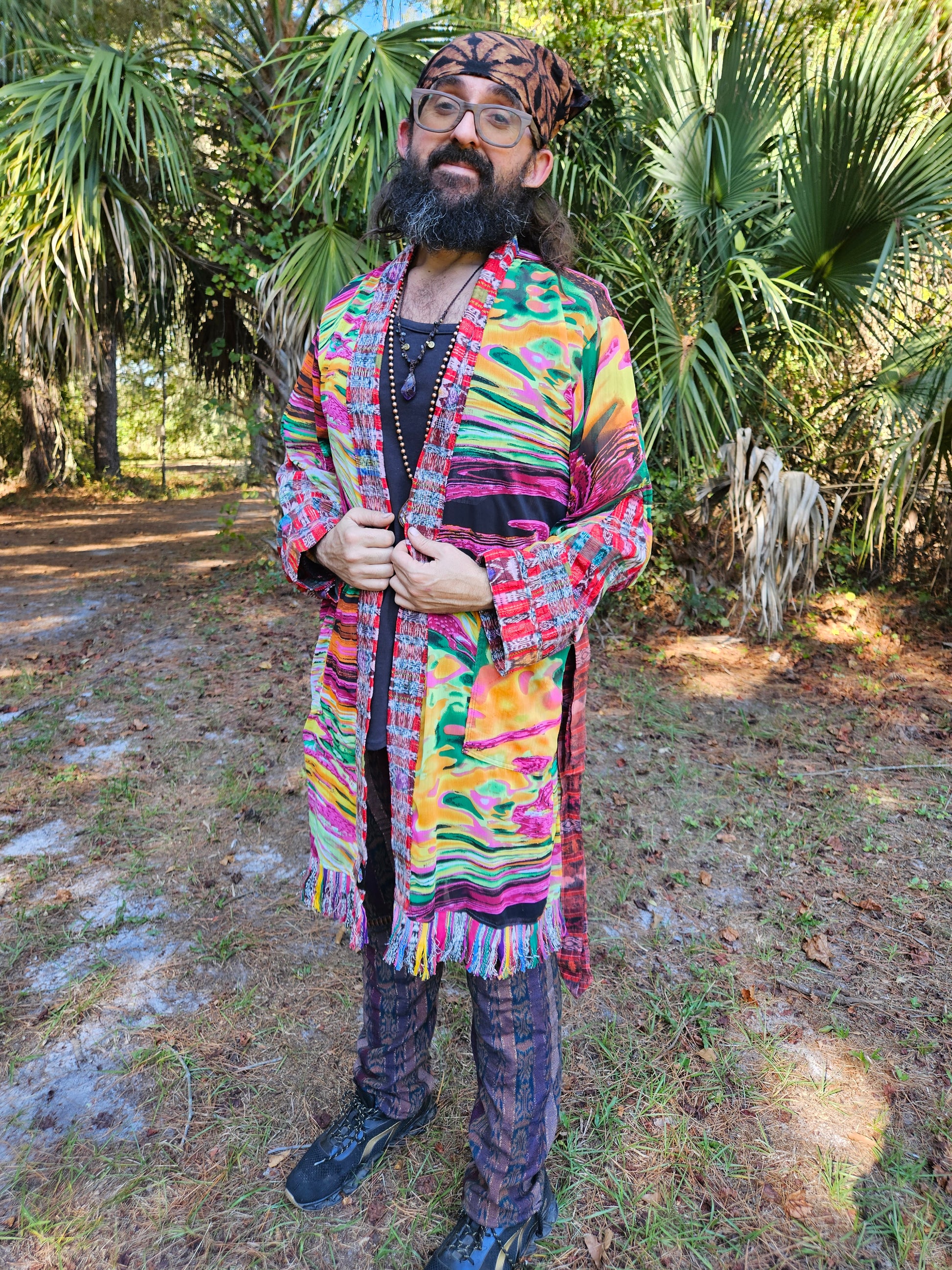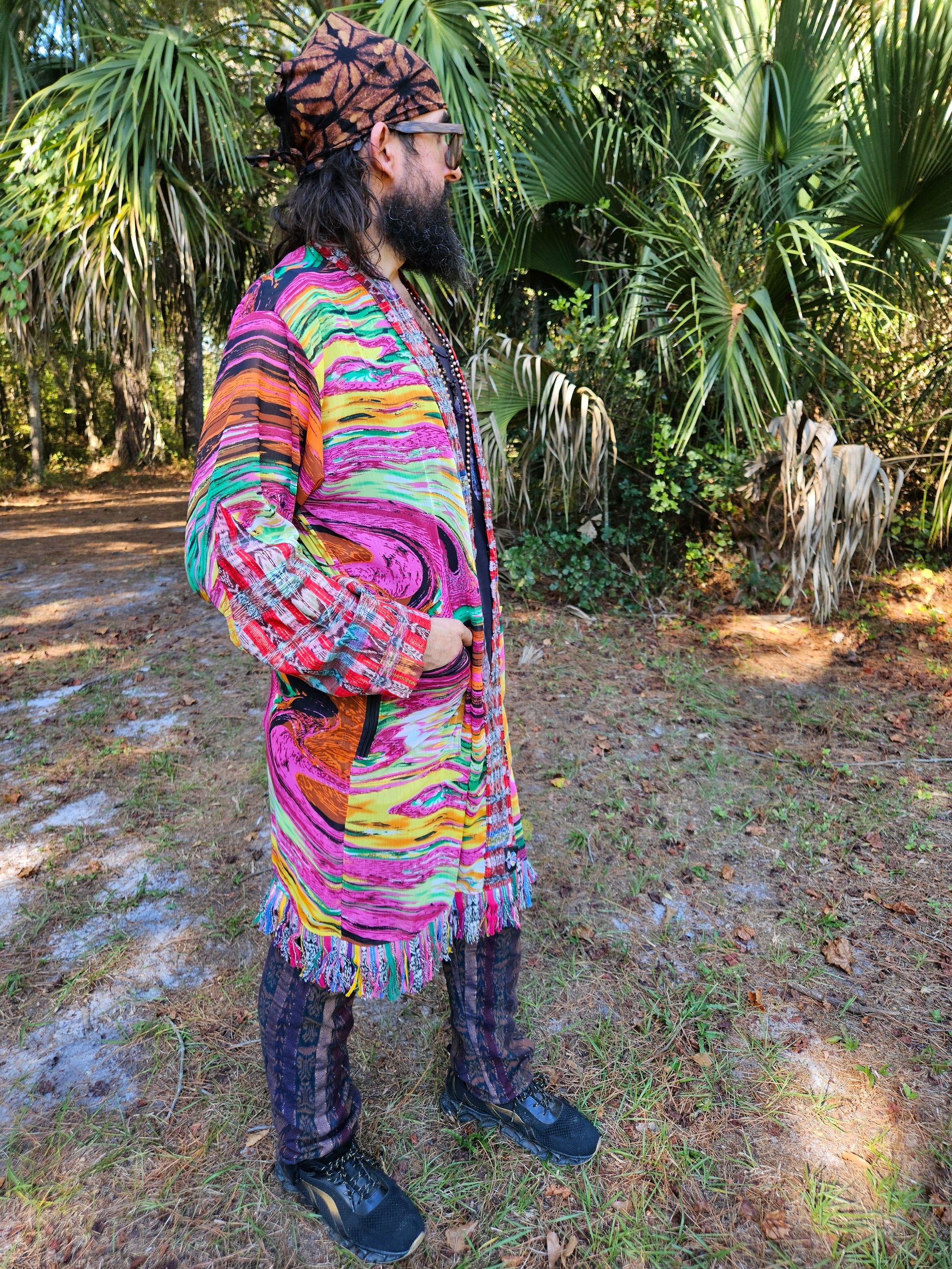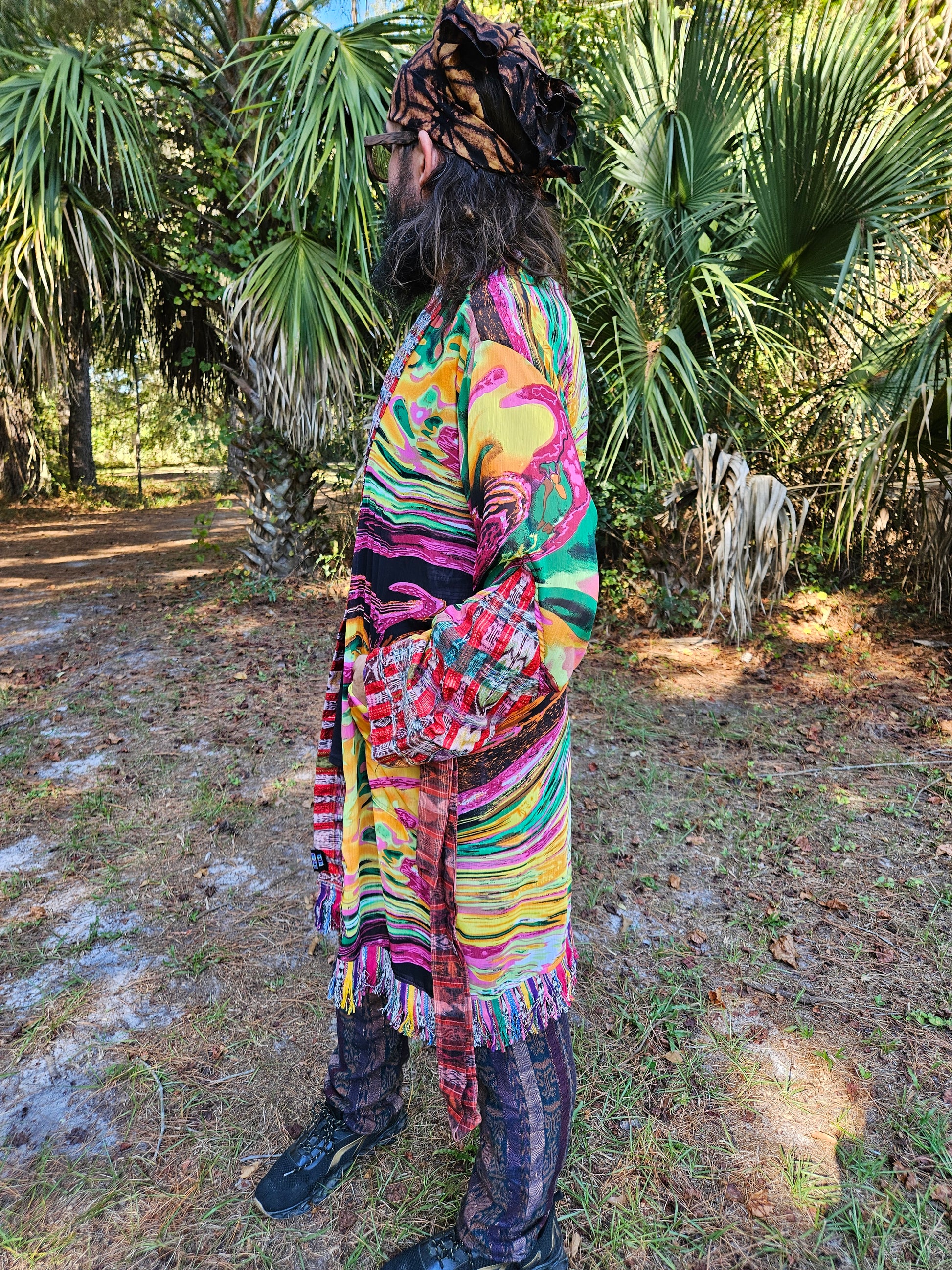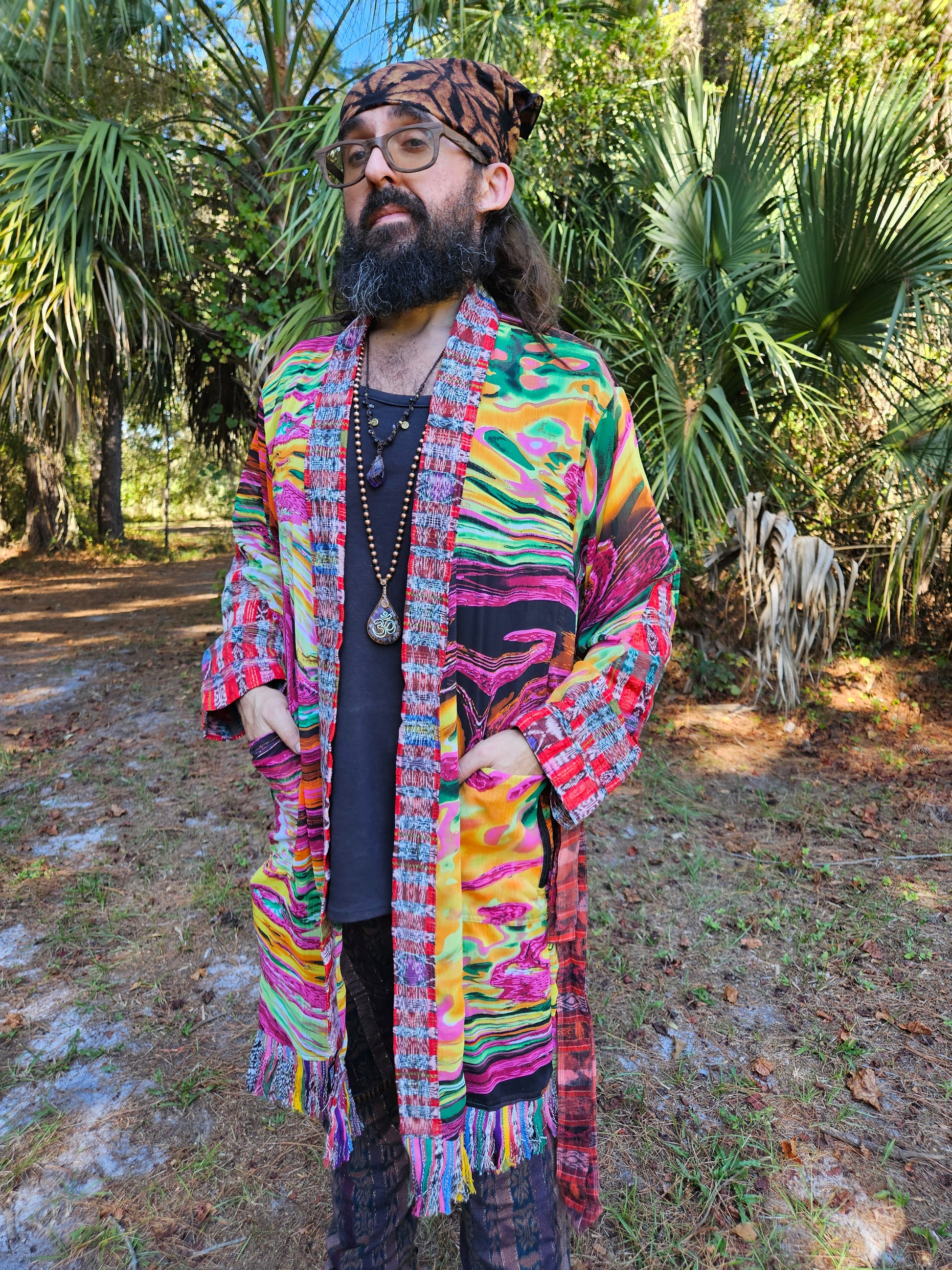 Funk Up Your Vibe & Liberate Your Fashion with this vibrant and flowy kimono by Moksha Moda. This one of a kind kimono is ethically crafted at Lake Atitlan Guatemala with beautiful upcycled hand woven Mayan fabrics for the detail and fringe with a vibrant breathable chiffon polyester print for the body. The kimono also features a removable belt. Plus keep your possessions secure with the four included pockets, two of which are zipper pockets.