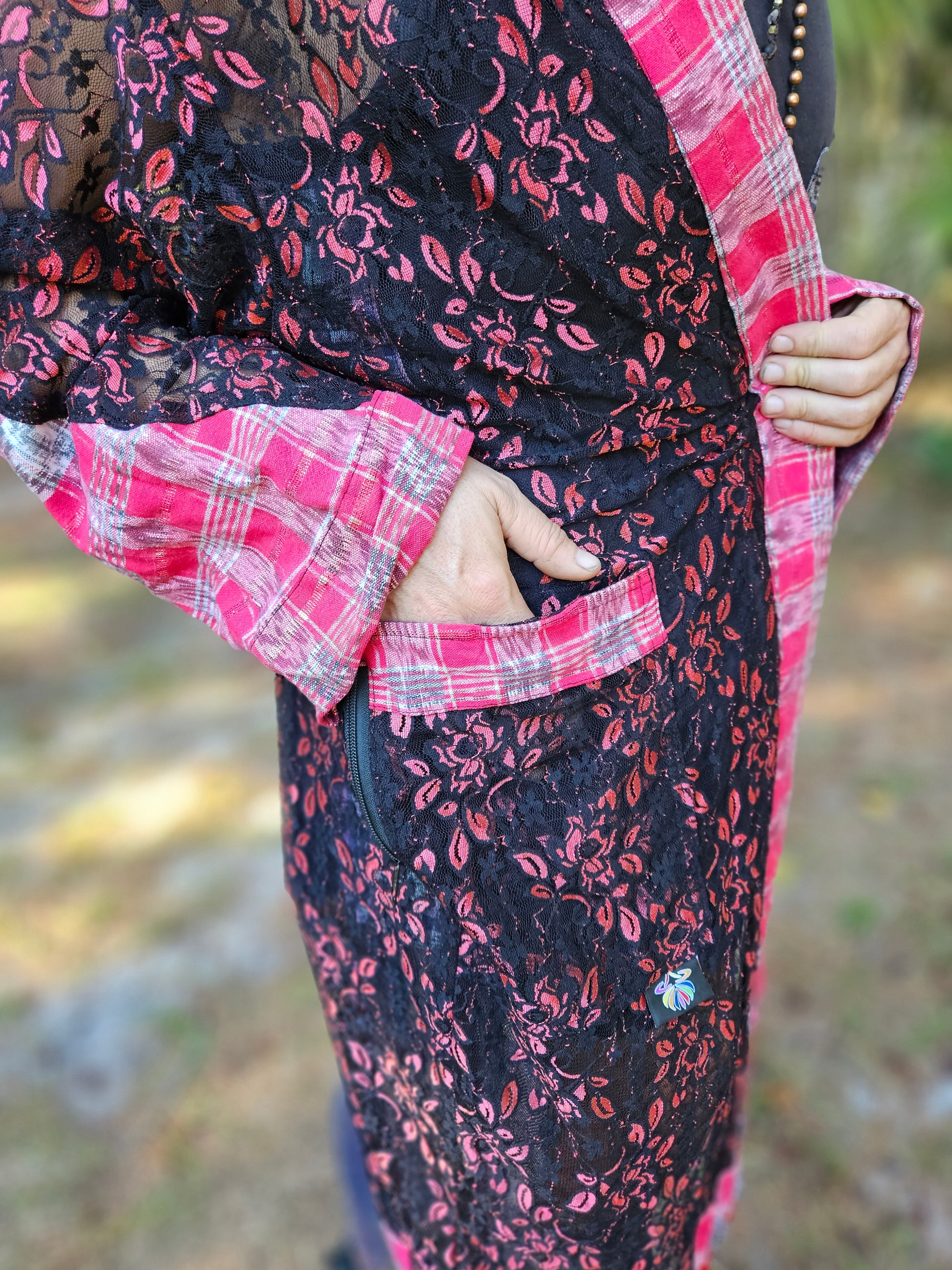 Funk Up Your Vibe & Liberate Your Fashion with this vibrant and flowy kimono by Moksha Moda. This one of a kind kimono is ethically crafted at Lake Atitlan Guatemala with beautiful upcycled hand woven Mayan fabrics for the detail and fringe with elegant two color breathable lace for the body. The kimono also features a removable belt. Plus keep your possessions secure with the four included pockets, two of which are zipper pockets.