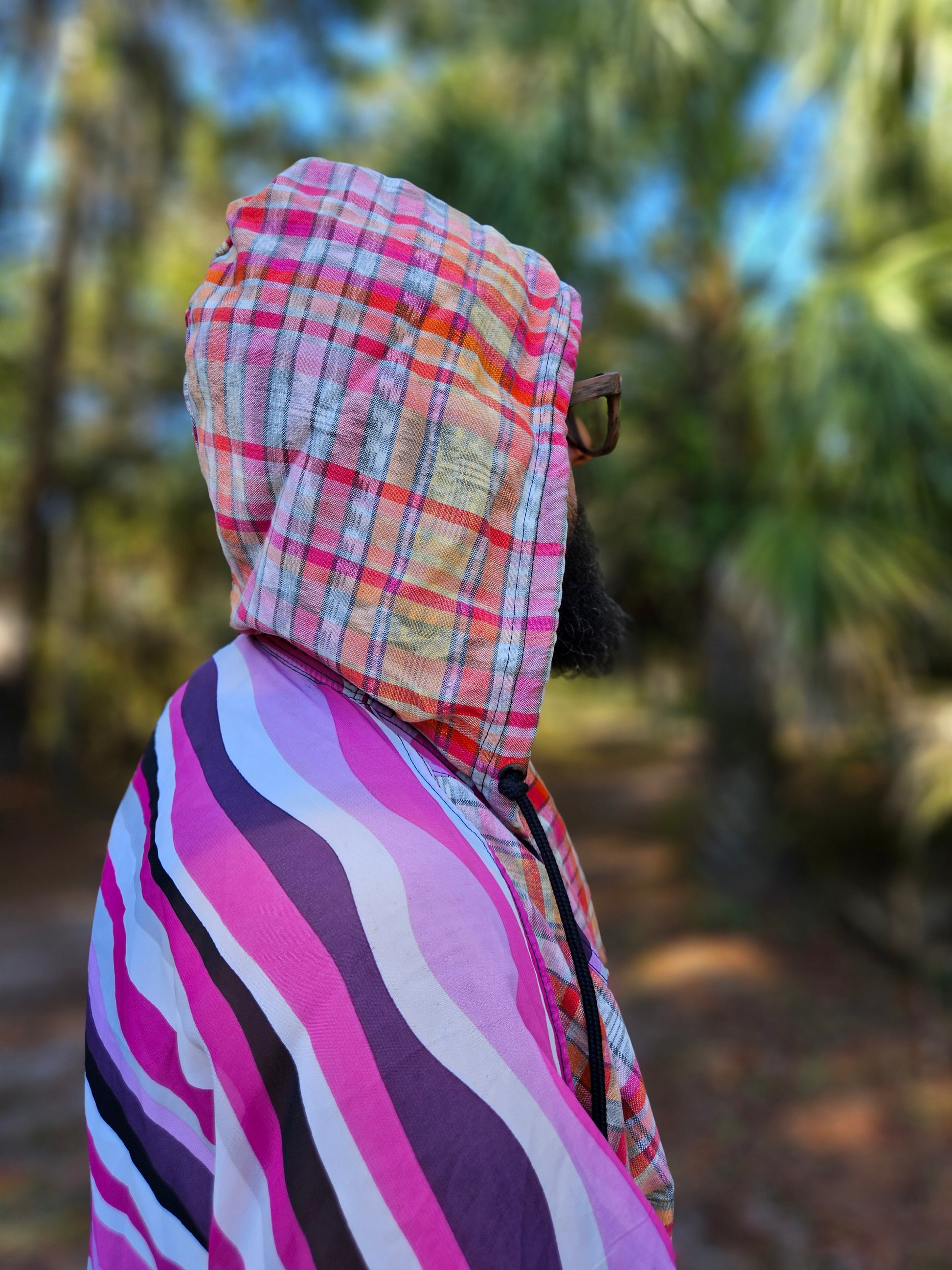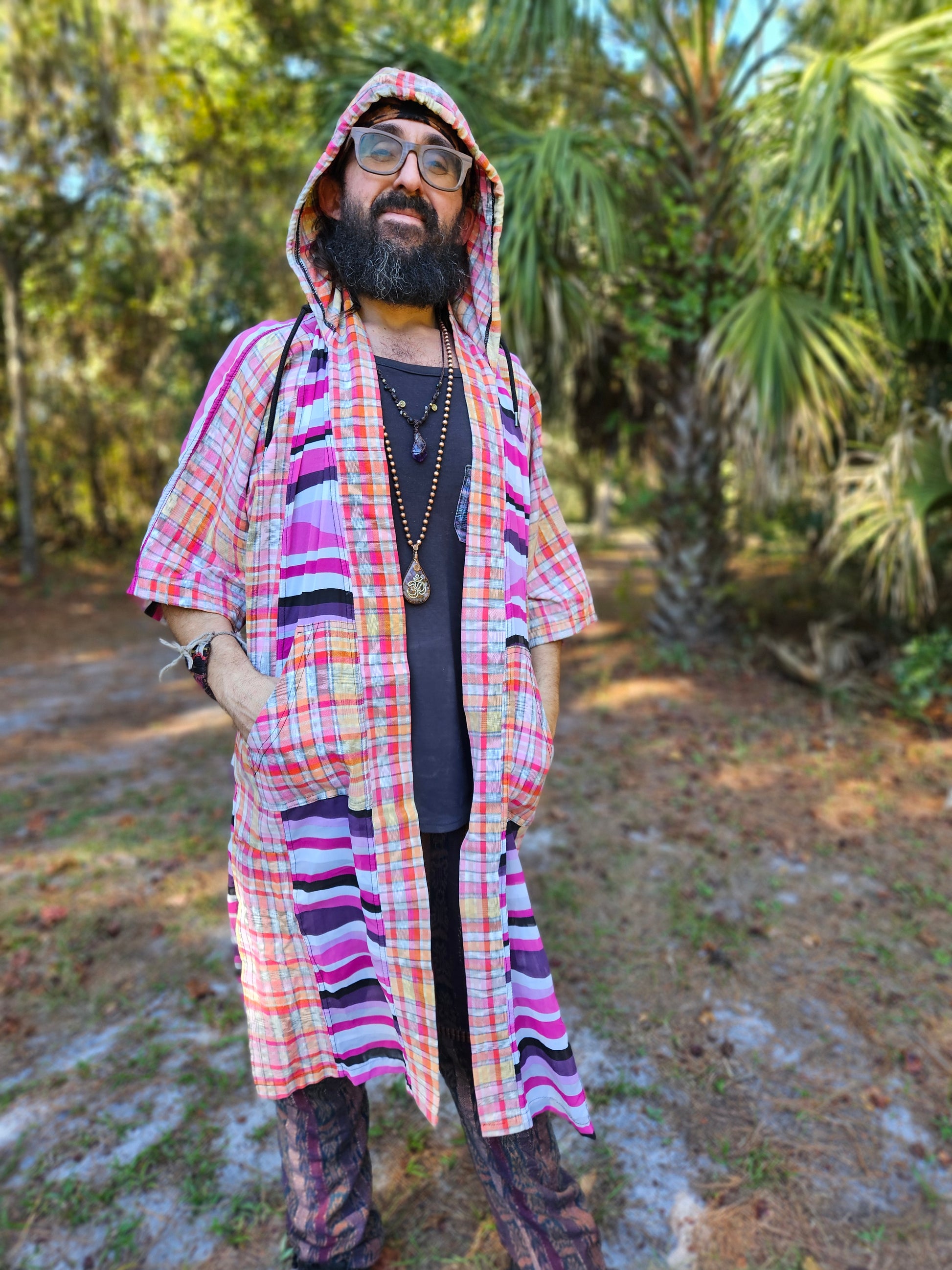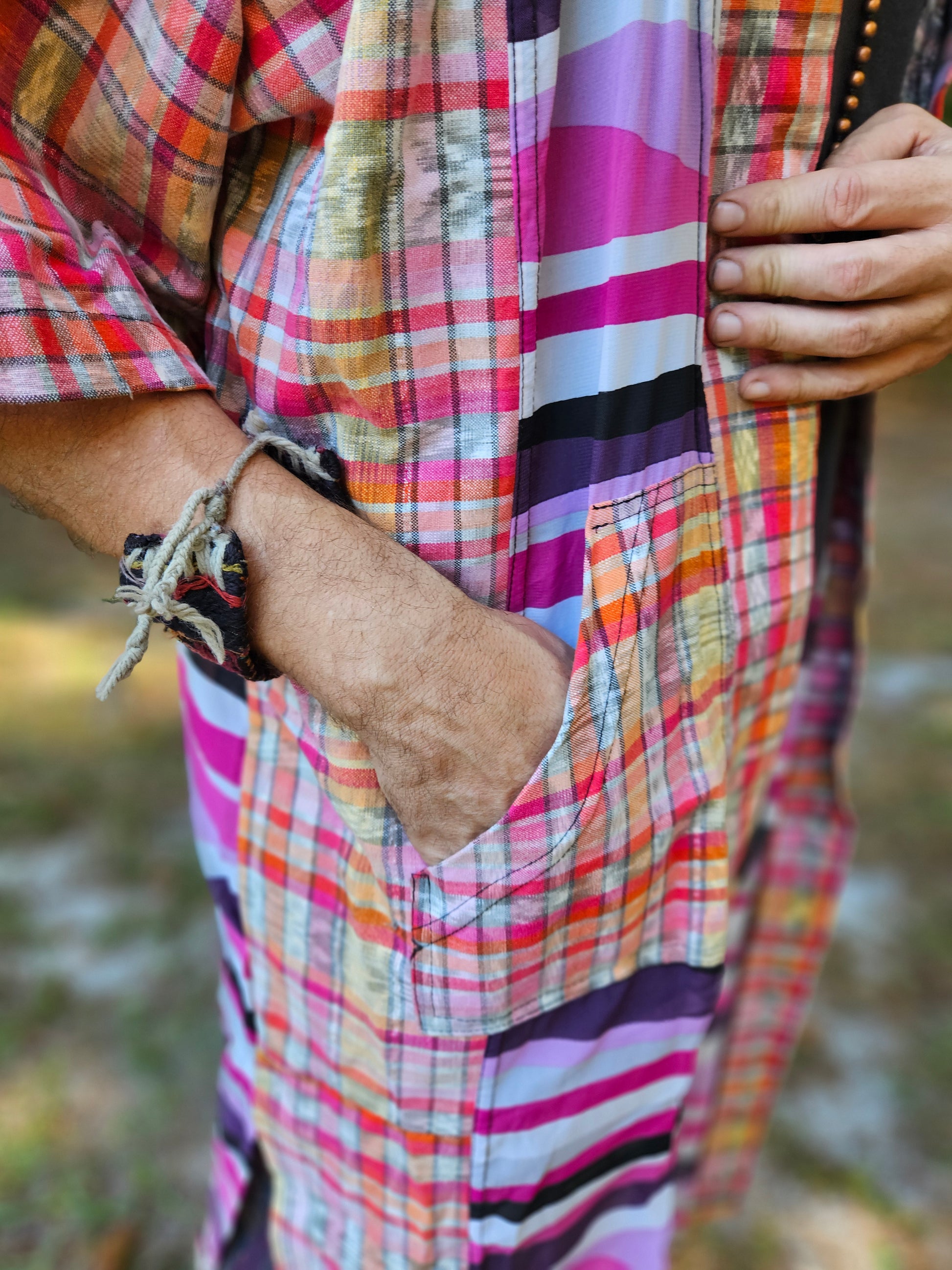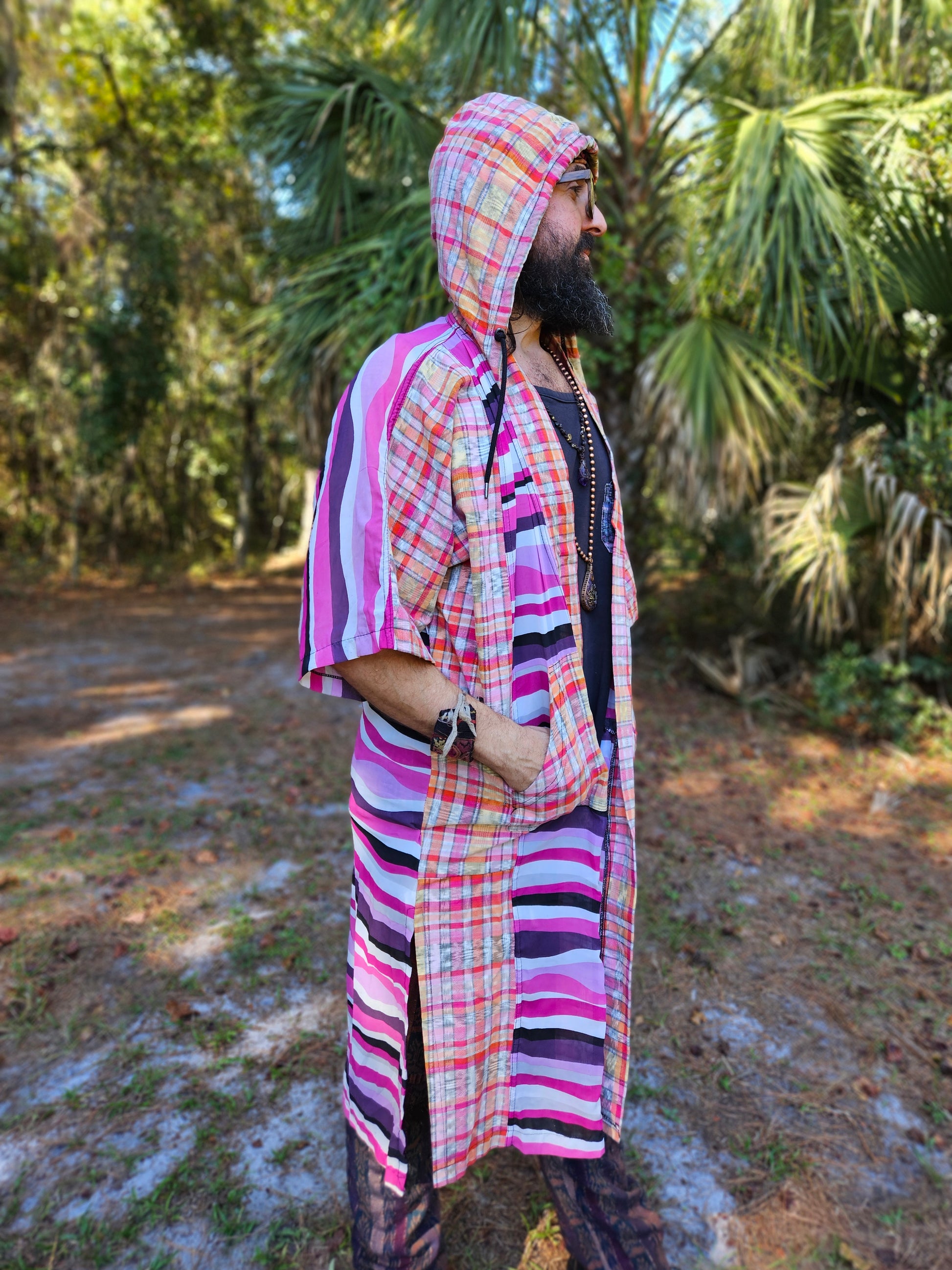 Funk up Your Vibe with this light weight kimono that is ethically crafted by INTO Textiles with beautiful upcycled hand woven Mayan fabrics from Guatemala. This one of a kind unisex kimono also features a hood and two pockets. One Size.