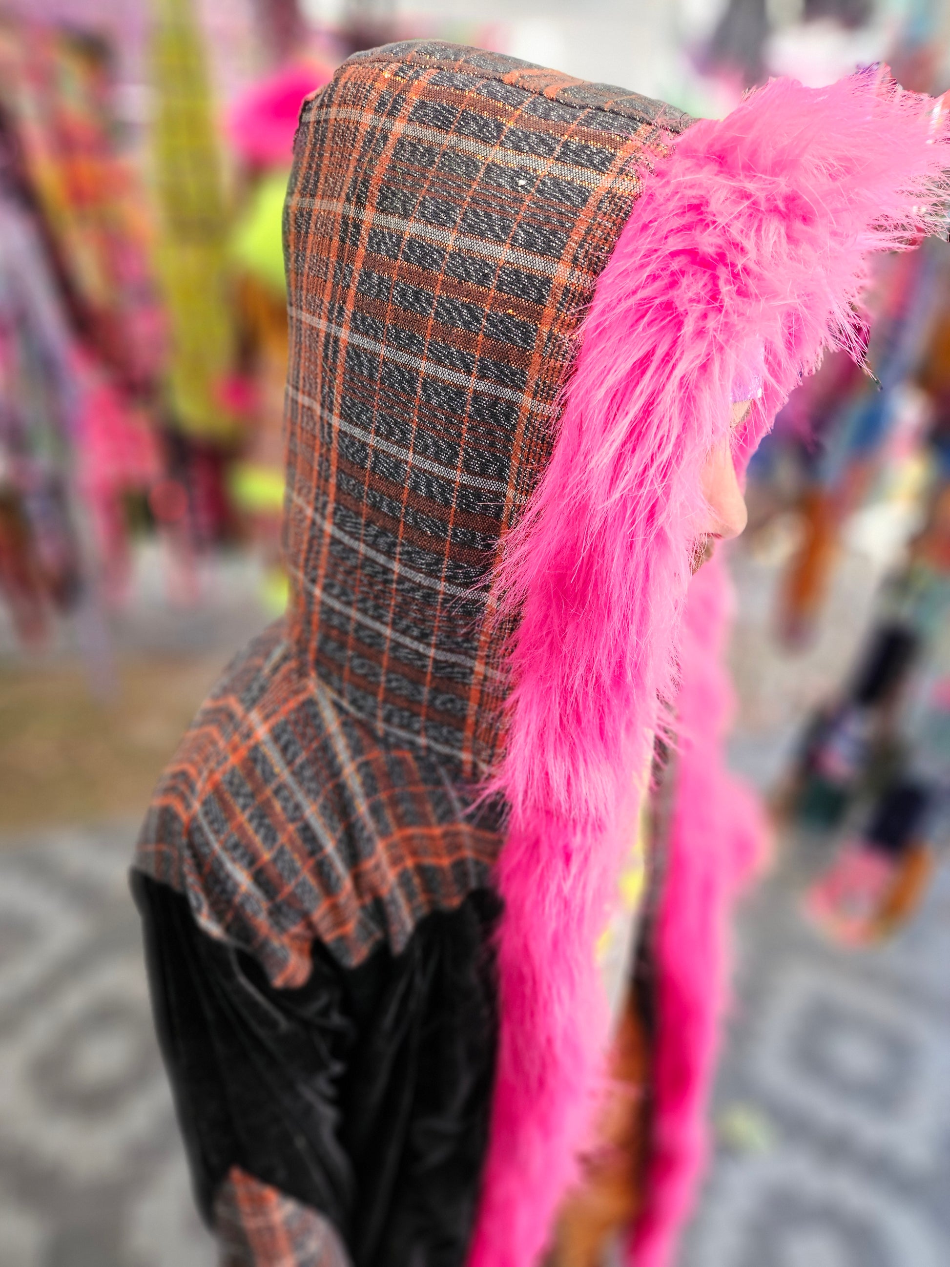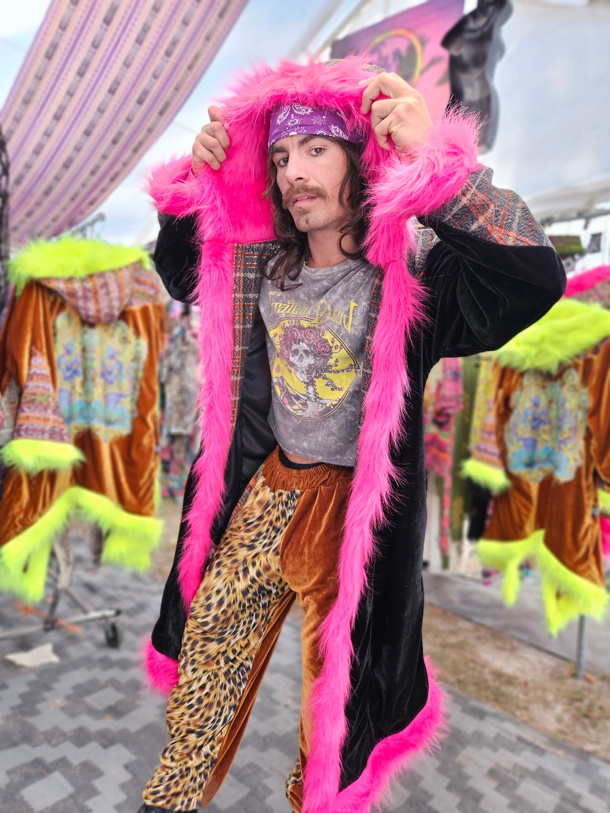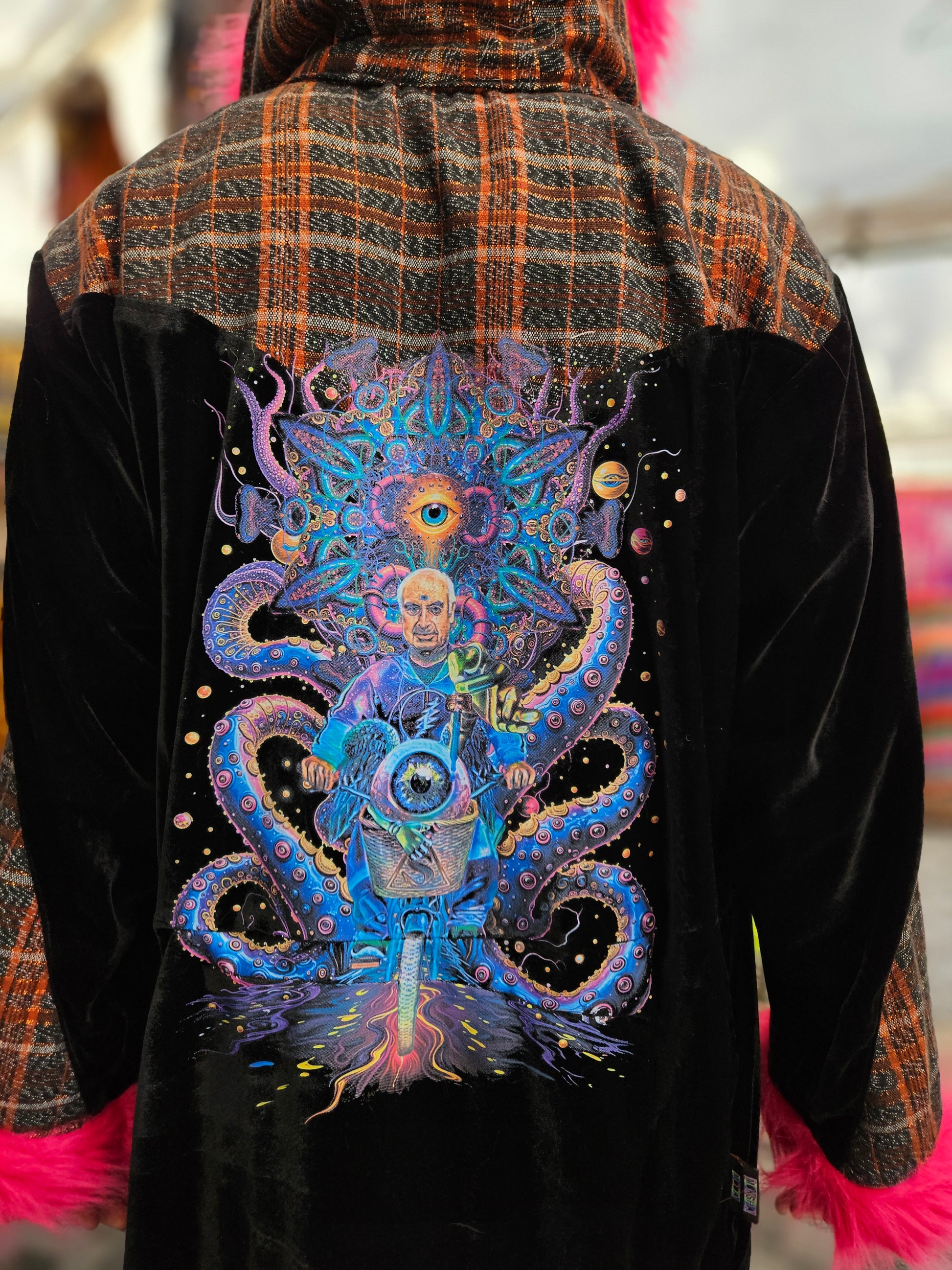 Liberate your journey and Funk up your Vibe with the latest collab Cloak by Moksha Moda and DimaYastronaut. This one-of-a-kind wearable work of art is ethically crafted in Guatemala with elegant velvet, wild faux fur, and cortes which are traditional hand-woven Mayan skirts sourced from second-hand markets in Guatemala. The back of the cloak features the incredible artwork of DimaYastronaut. Artwork that is compatible with the augmented reality app artivive.