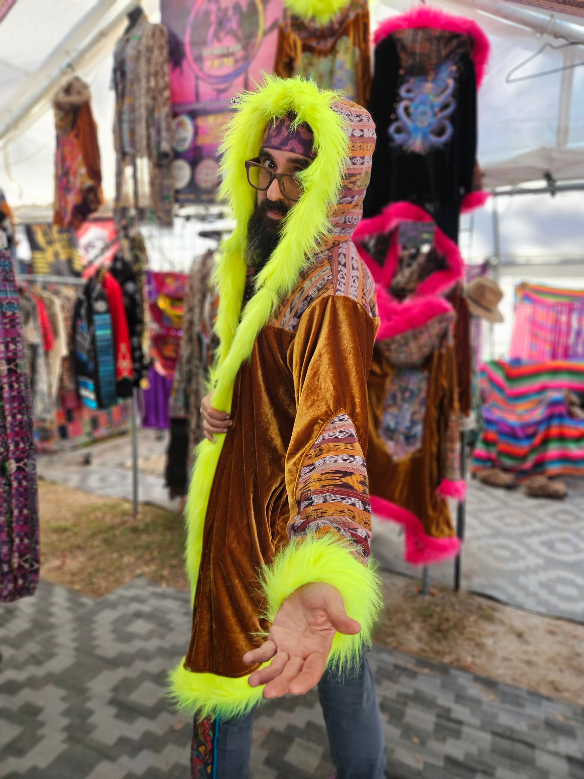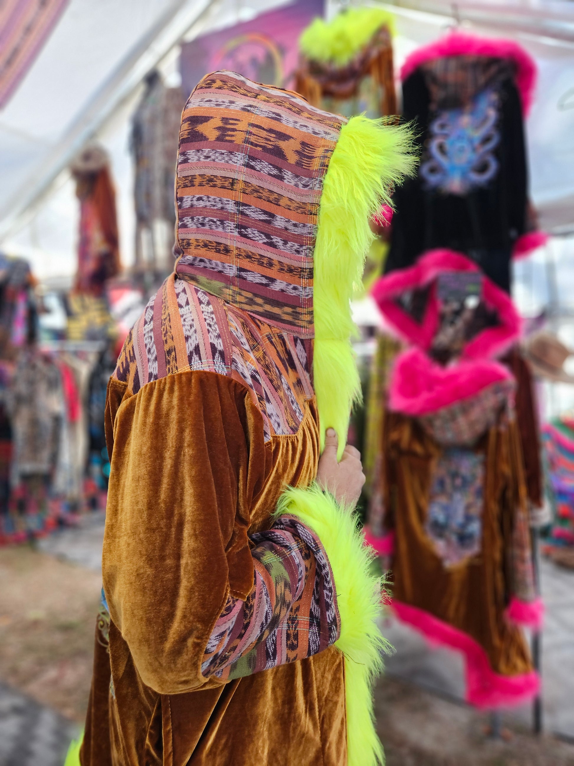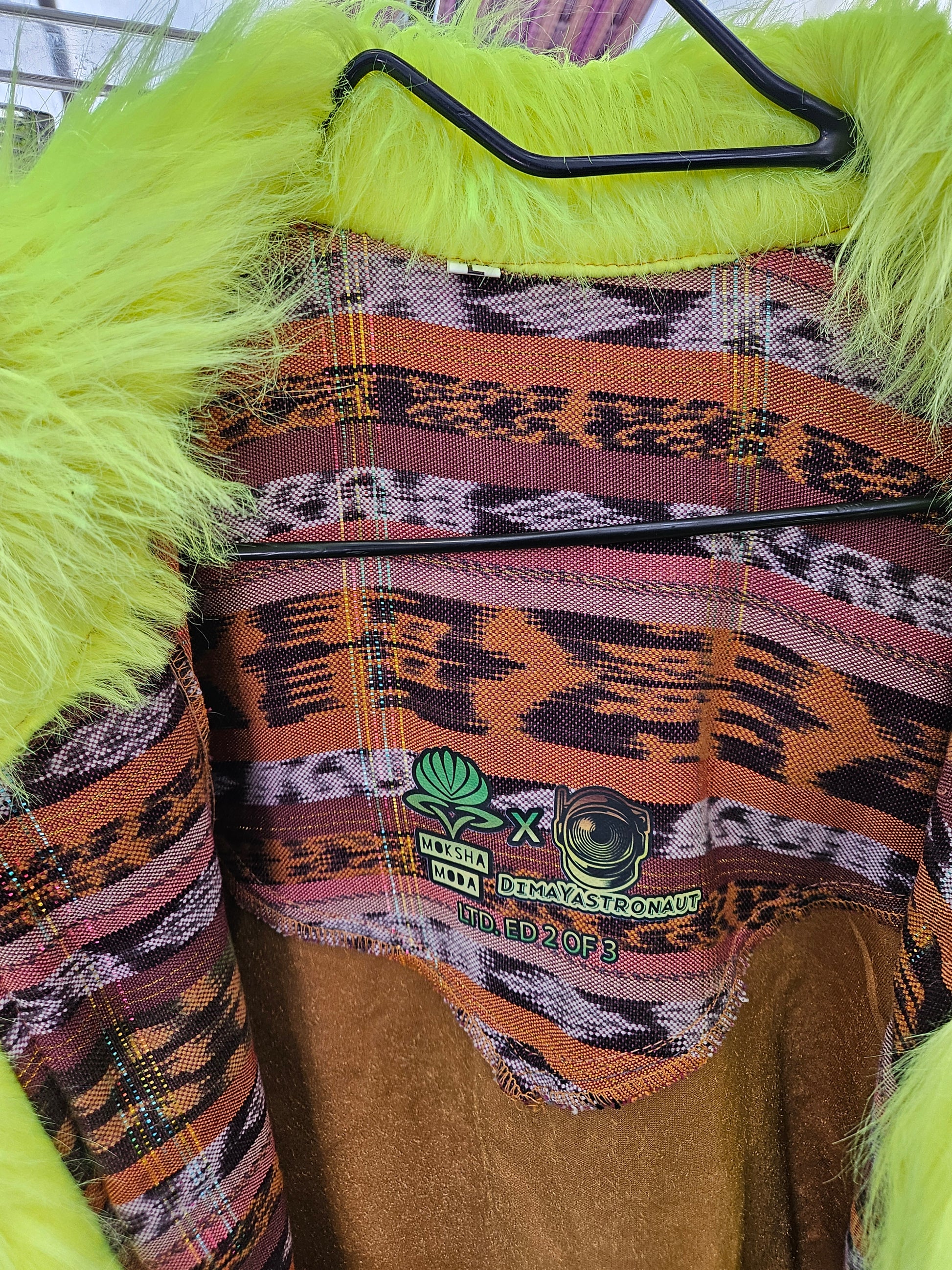 Liberate your journey and Funk up your Vibe with the latest collab Cloak by Moksha Moda and DimaYastronaut. This one-of-a-kind wearable work of art is ethically crafted in Guatemala with elegant velvet, wild faux fur, and cortes which are traditional hand-woven Mayan skirts sourced from second-hand markets in Guatemala. The back of the cloak features the incredible artwork of DimaYastronaut. Artwork that is compatible with the augmented reality app artivive.