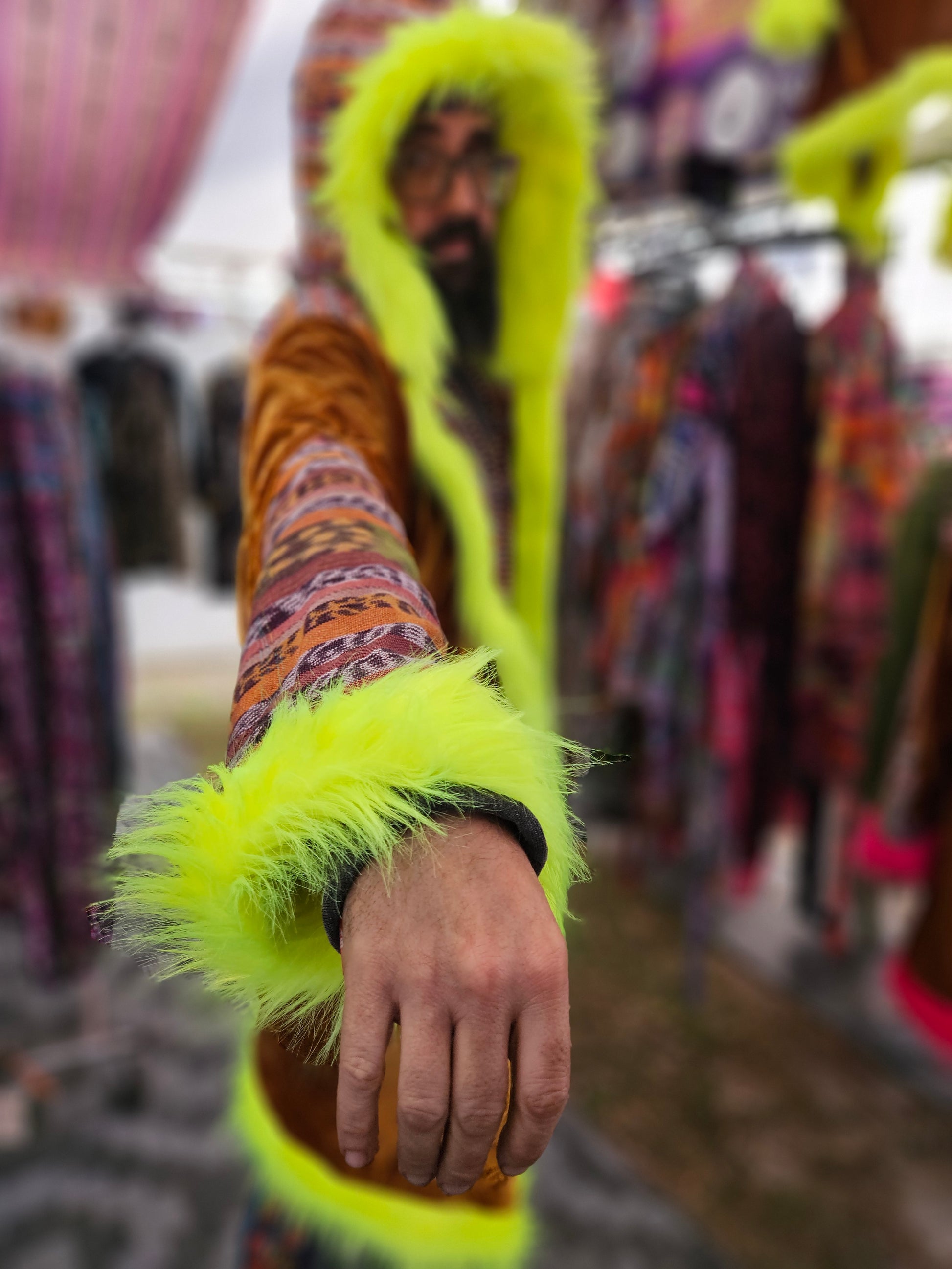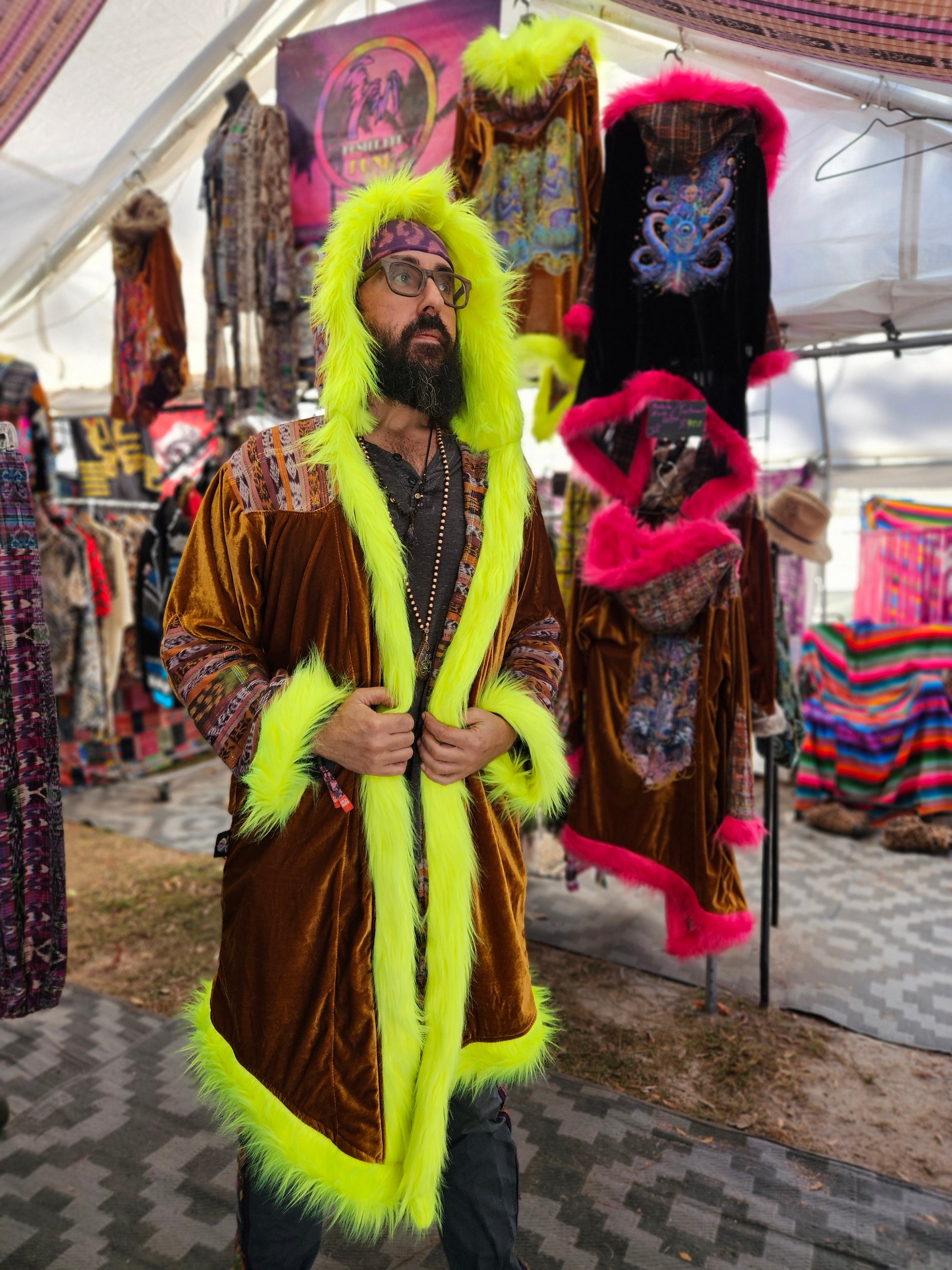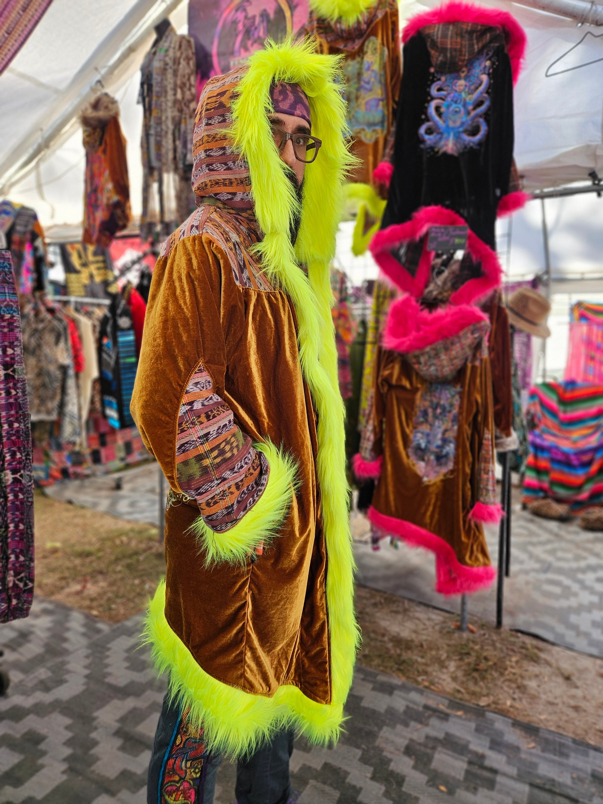 Liberate your journey and Funk up your Vibe with the latest collab Cloak by Moksha Moda and DimaYastronaut. This one-of-a-kind wearable work of art is ethically crafted in Guatemala with elegant velvet, wild faux fur, and cortes which are traditional hand-woven Mayan skirts sourced from second-hand markets in Guatemala. The back of the cloak features the incredible artwork of DimaYastronaut. Artwork that is compatible with the augmented reality app artivive.