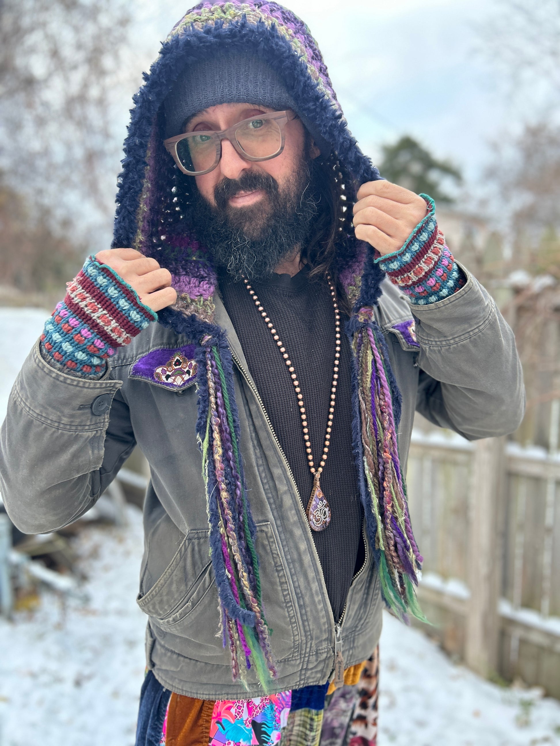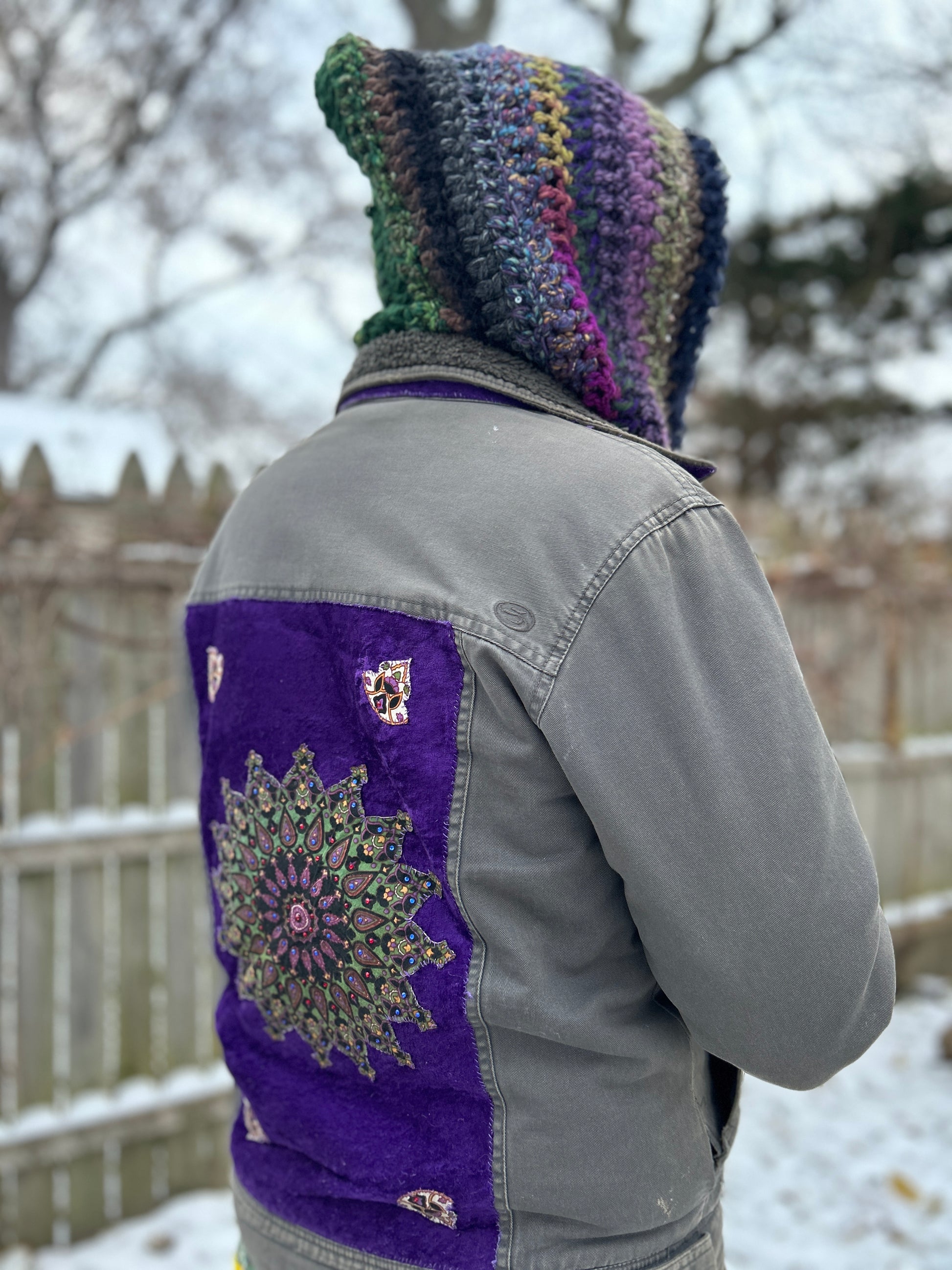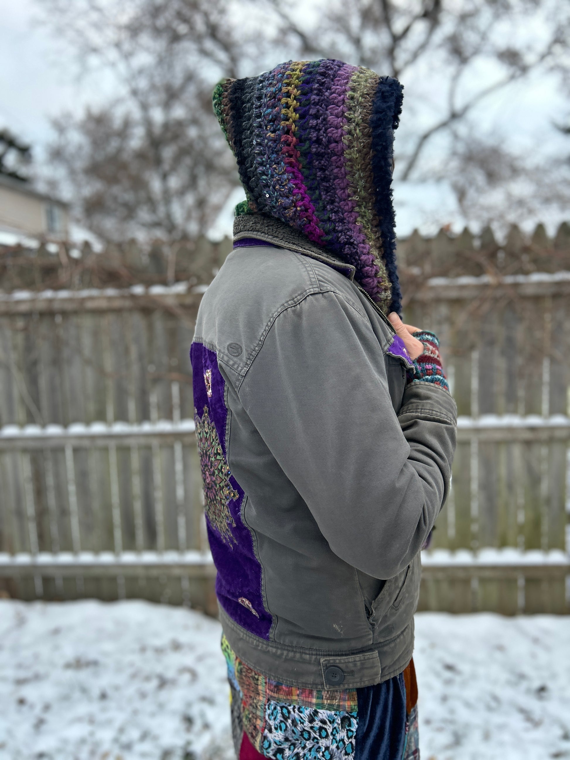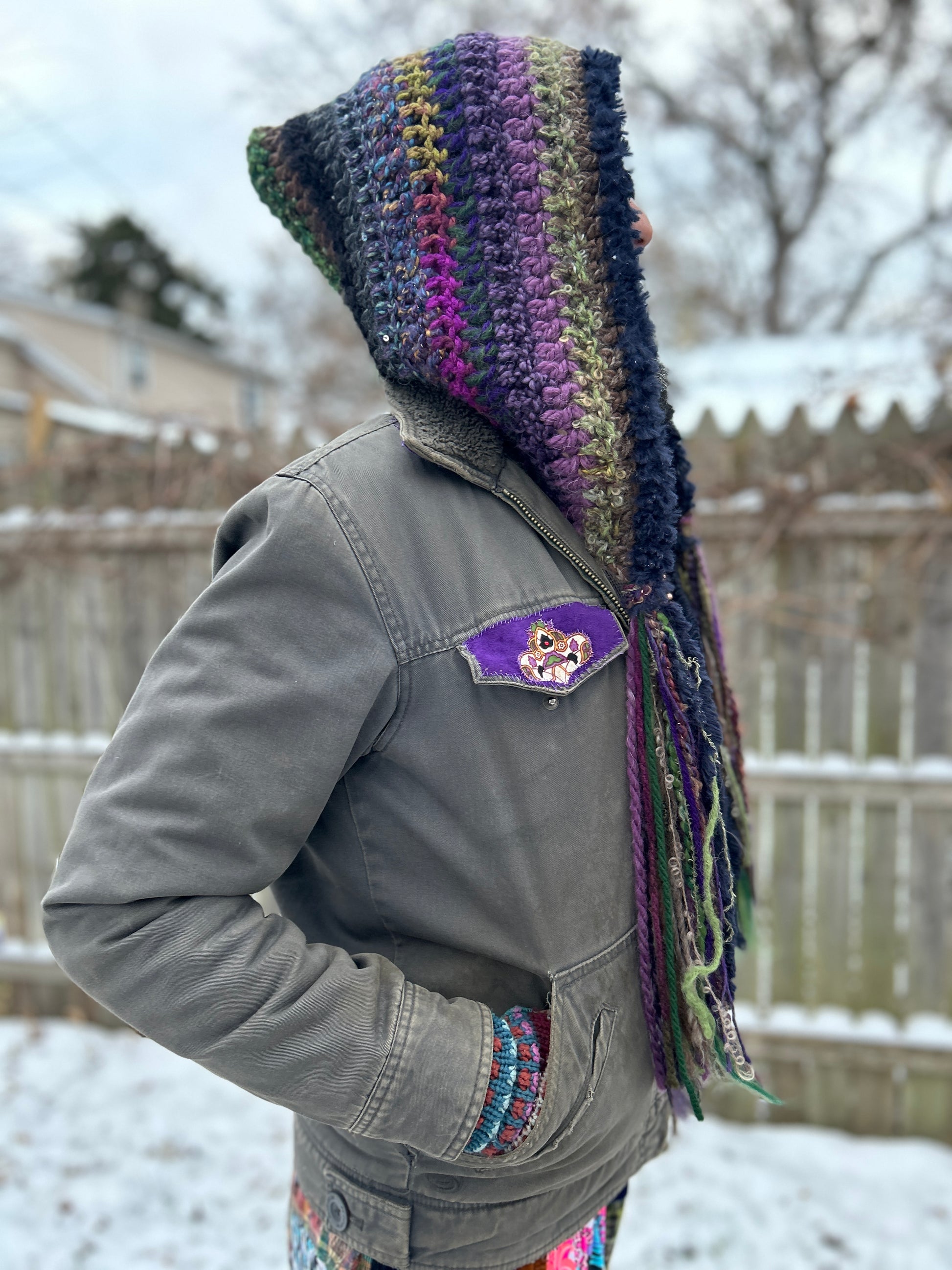 This crochet hood is another popular design at Hostel del Funk, made by featured designer Starlily Creations. It’s a cozy hood made with many different textured yarns (acrylic/wool/novelty yarn) so each one made is truly one of a kind!
