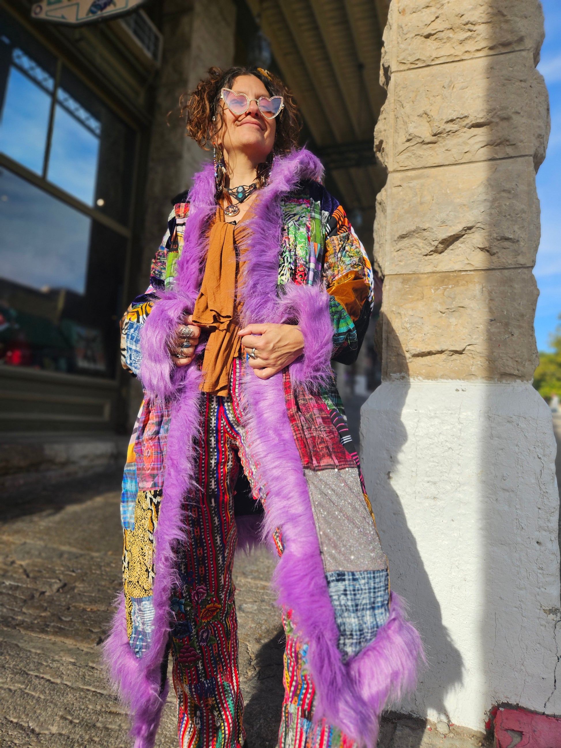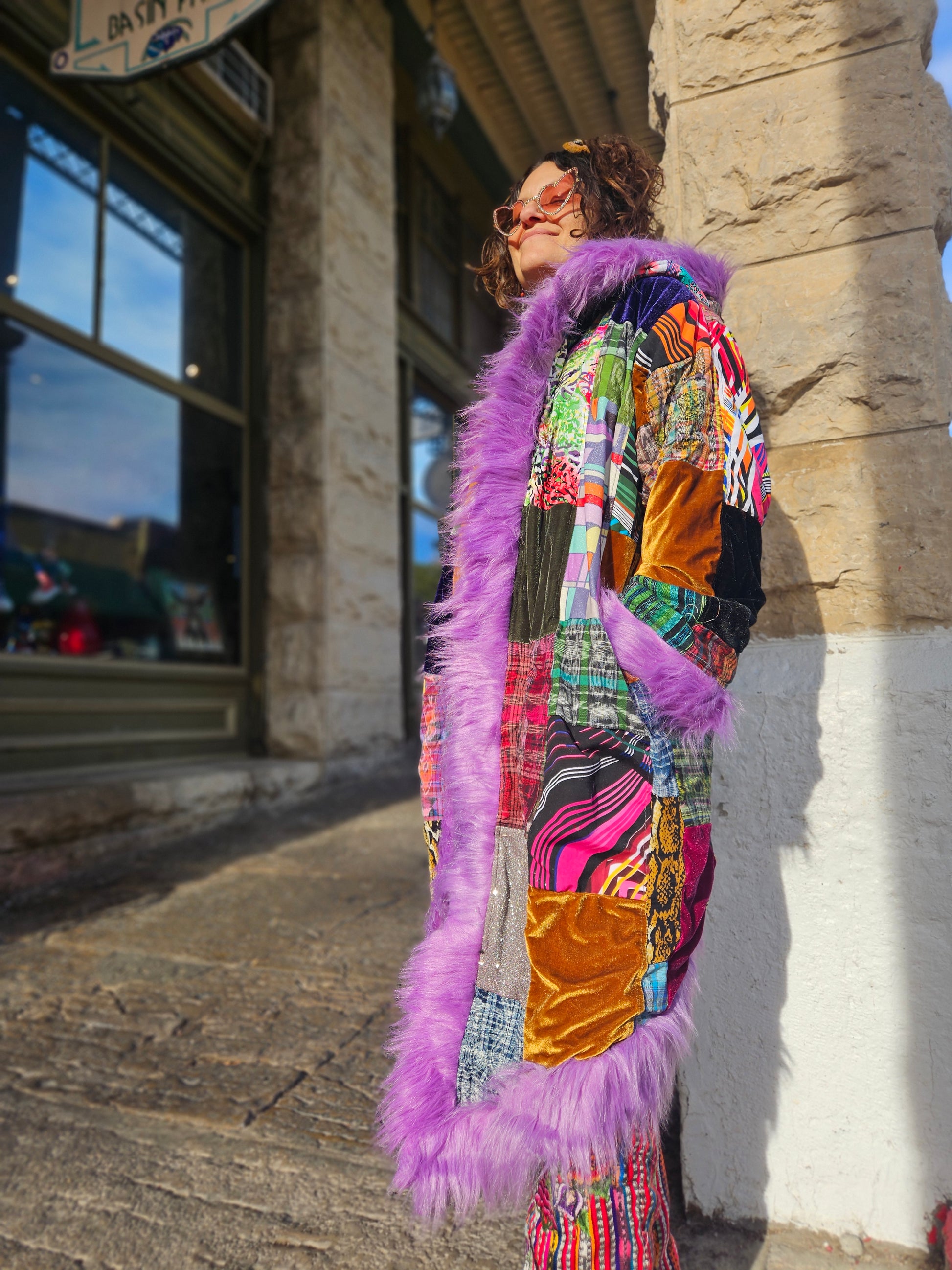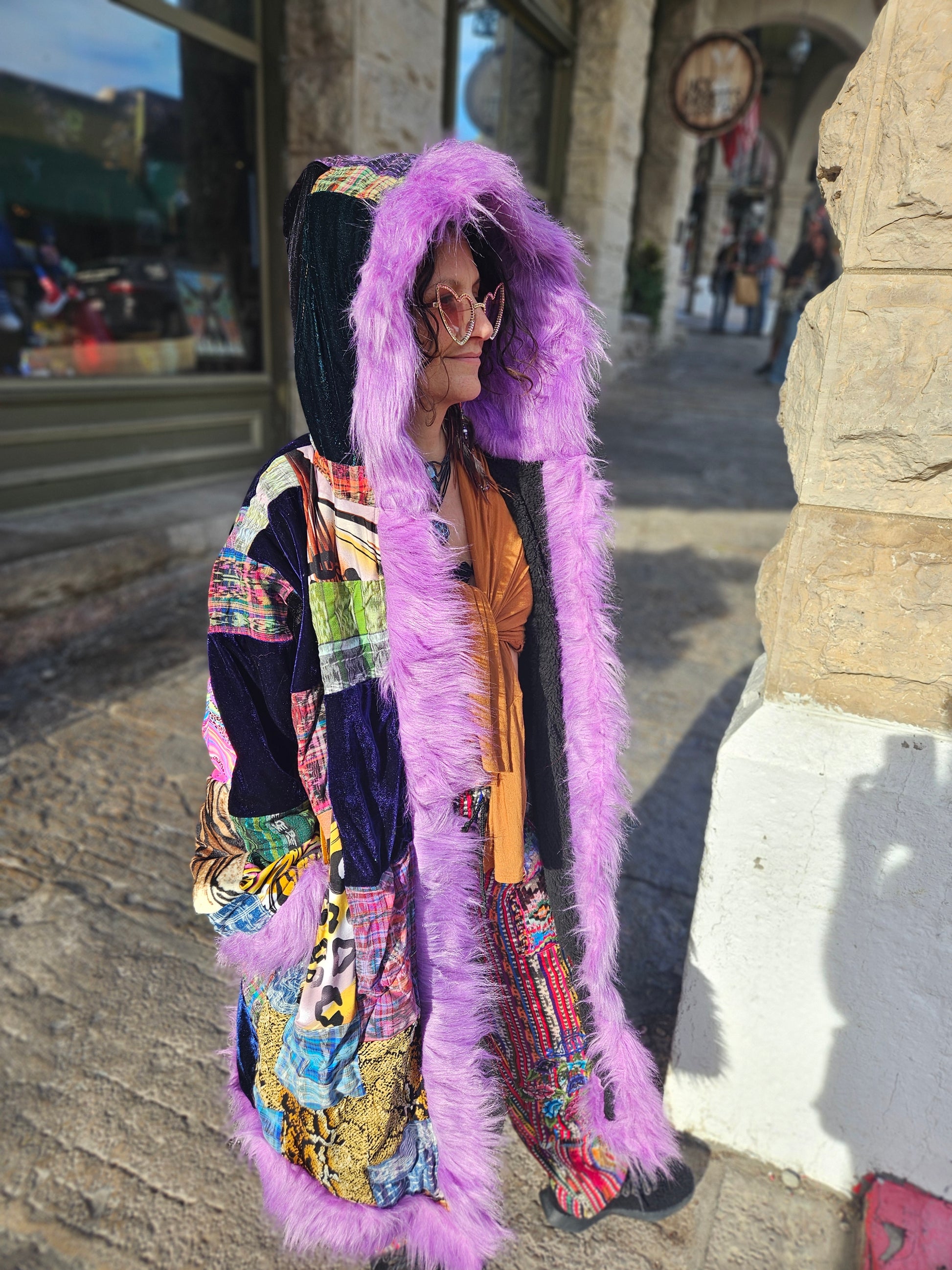 Liberate your journey and Funk up your Vibe with the latest Patchwork Cloak by Moksha Moda. This one-of-a-kind wearable work of art is ethically crafted in Guatemala with the scraps of the different collections that have been crafted over the past few years by the team of Moksha Moda. Textiles included in this patchwork cloak are upcycled fabrics from traditional hand-woven Mayan skirts sourced from second-hand markets in Guatemala, polyester prints, and velvet. The cloak includes three pockets, is fleece lined, and has a wild faux fur hood.