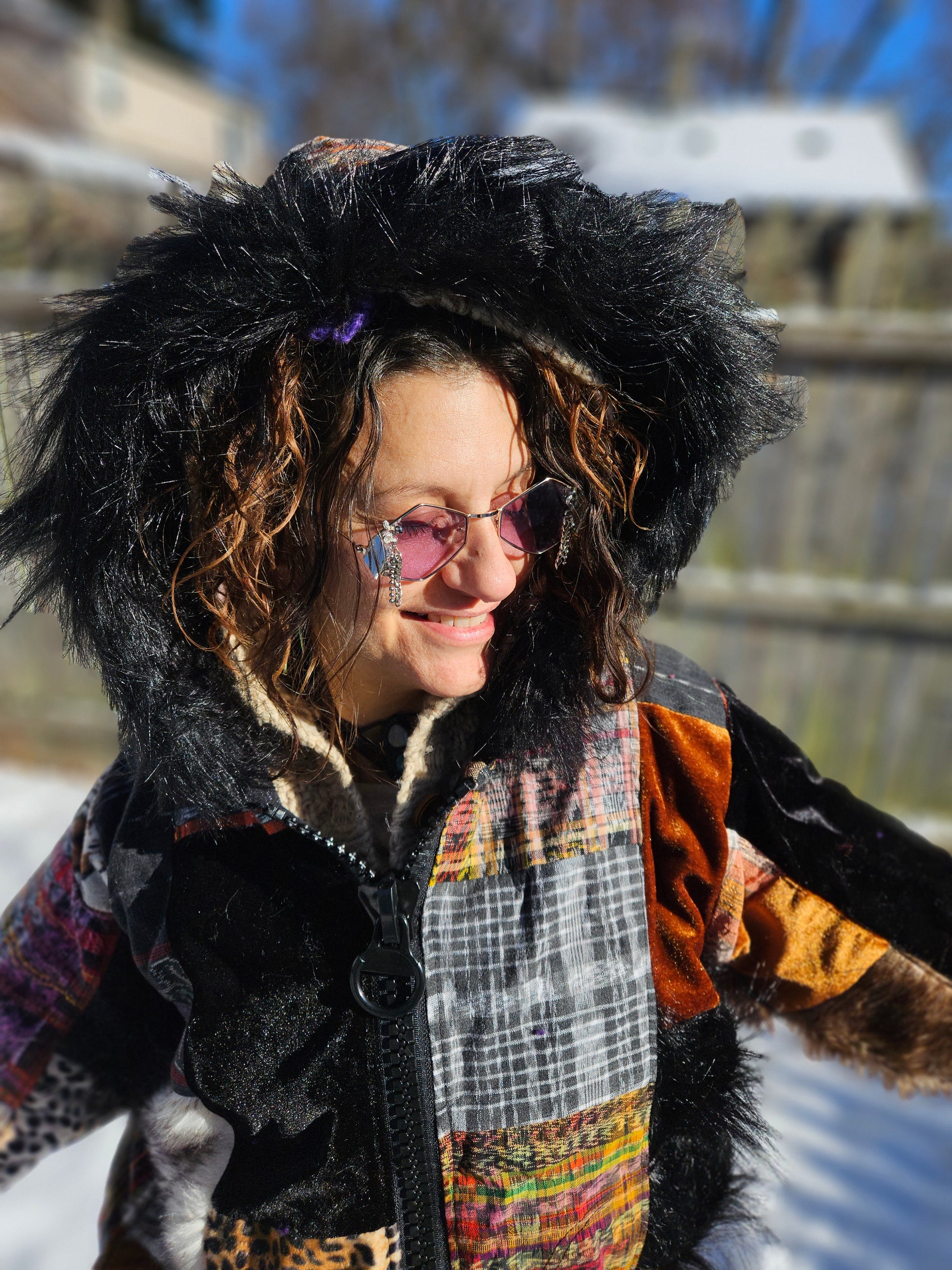 Liberate your journey and Funk up your Vibe with the latest Patchwork Jacket by Moksha Moda. This one-of-a-kind wearable work of art is ethically crafted in Guatemala with the scraps of the different collections that have been crafted over the past few years by the team of Moksha Moda. Textiles included in this patchwork cloak are beautiful upcycled fabrics from traditional hand-woven Mayan skirts sourced from second-hand markets in Guatemala, wild polyester prints, luxurious faux fur, and elegant velvet. The jacket includes three pockets including an inside zipper pocket, is fleece lined, elastic waist, thumb holes in the cuffs, a ridiculous large zipper, and has a wild faux fur hood.