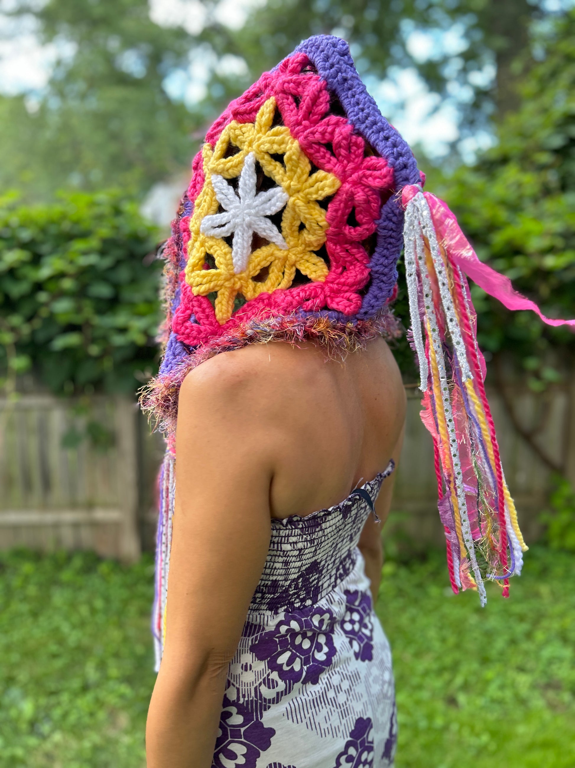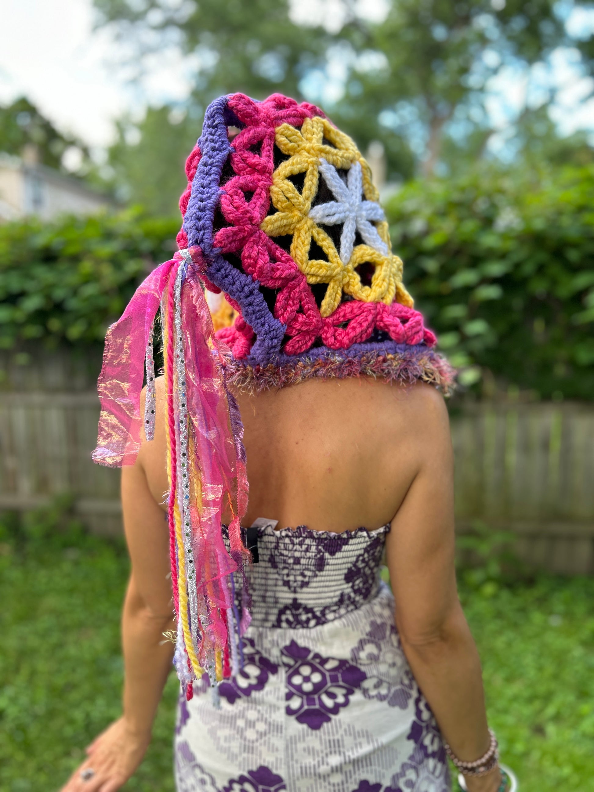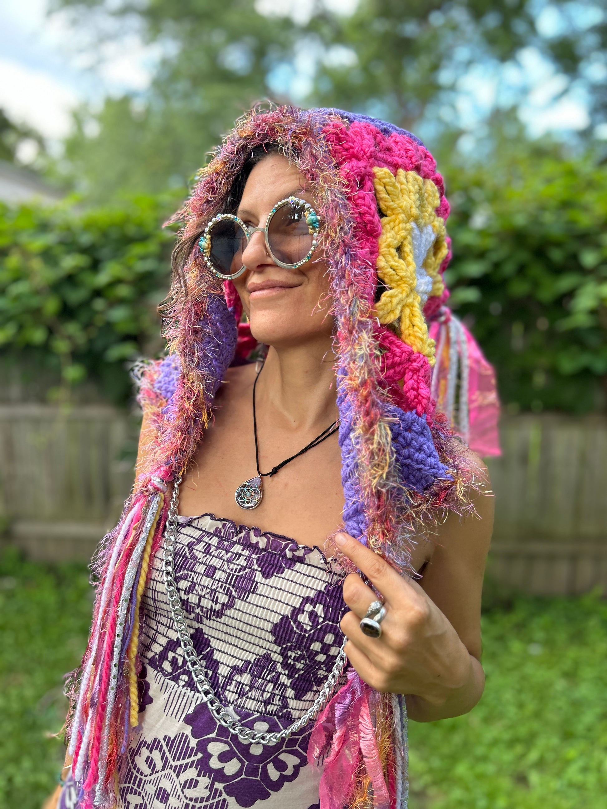 This Flower of Life hood is a mix of really fun colors, it has silver metallic accent fabric on the tassels and a silver chain embellishment. Made of acrylic blend yarn and a variety of novelty /faux fur yarn for the trim. I have a couple other hoods available on the site if you want to see a few more options that are currently available! This hood fits all sizes as it has a pretty forgiving loose fit :)